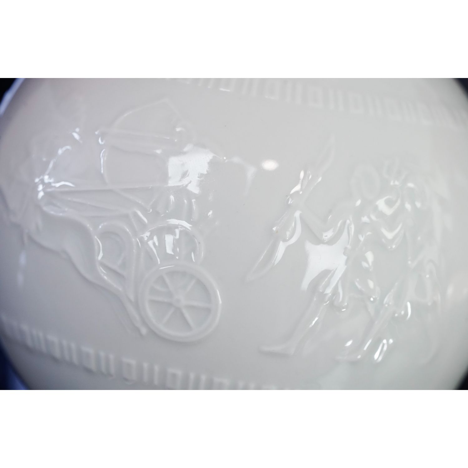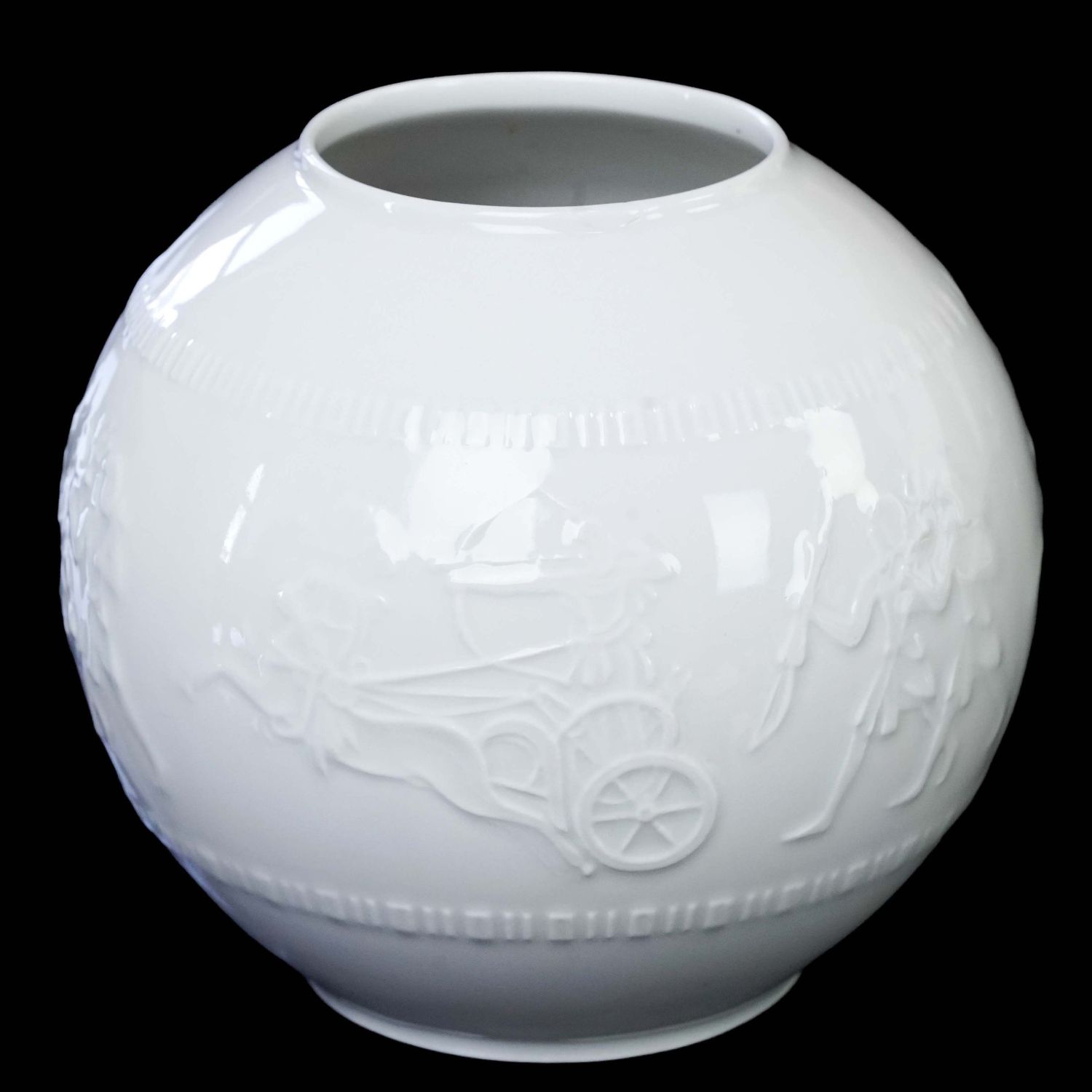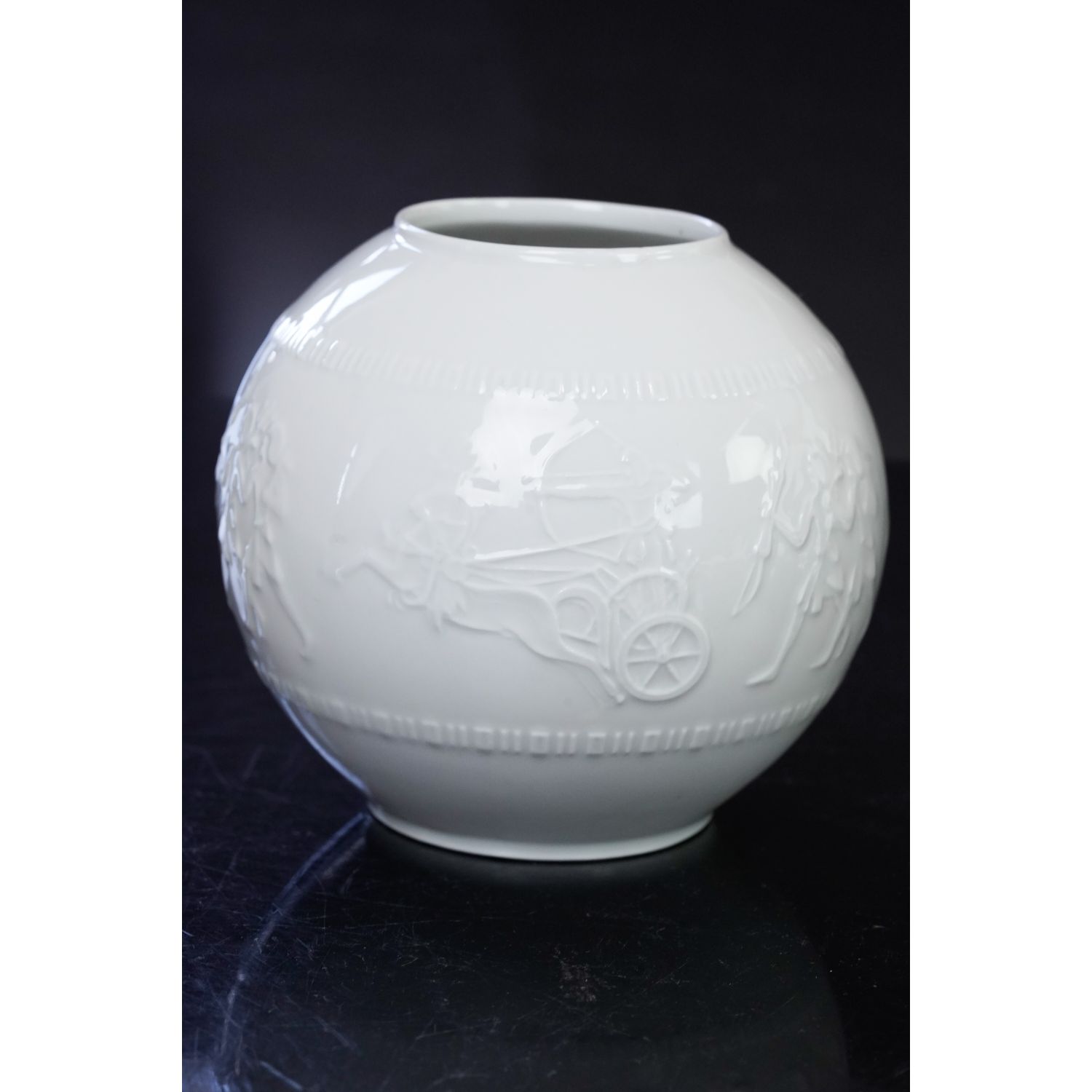 Ten elegancki, biały, porcelanowy wazon urzeka misternym, szczegółowym reliefem przedstawiającym antyczną scenę z rydwanem i postaciami wojowników. Kulisty kształt wazonu i błyszczące szkliwione wykończenie reliefu nadają mu klasyczny i wyrafinowany charakter. Ponadczasowy przedmiot kolekcjonerski i atrakcyjna dekoracja każdego domu.
