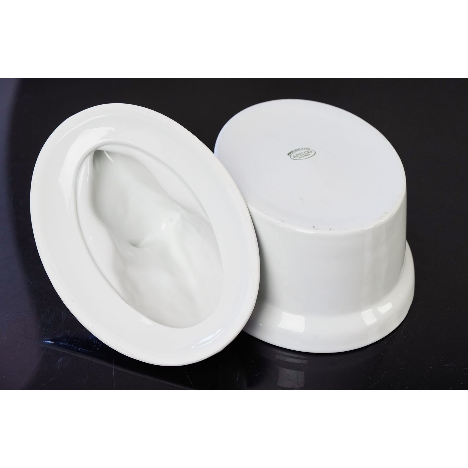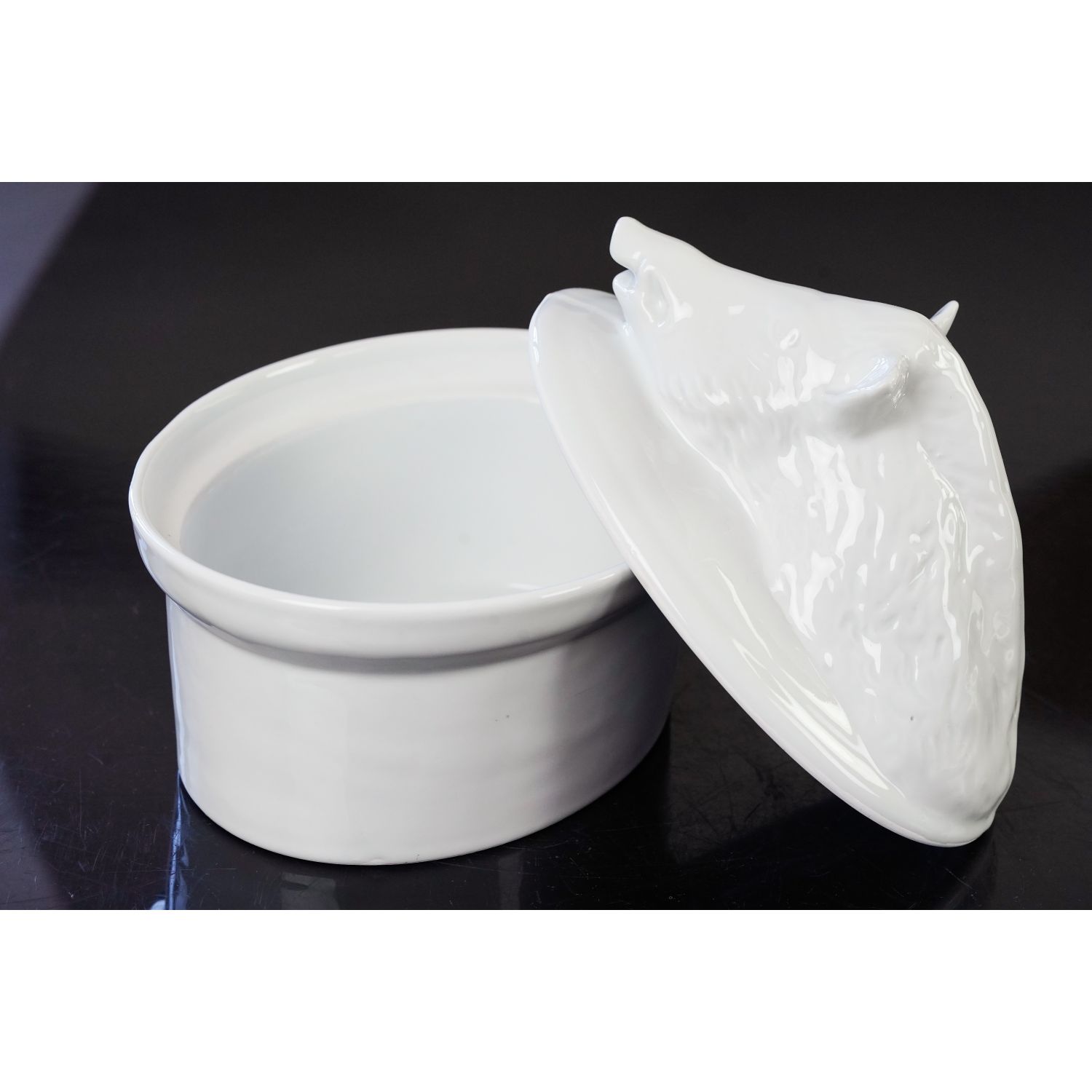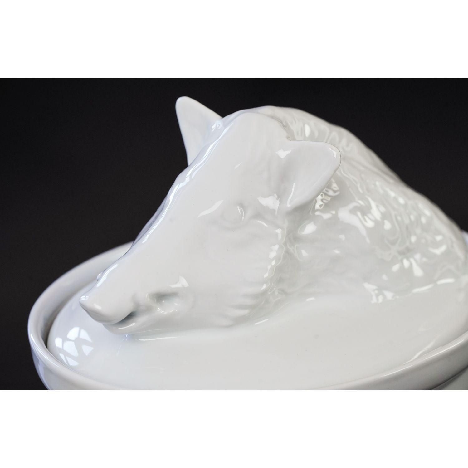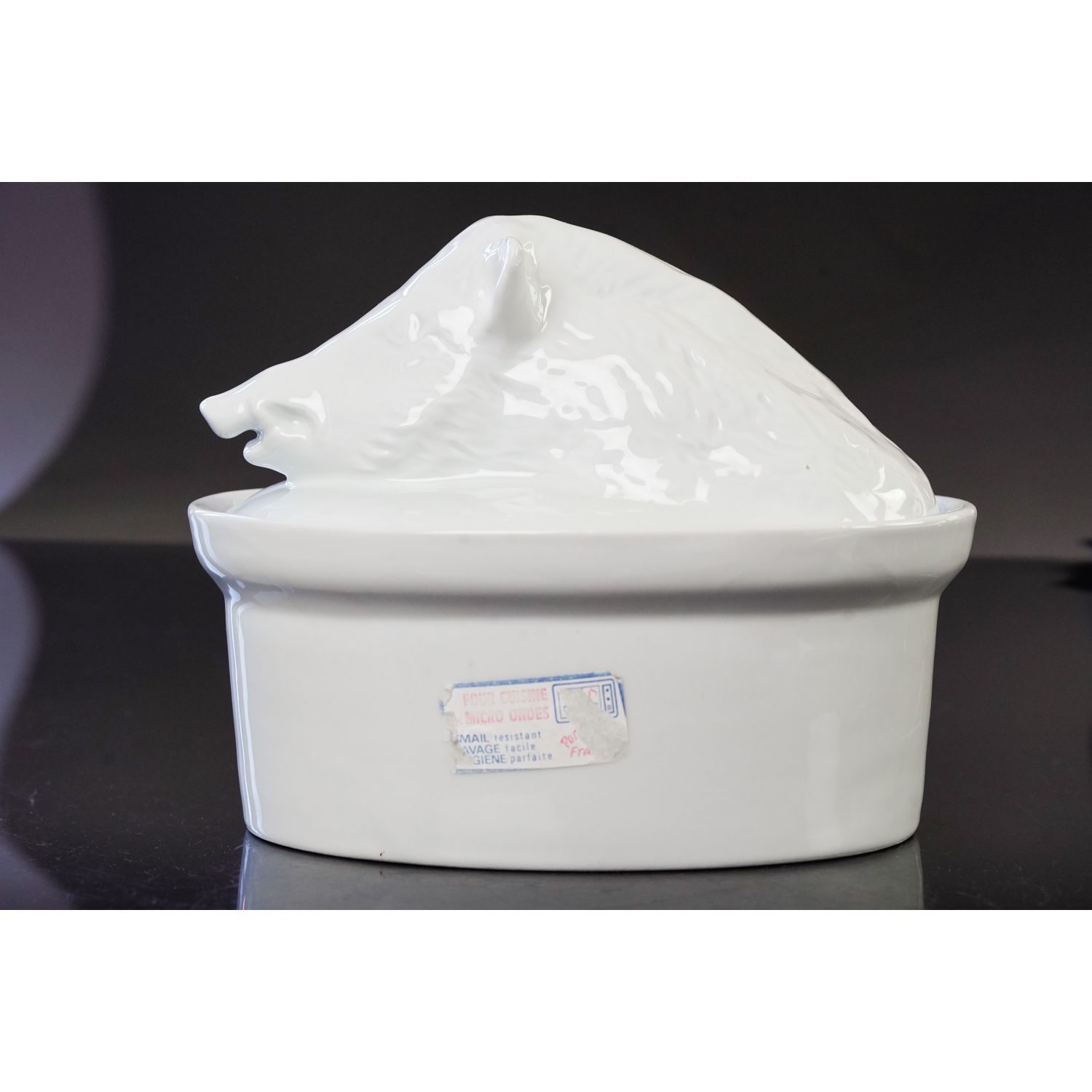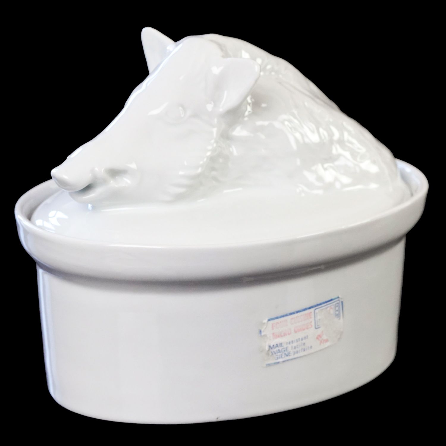Pochodzi z Francji, sygnowane jak na zdjęciu. Śliczna porcelanowa waza w doskonałym stanie. Wyśmienita biała ceramika. Naczynie ma owalny kształt. Dolna część zupełnie prosta. Pokrywa uformowana w kształcie dzika na owalnej misie.