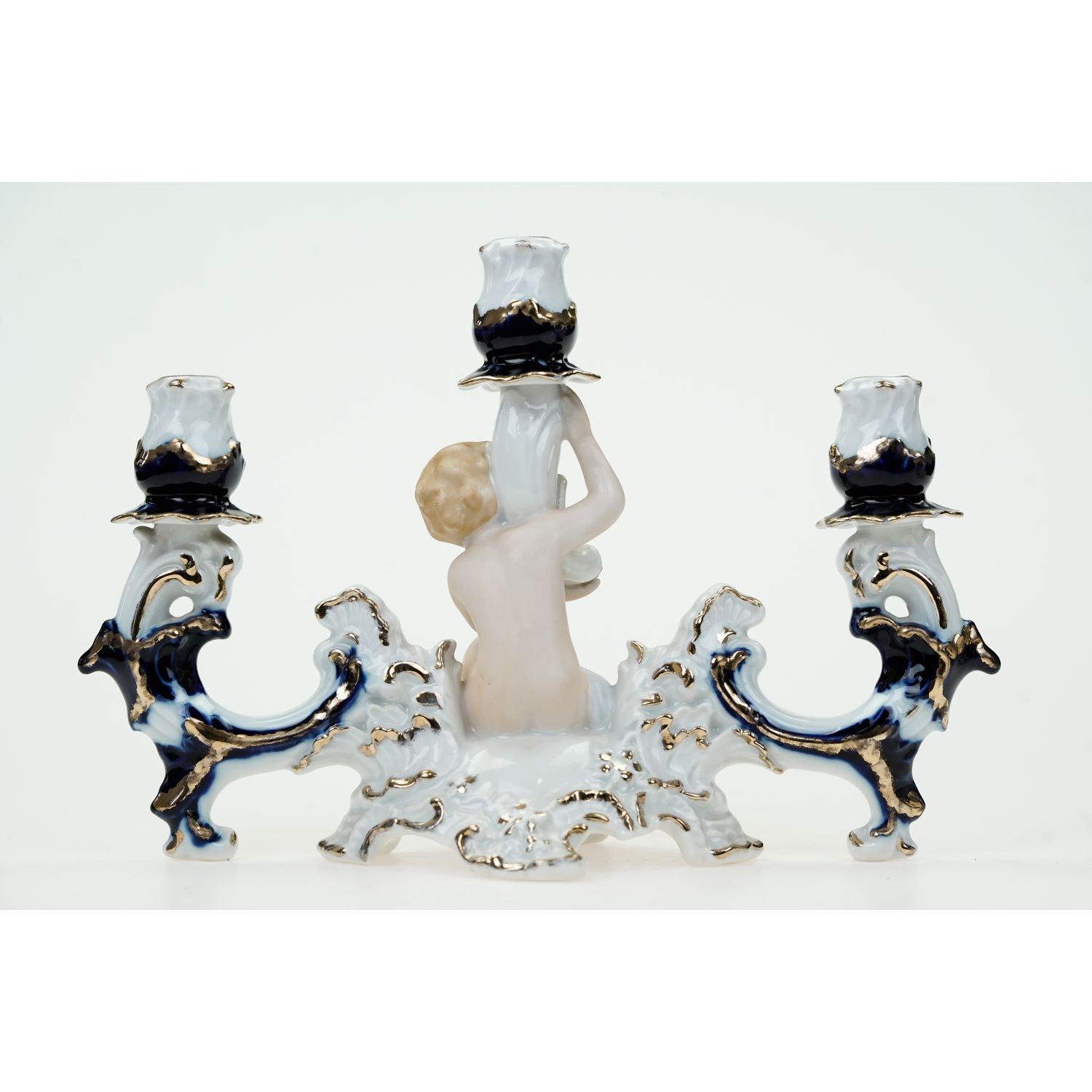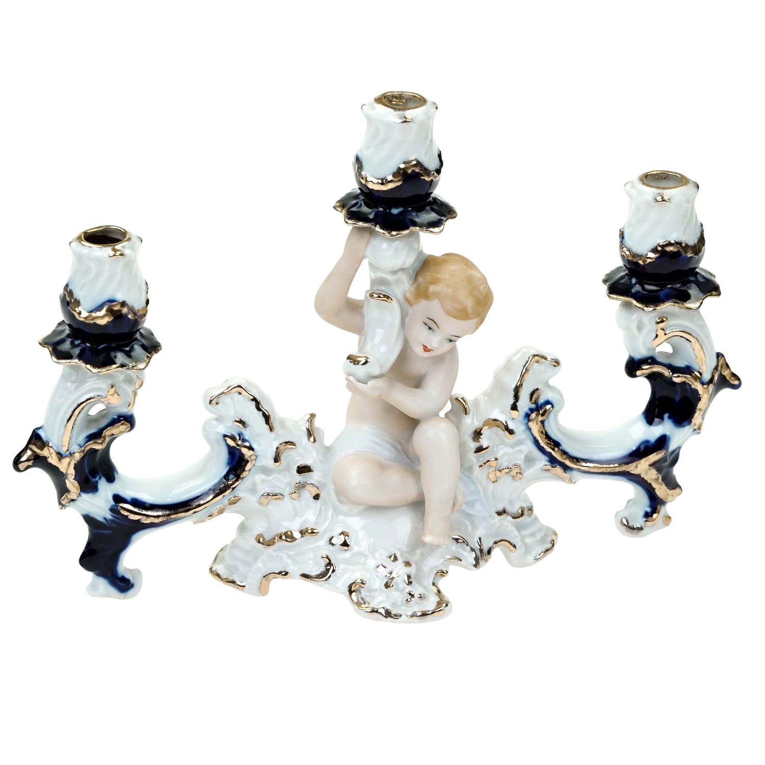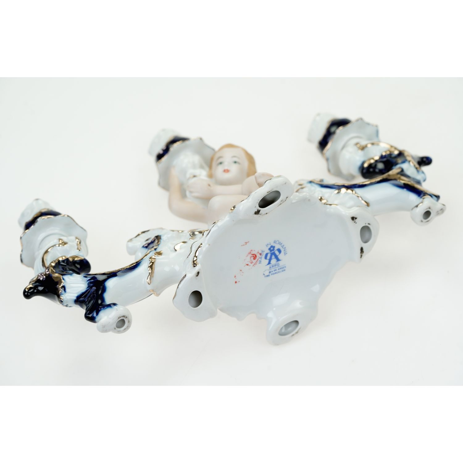 Pochodzi z manufaktury Arpo, Rumunia, Curtea de Arges. Wykonany z białej porcelany ręcznie malowanej kobaltem i złoceniem. Świecznik jest szkliwiony figurka putta biskwitowa, wykonana z dbałością o detale.