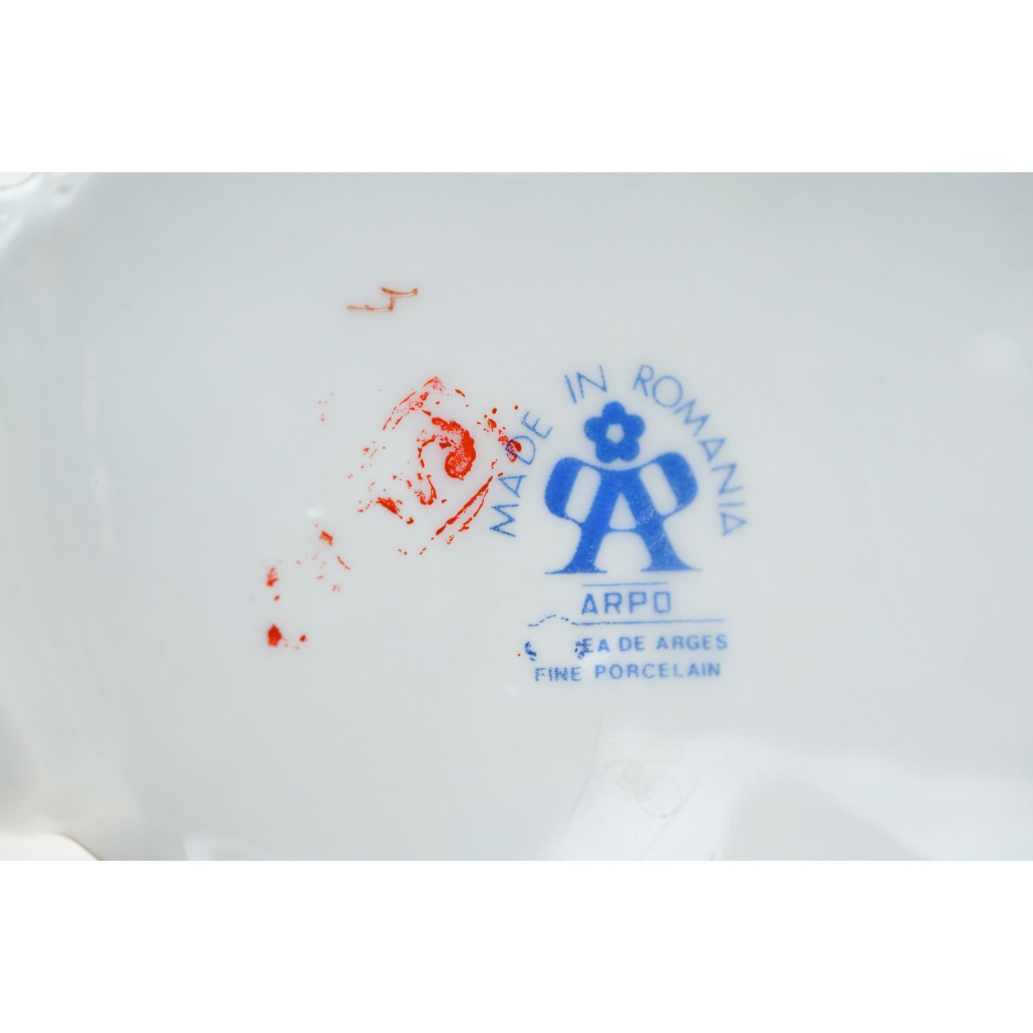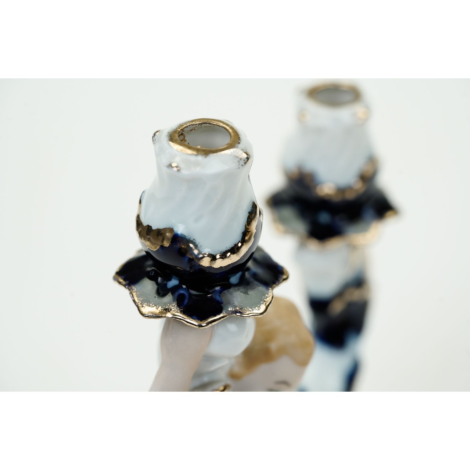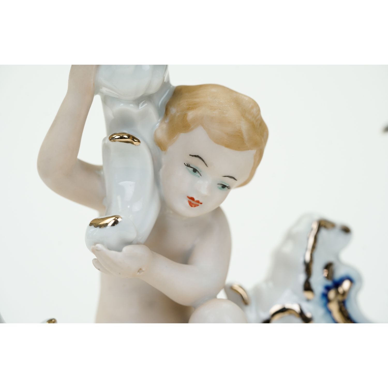 Pochodzi z manufaktury Arpo, Rumunia, Curtea de Arges. Wykonany z białej porcelany ręcznie malowanej kobaltem i złoceniem. Świecznik jest szkliwiony figurka putta biskwitowa, wykonana z dbałością o detale.