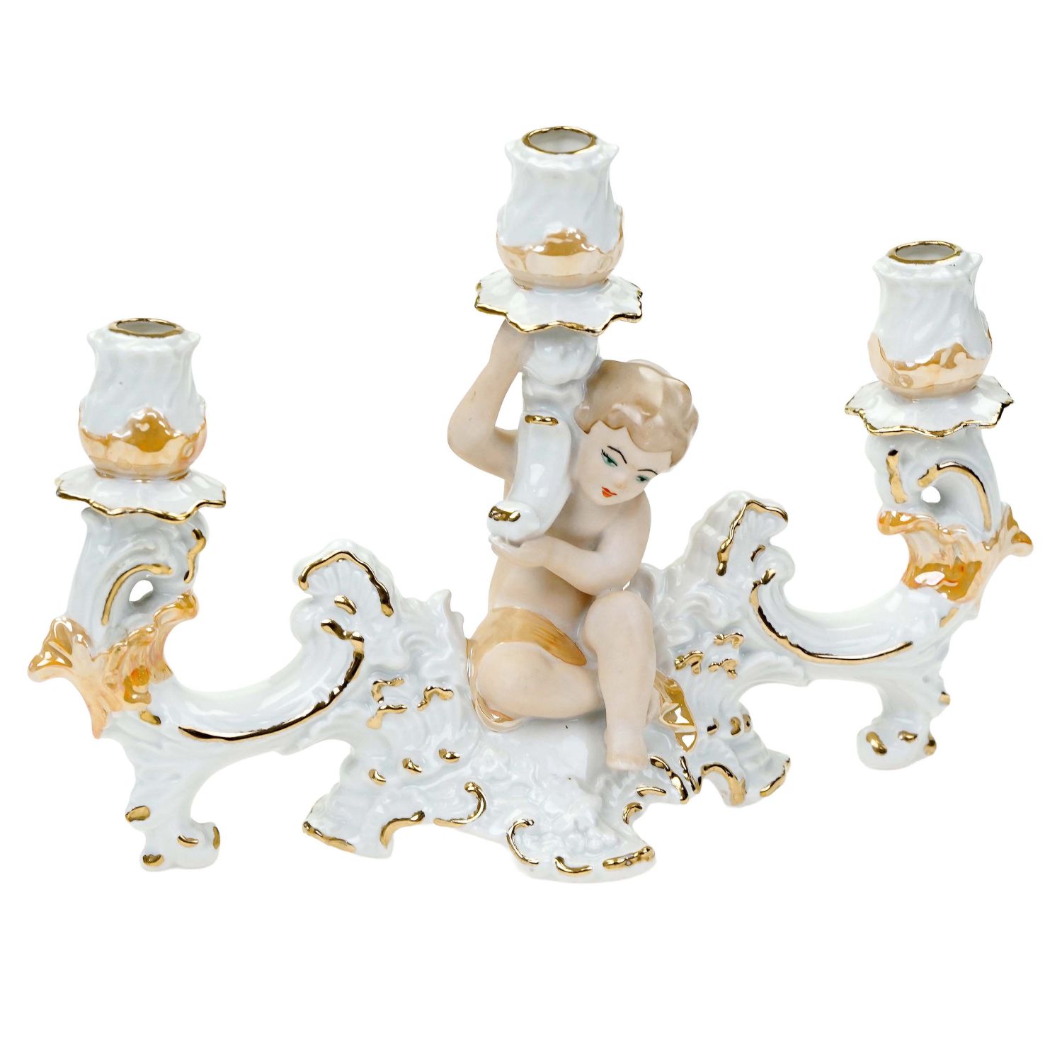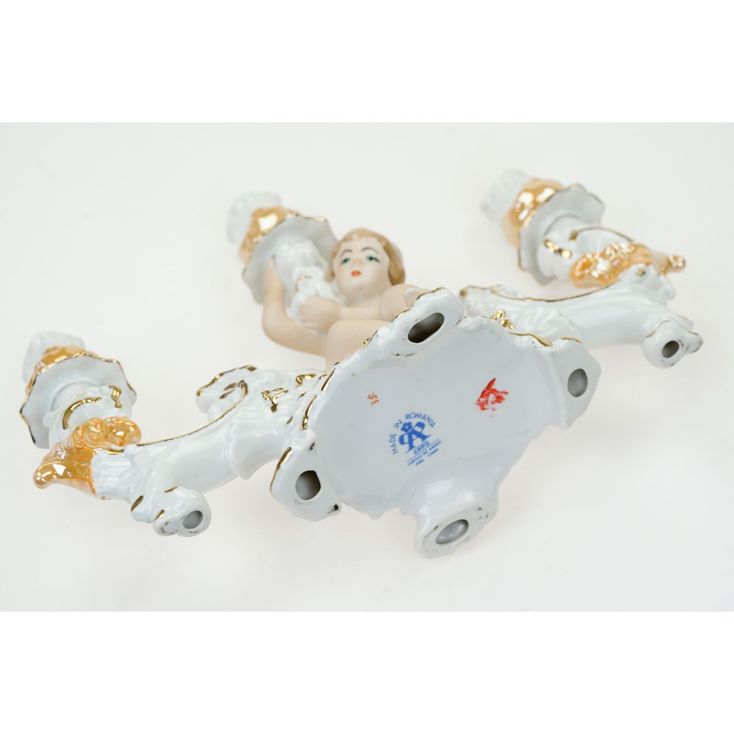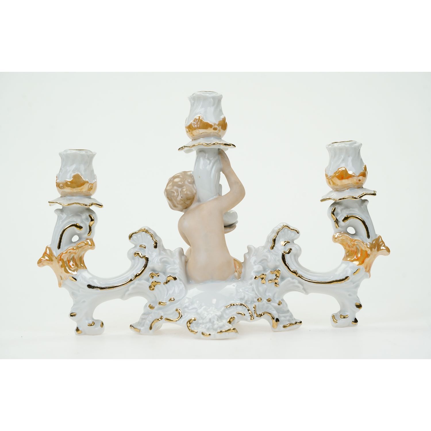 Pochodzi z manufaktury Arpo, Rumunia, Curtea de Arges. Wykonany z białej porcelany ręcznie malowanej i złoceniem i opalizowaną powłoką. Świecznik jest szkliwiony figurka putta biskwitowa, wykonana z dbałością o detale.