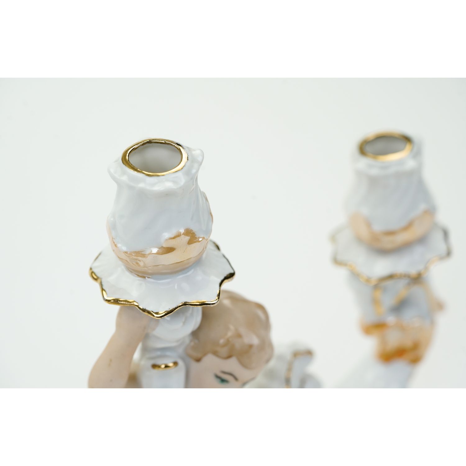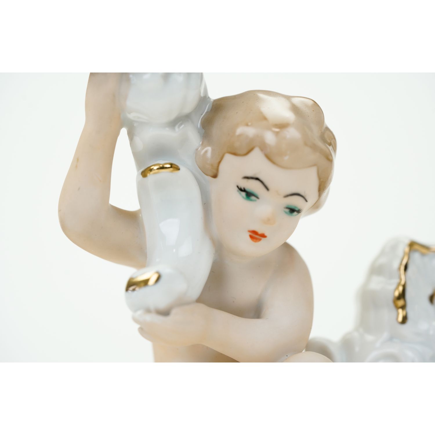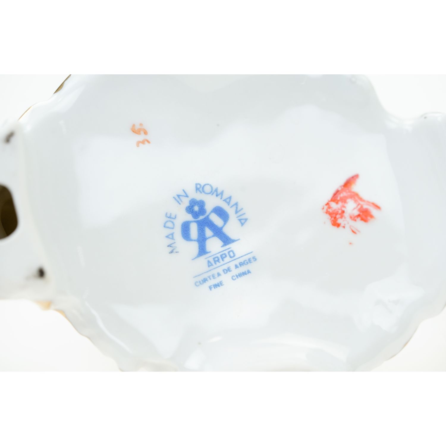 Pochodzi z manufaktury Arpo, Rumunia, Curtea de Arges. Wykonany z białej porcelany ręcznie malowanej i złoceniem i opalizowaną powłoką. Świecznik jest szkliwiony figurka putta biskwitowa, wykonana z dbałością o detale.