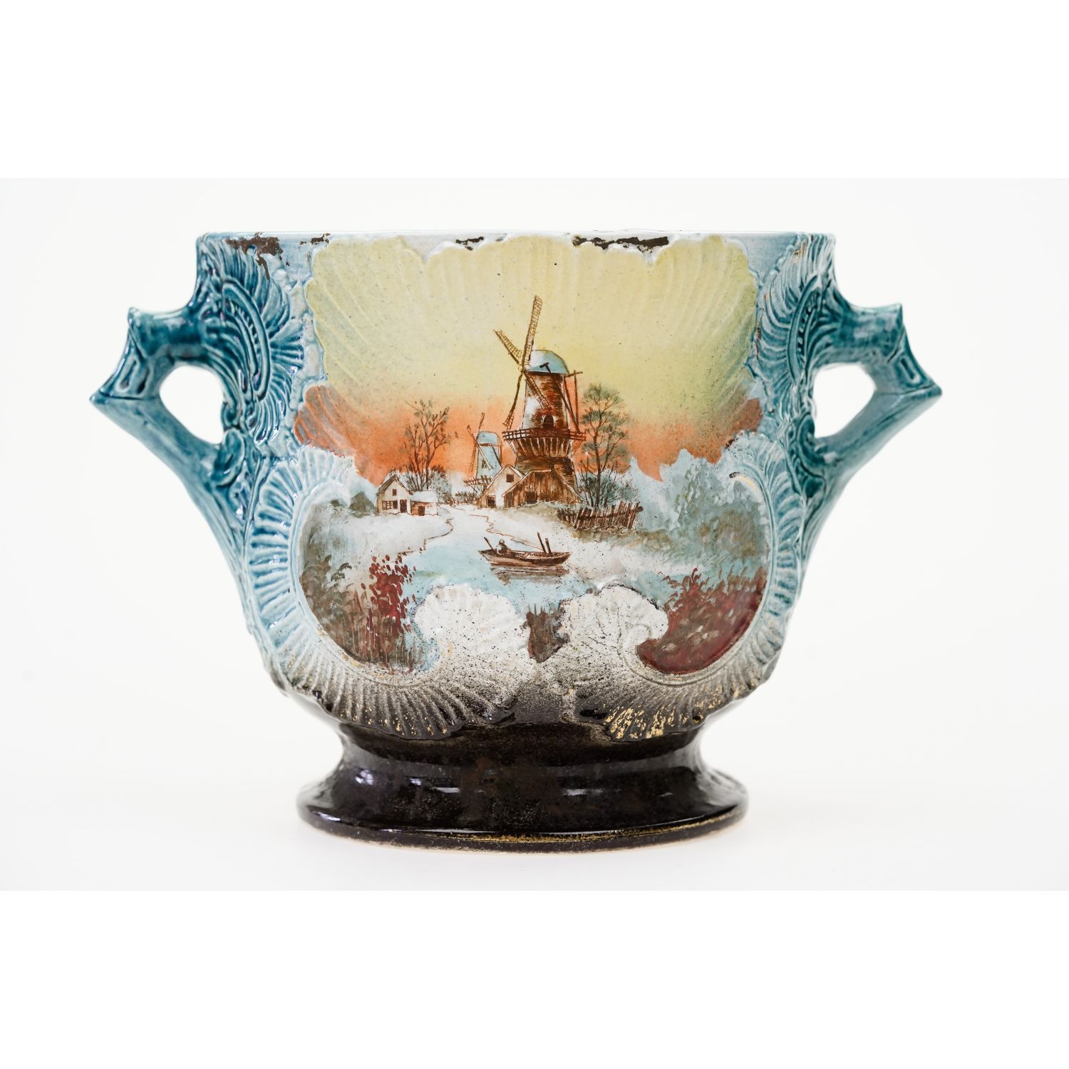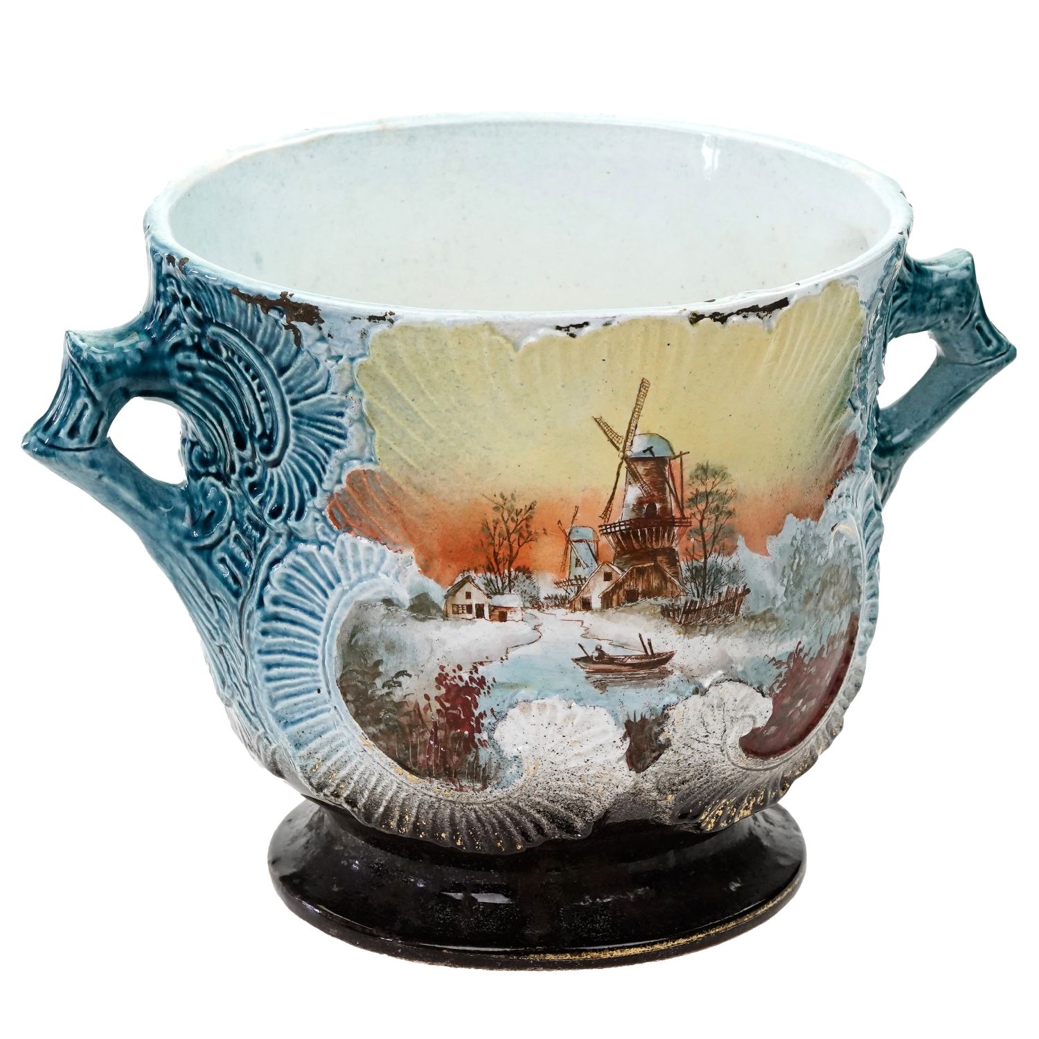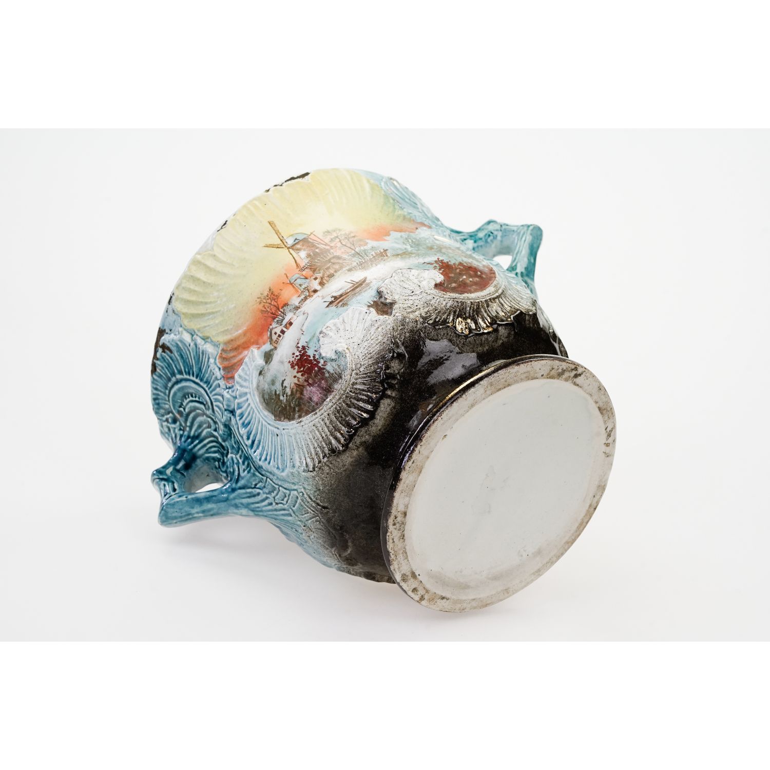 Piękne pejzaże ręcznie malowane w otoczeniu wyrazistych reliefów. Sygnowana jedynie numerycznymi wyciskami w masie. Antyczna, ceramiczna, spora donica ozdobiona reliefami i ażurowymi uszami. Całość w cieniowanym błękicie. Z obu stron medalion przedstawiający pejzaż, który ręcznie pomalowano. Szkliwiona.