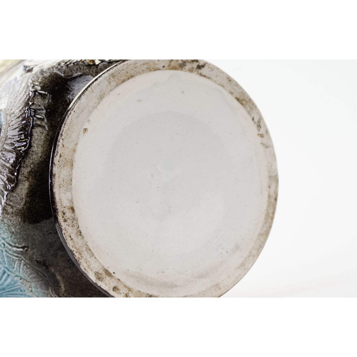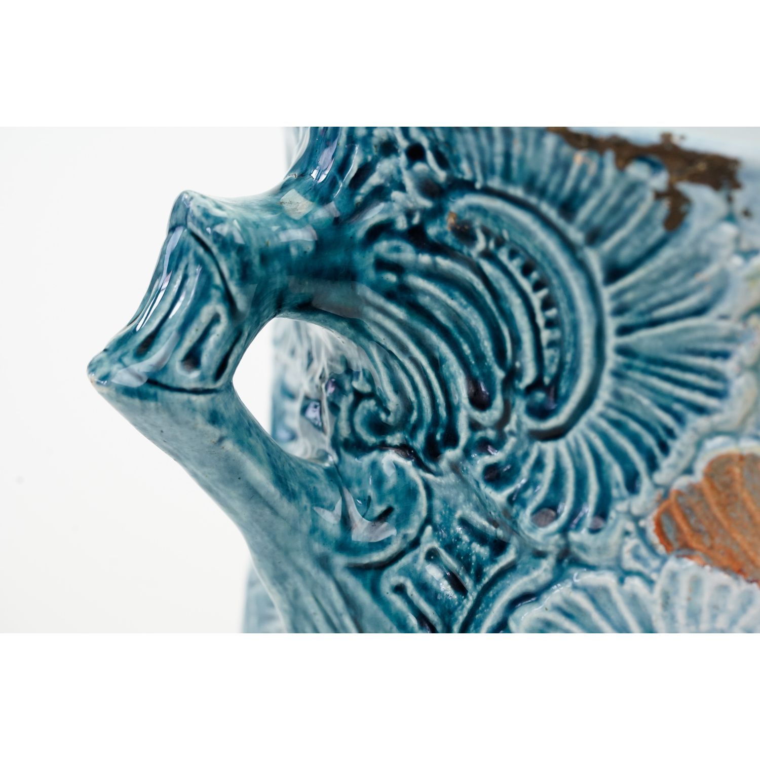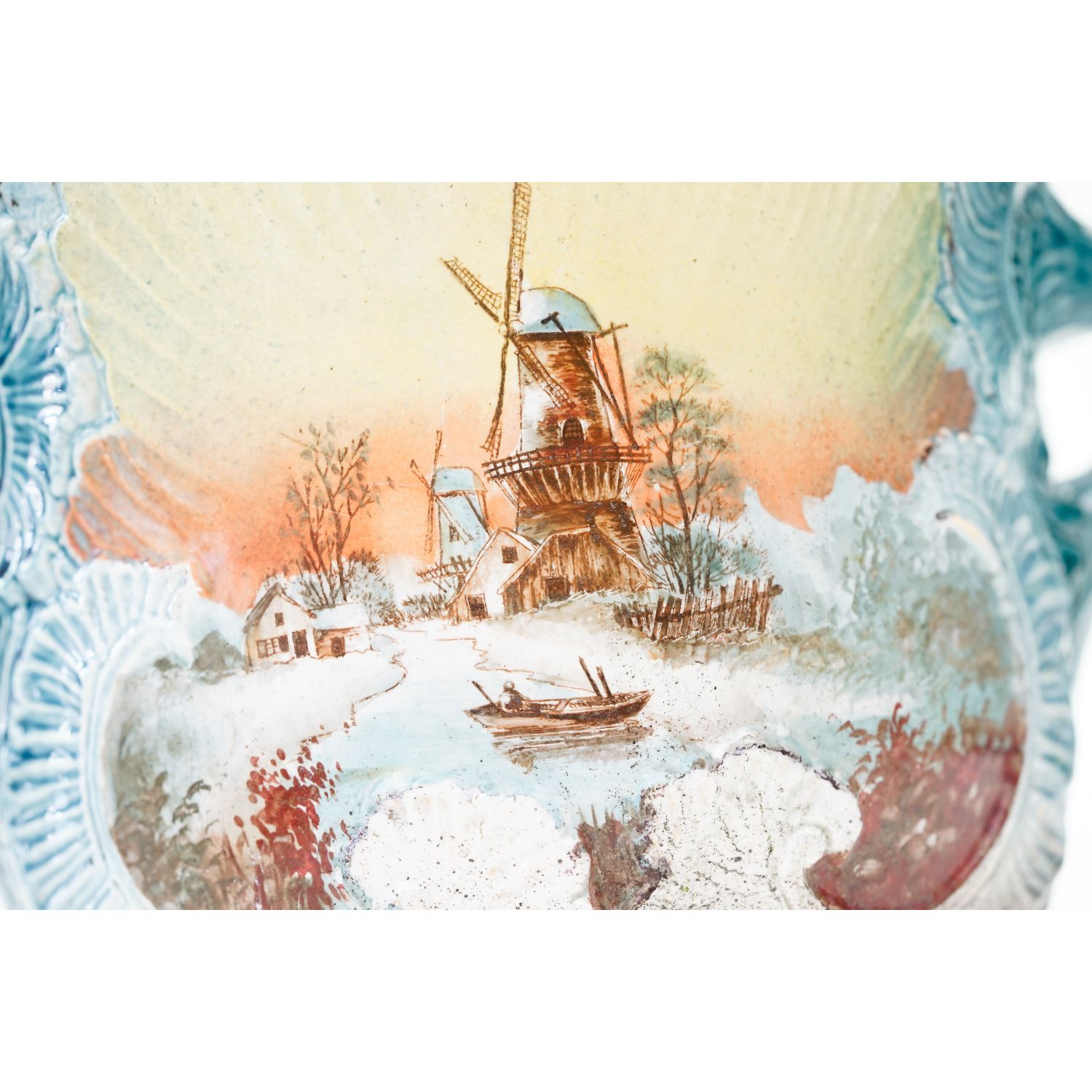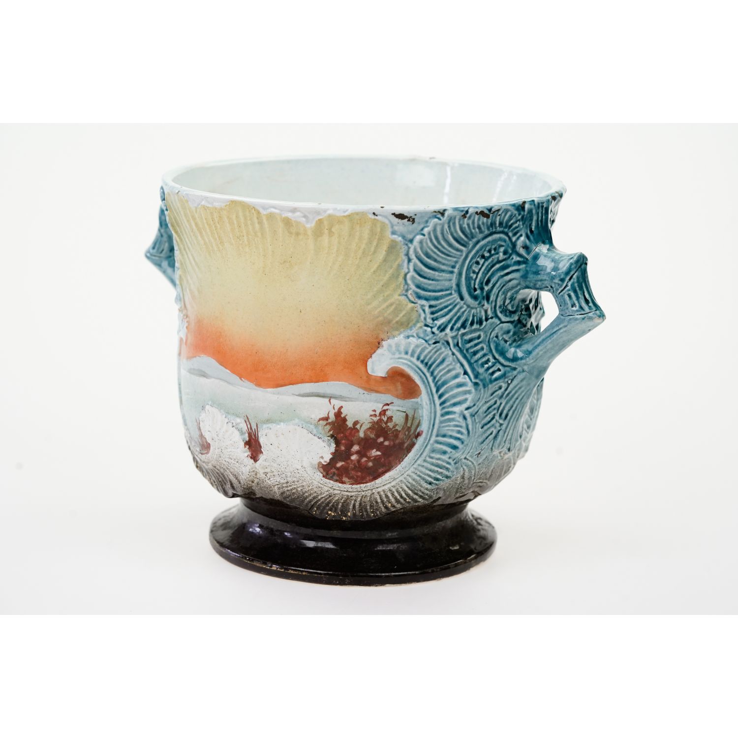 Piękne pejzaże ręcznie malowane w otoczeniu wyrazistych reliefów. Sygnowana jedynie numerycznymi wyciskami w masie. Antyczna, ceramiczna, spora donica ozdobiona reliefami i ażurowymi uszami. Całość w cieniowanym błękicie. Z obu stron medalion przedstawiający pejzaż, który ręcznie pomalowano. Szkliwiona.