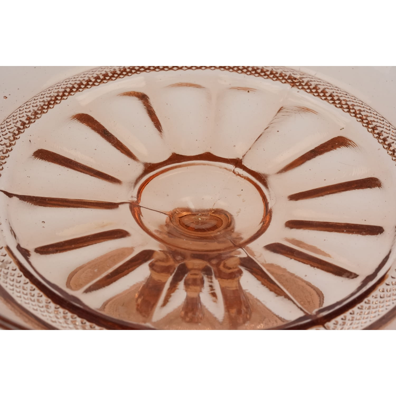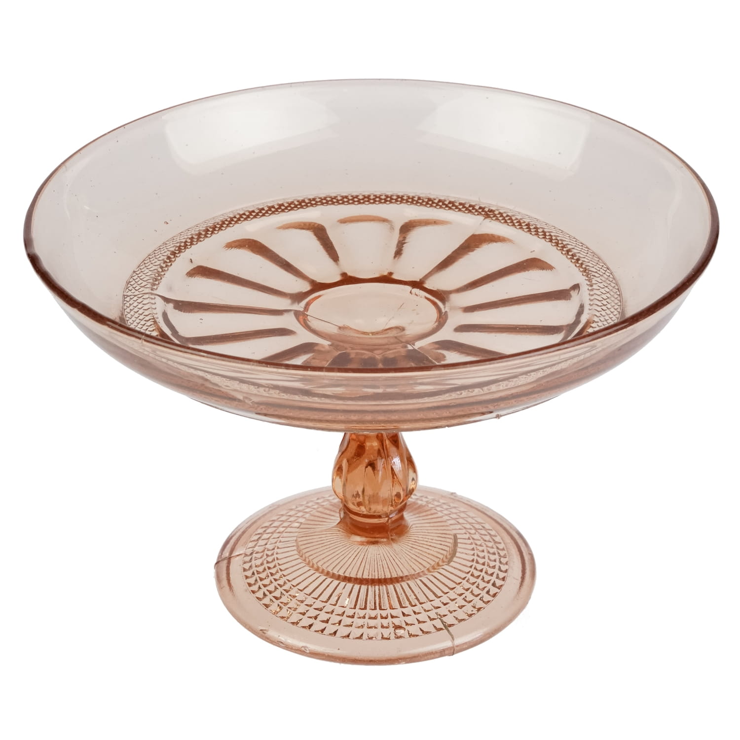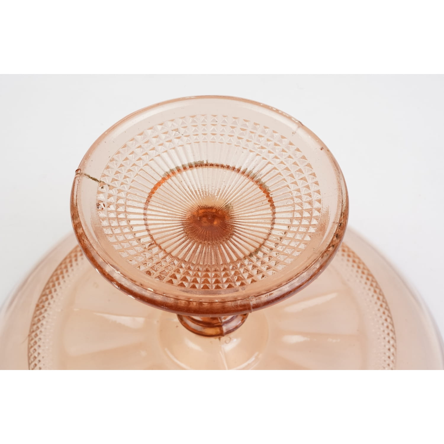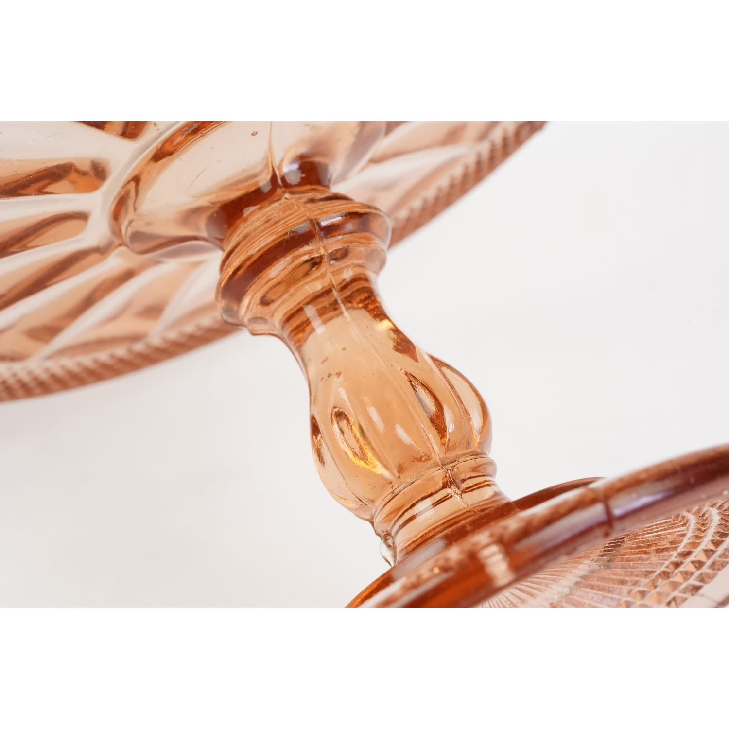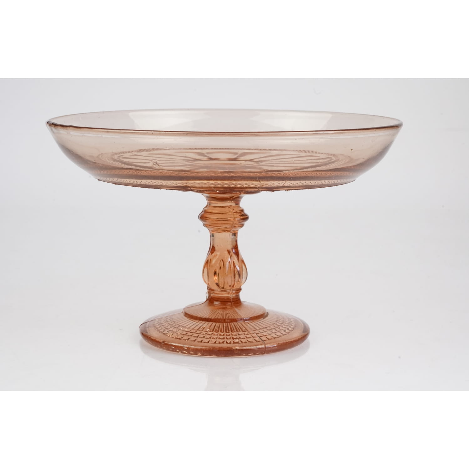 Pochodzi z jednej z polskich hut szkła. Prawdopodobnie jest to model katalogowany pod numerem 116 a, z huty szkła Bolesława Morawskiego z Radomska. Potem może też produkowana w Ząbkowicach. Szkło prasowane w ładnym, łososiowym odcieniu. Noga i stopa bogato dekorowane. Na talerzu tłoczenie przypominające kwiat ujęte w szlaczek drobniutkiego wzoru diamentowego. Diamentowa dekoracja powtórzona na stopie.
