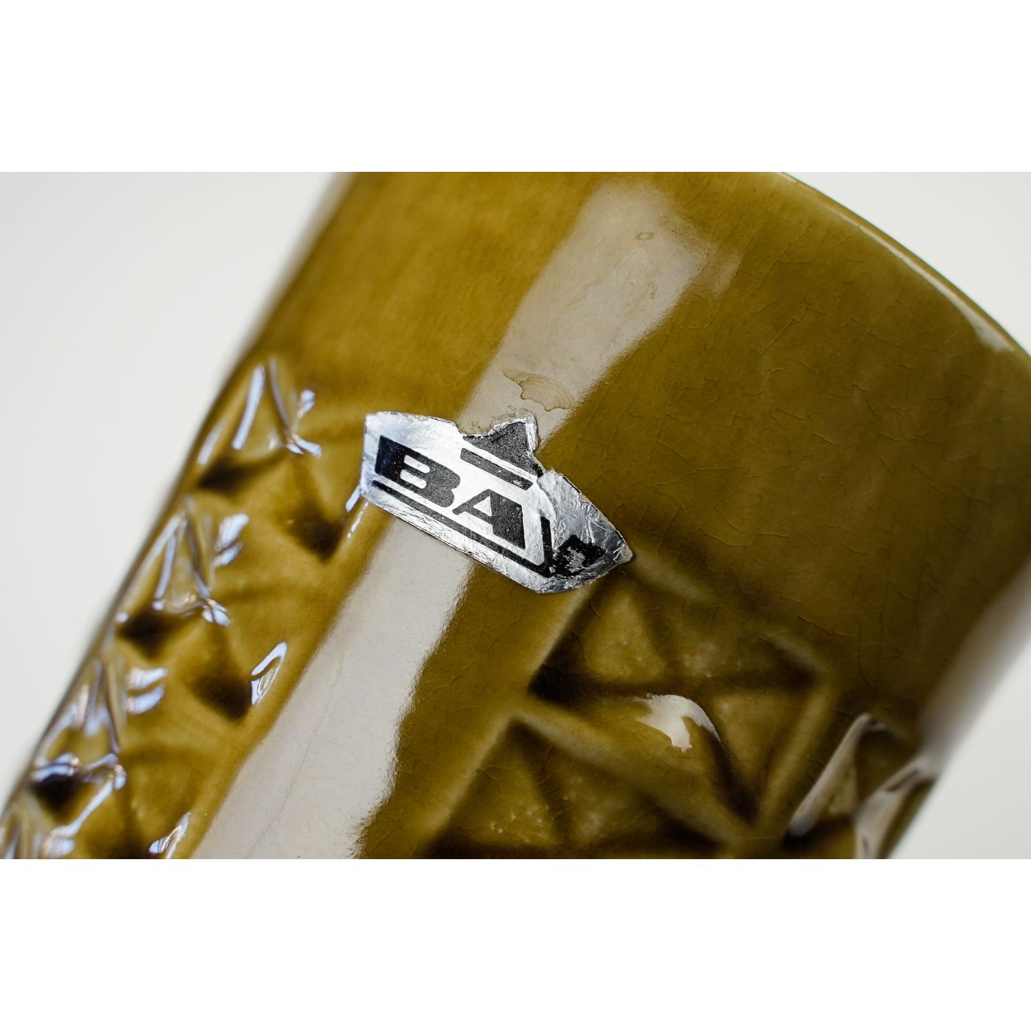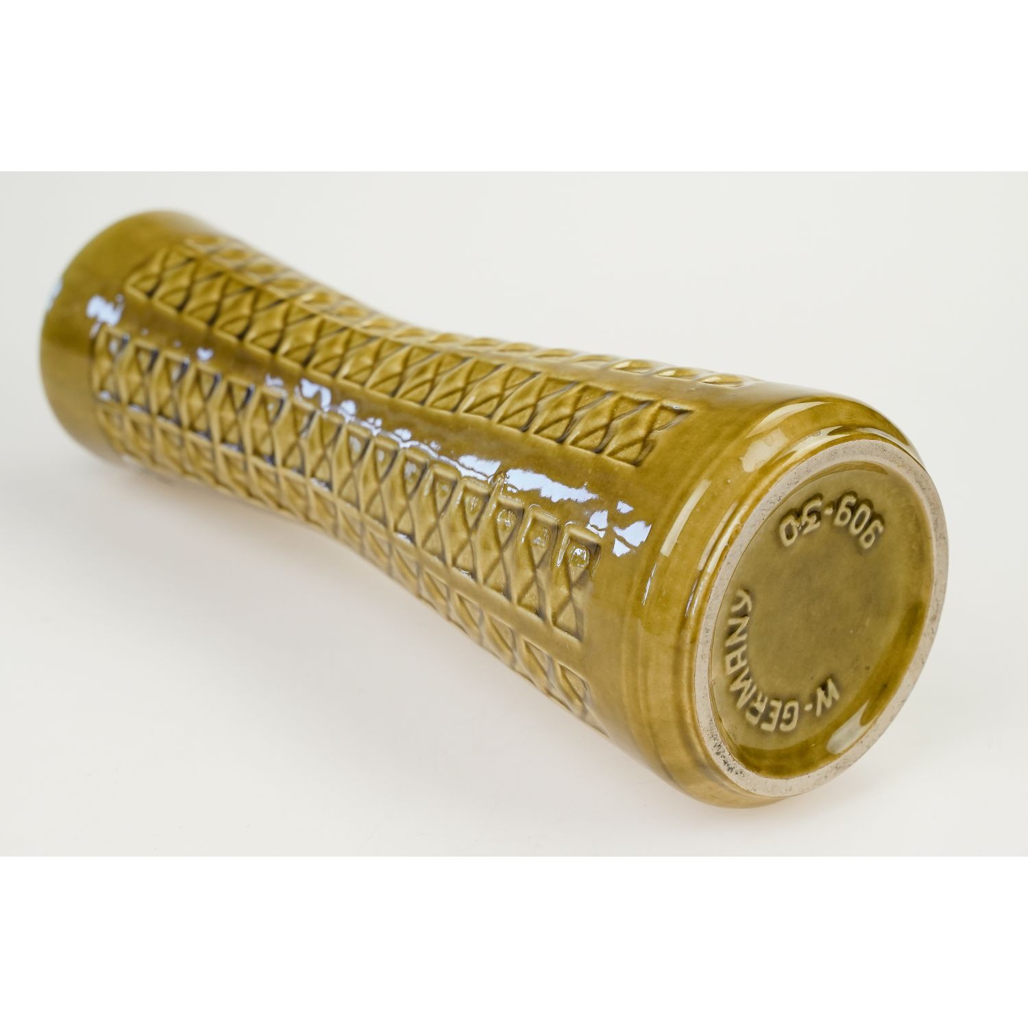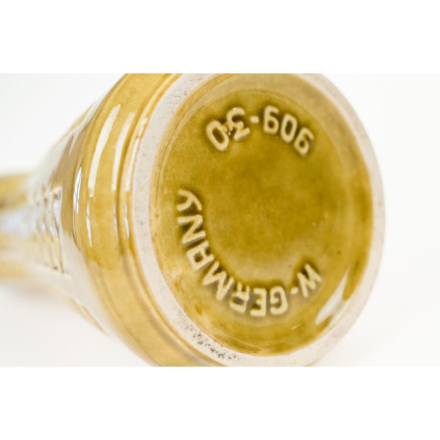 Pochodzi z Bay. Firma została założona w 1933 roku przez Eduarda Bay’a w Ransbach Baumbach w Nadrenii-Palatynacie w Zachodnich Niemczech. Przy podstawie widoczna biała glina, z której tworzono wszystkie produkty firm. Model 909-30, ma smukły, wysoki kształt i jest oblany ochrowo-brązową glazurą z subtelnymi niuansami kolorystycznymi, które nadają powierzchni efekt głębi. Jego charakterystyczną cechą jest geometryczny wzór reliefowy, który biegnie pionowo przez całą powierzchnię wazonu, tworząc wyraźną strukturę i rytm. Cały korpus ma kształt klepsydry.