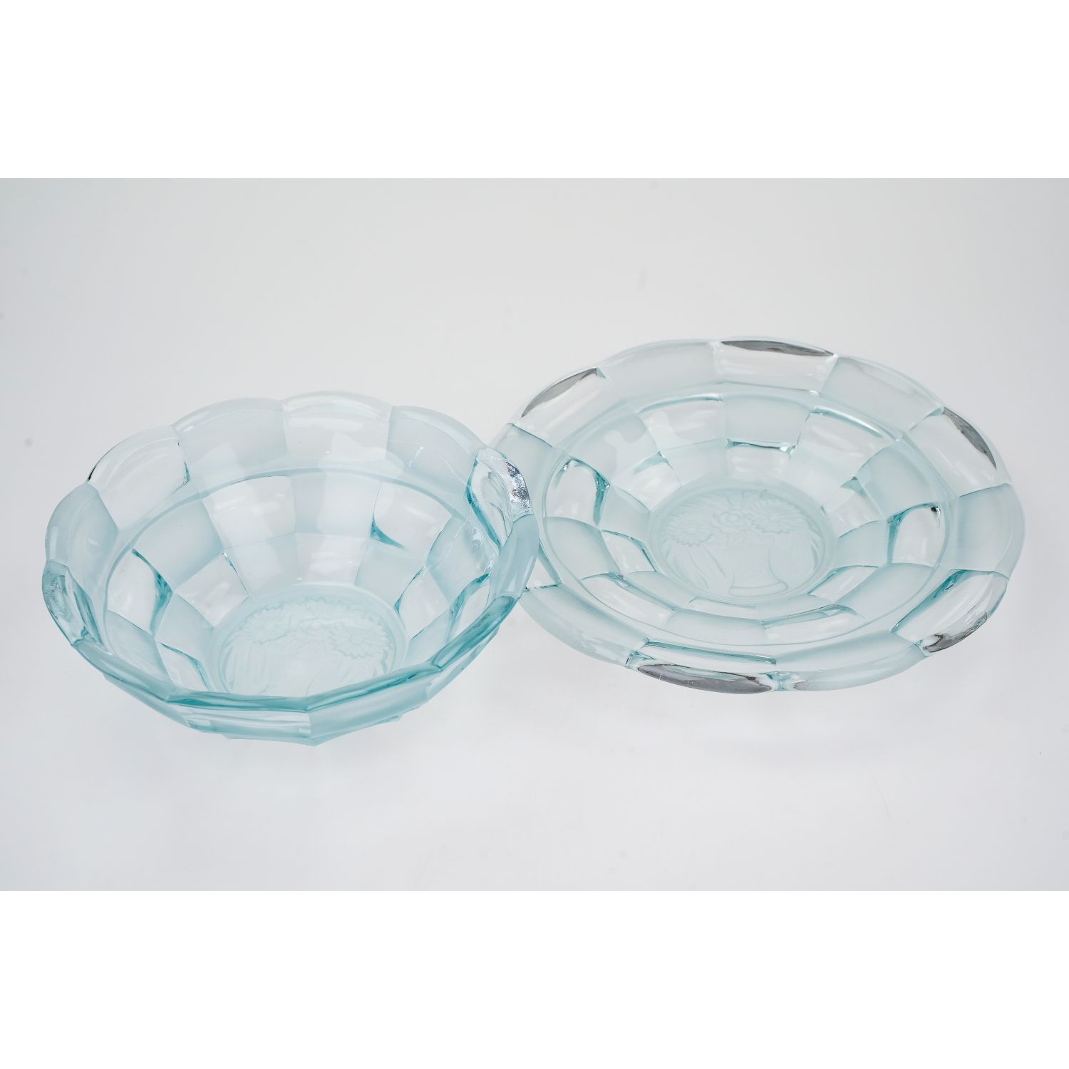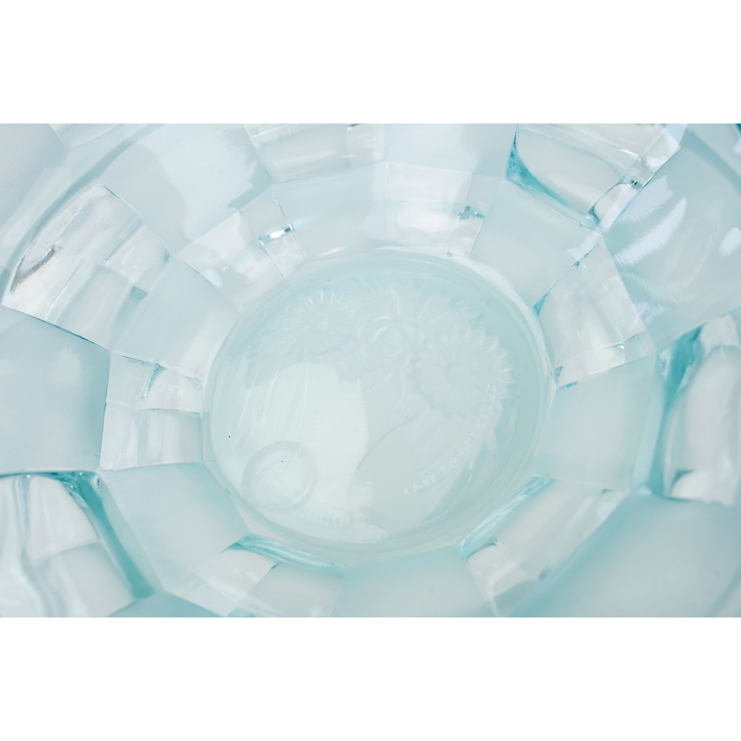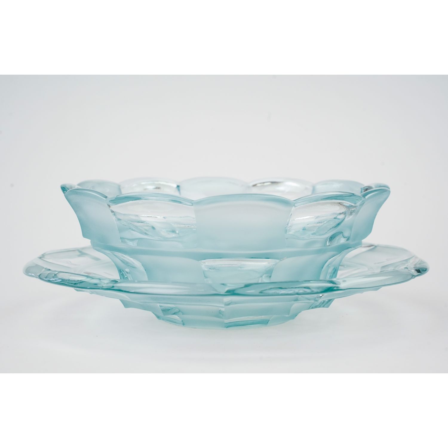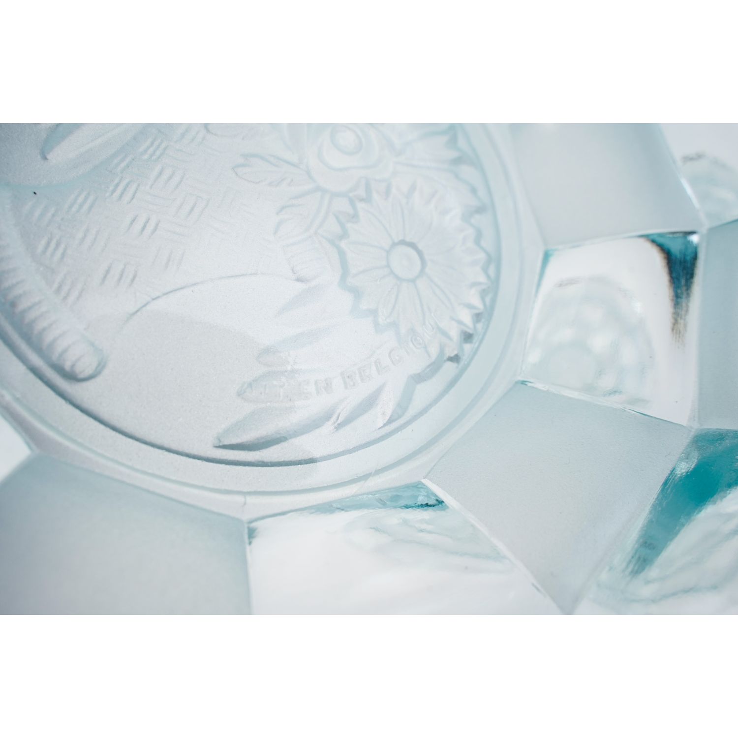 Szkło pochodzi z Belgii, (Scailmont?). Sygnowana tłoczonymi literkami od spodu "Fait En Belgique". Szkło prasowane w kolorze niebieskim. Kołnierz w dużą kostkę na przemiennie trawioną. Na lustrze kosz kwiatów, dekoracja też matowa, rant falowany.