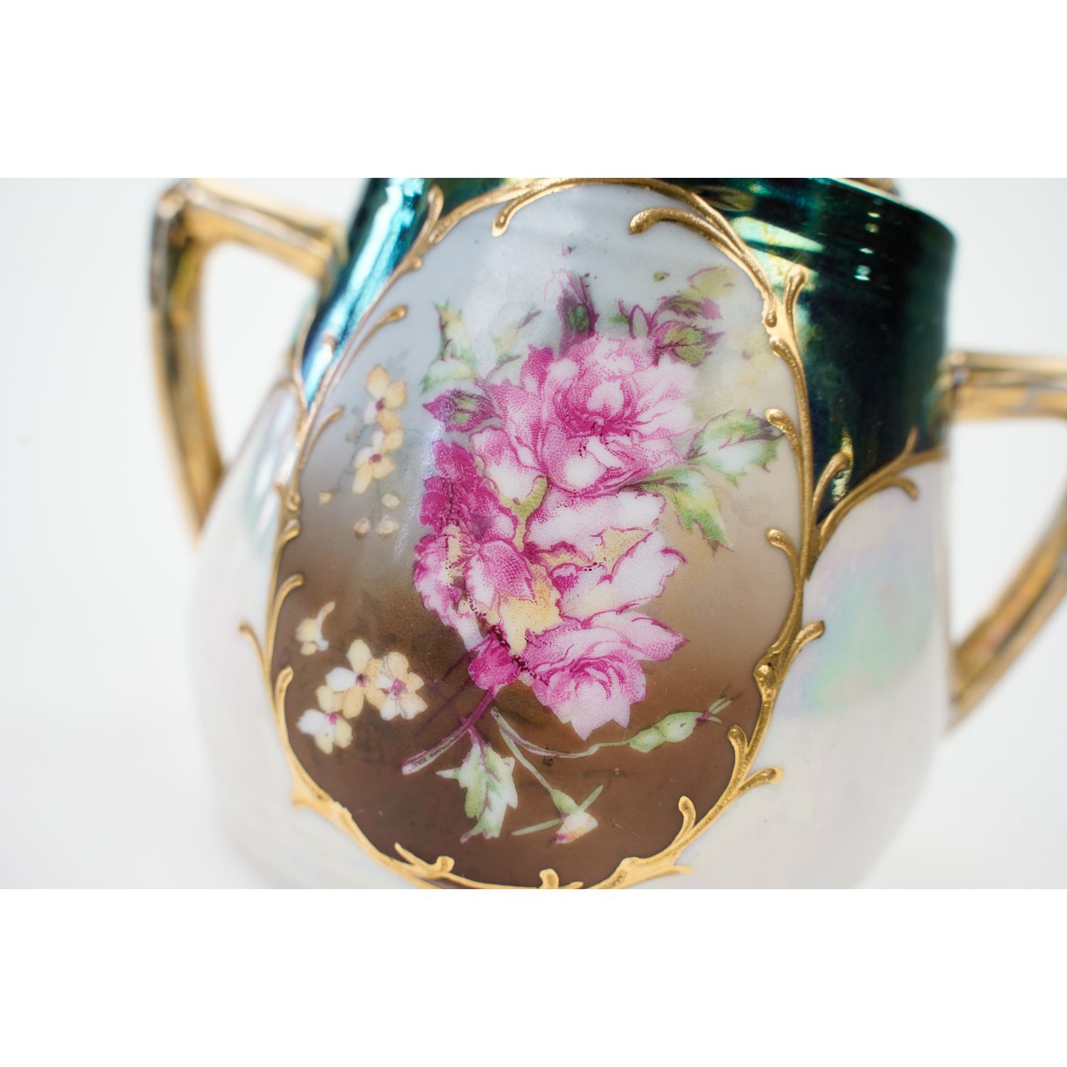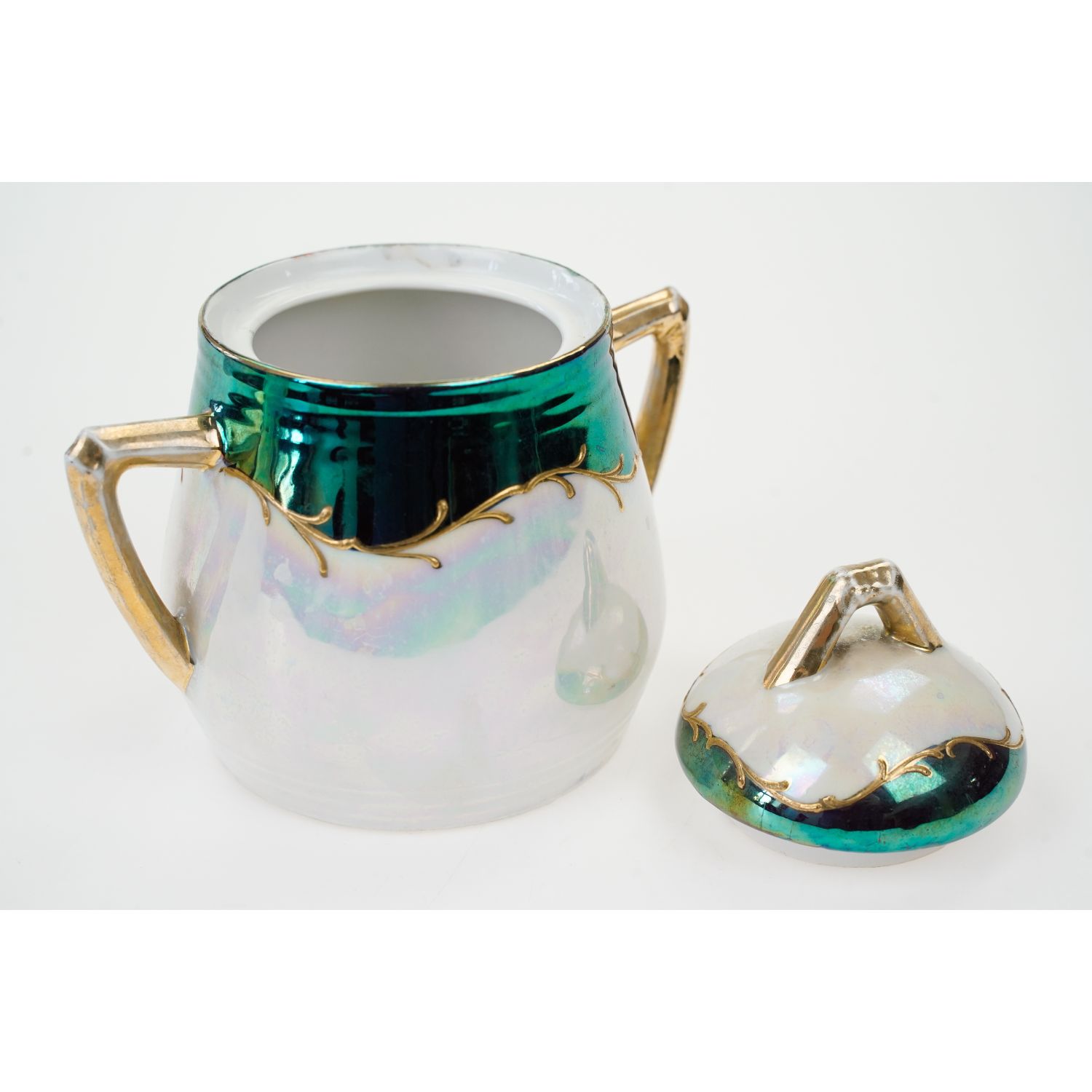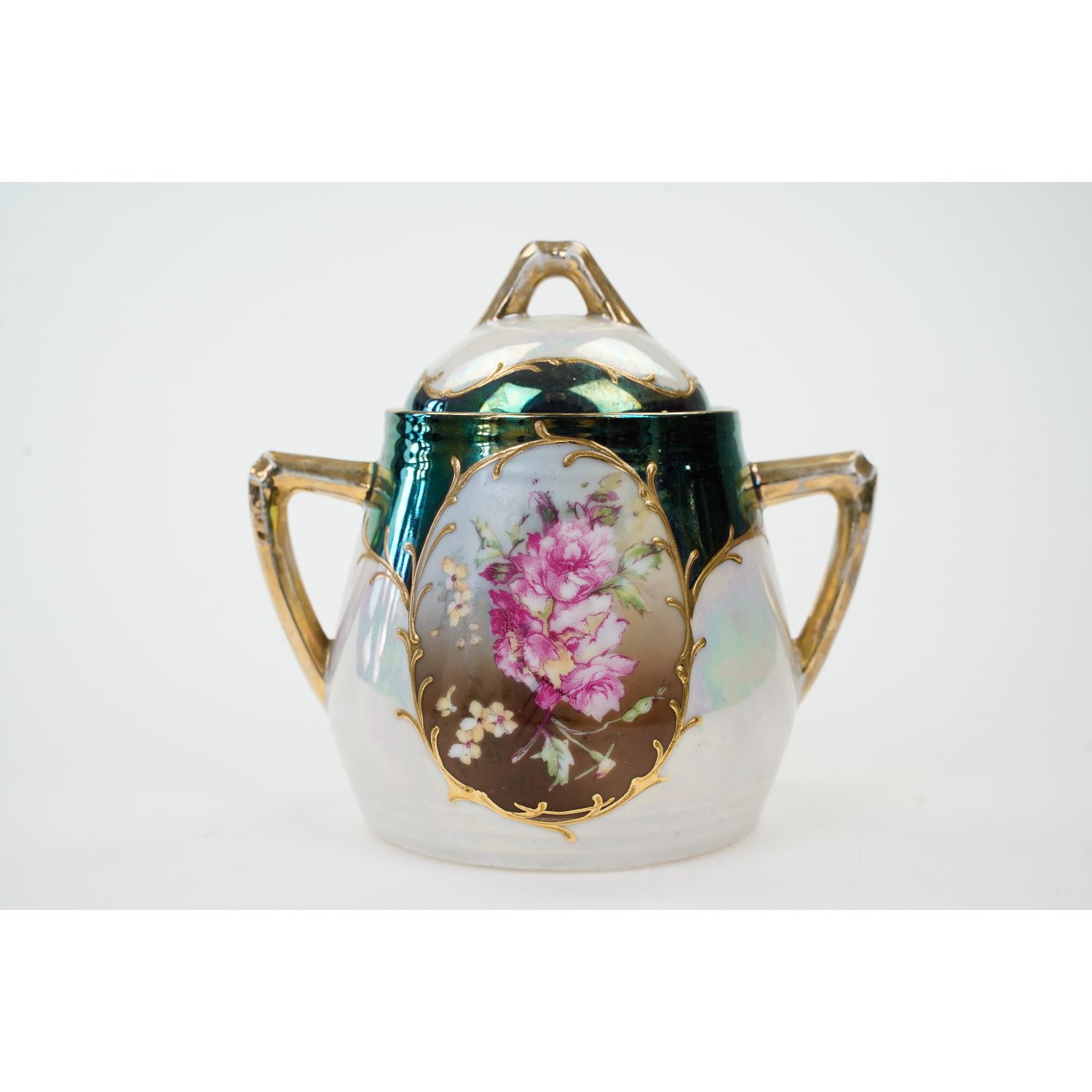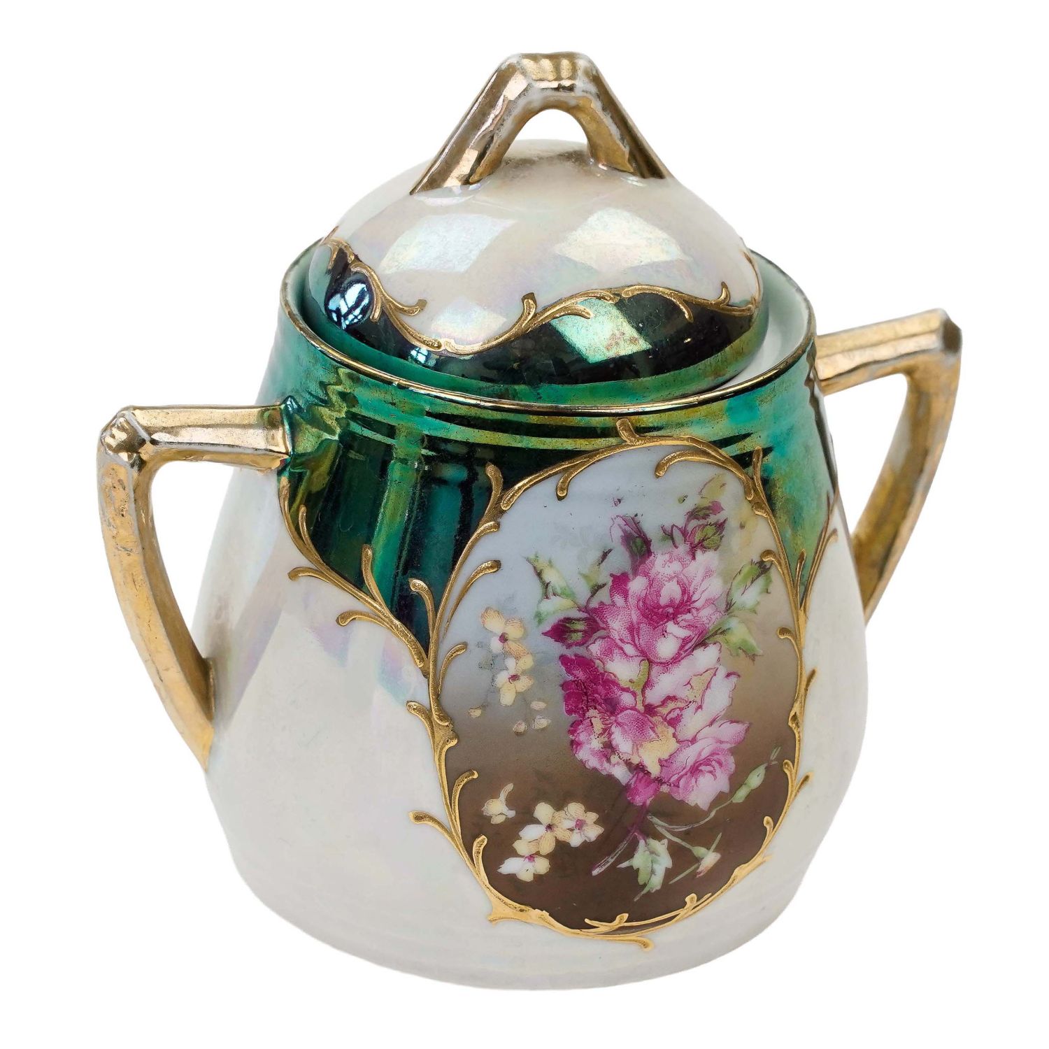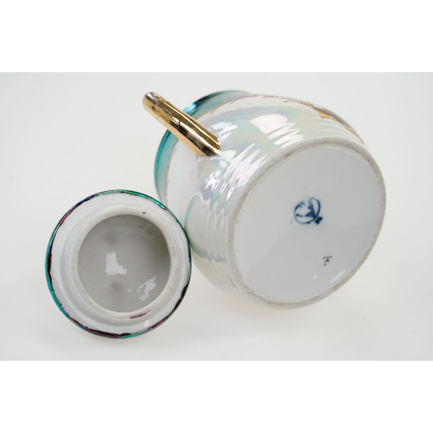 Jeżeli fabryki należące do stowarzyszenia nie posiadają własnej marki, opatrują swoje wyroby powyższym symbolem i odpowiadającym mu numerem poniżej. Okres używania znaczka to mniej więcej początek 1908 roku do około połowy 1912 roku. Pod sygnaturą cyfra 75 = Zwickauer Porzellanfabrik, Zwickau. Porcelana biała, grubsza opalizowaną powłoką i zielonkawą malaturą. Od frontu medalion z kwiatami w złotym obramowaniu. Kontury też złocone. Uszy w pełni złocone, ale trochę już przetarte.