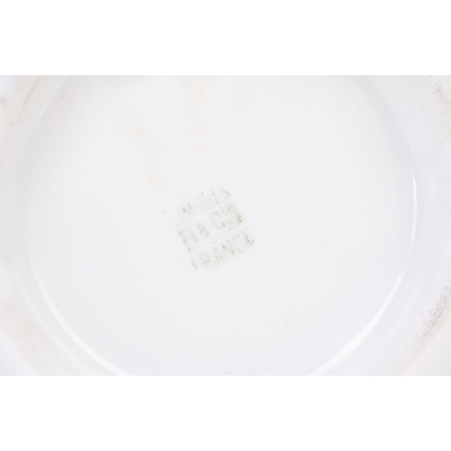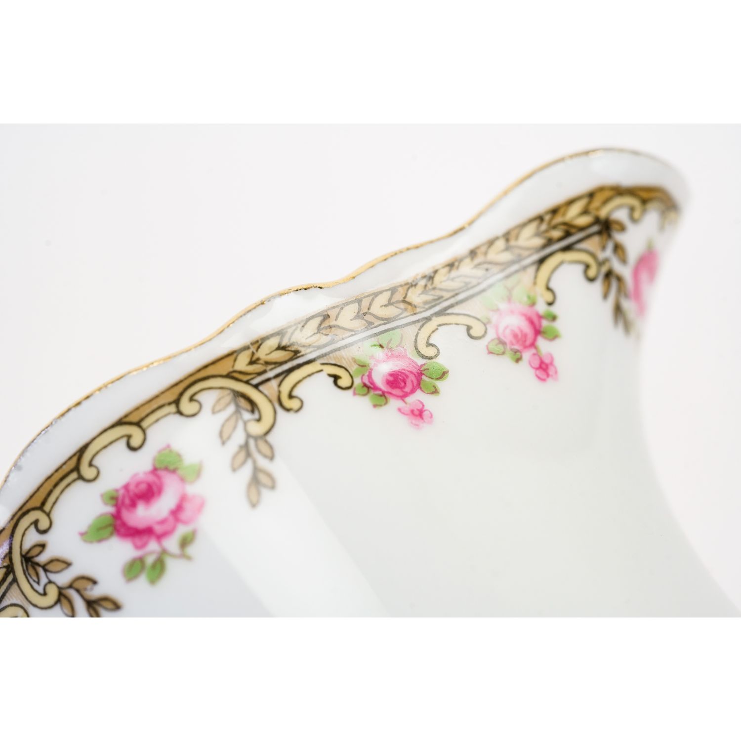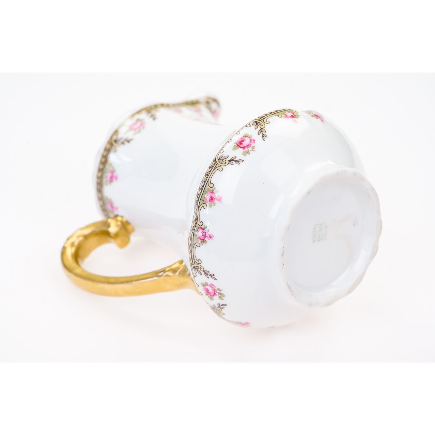 Pochodzi z Francji z Limoges z L Bernardaud & Co, sygnowany znakiem stosowanym od 1900 roku. Porcelana w kolorze białym zdobiona szlaczkami różyczek i złoceniami. Uszko w pełni złocone. Kontury w złoceniach.