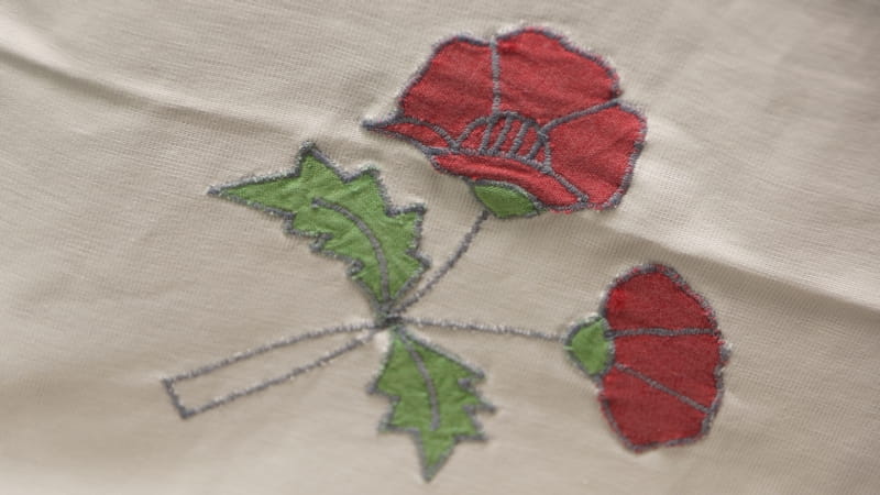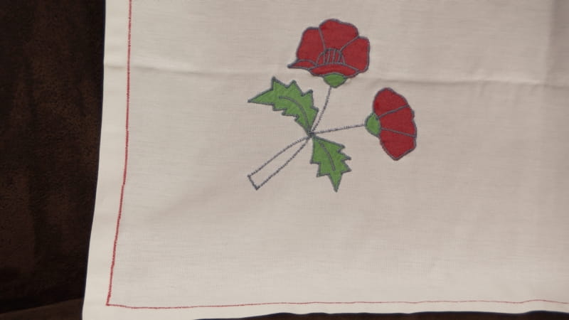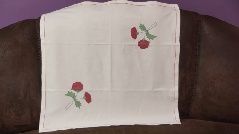 Wykonany bawełnianej tkaniny, ale chyba z jakimś dodatkiem w kolorze złamanej bieli. Obrus zdobią duże aplikacje z innych tkanin, naszywane maszynowo, przedstawiające maki. Dookoła obszyty czerwoną niteczką.