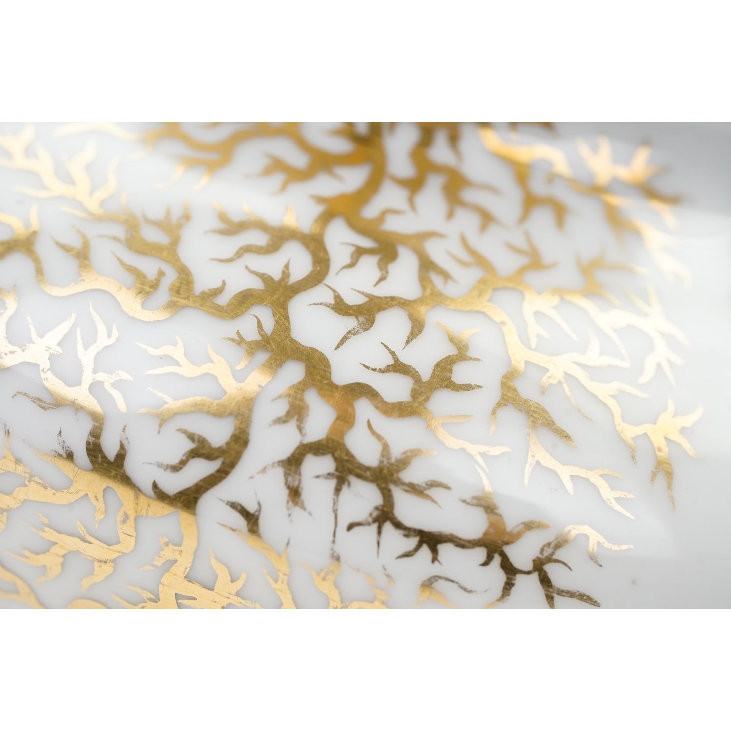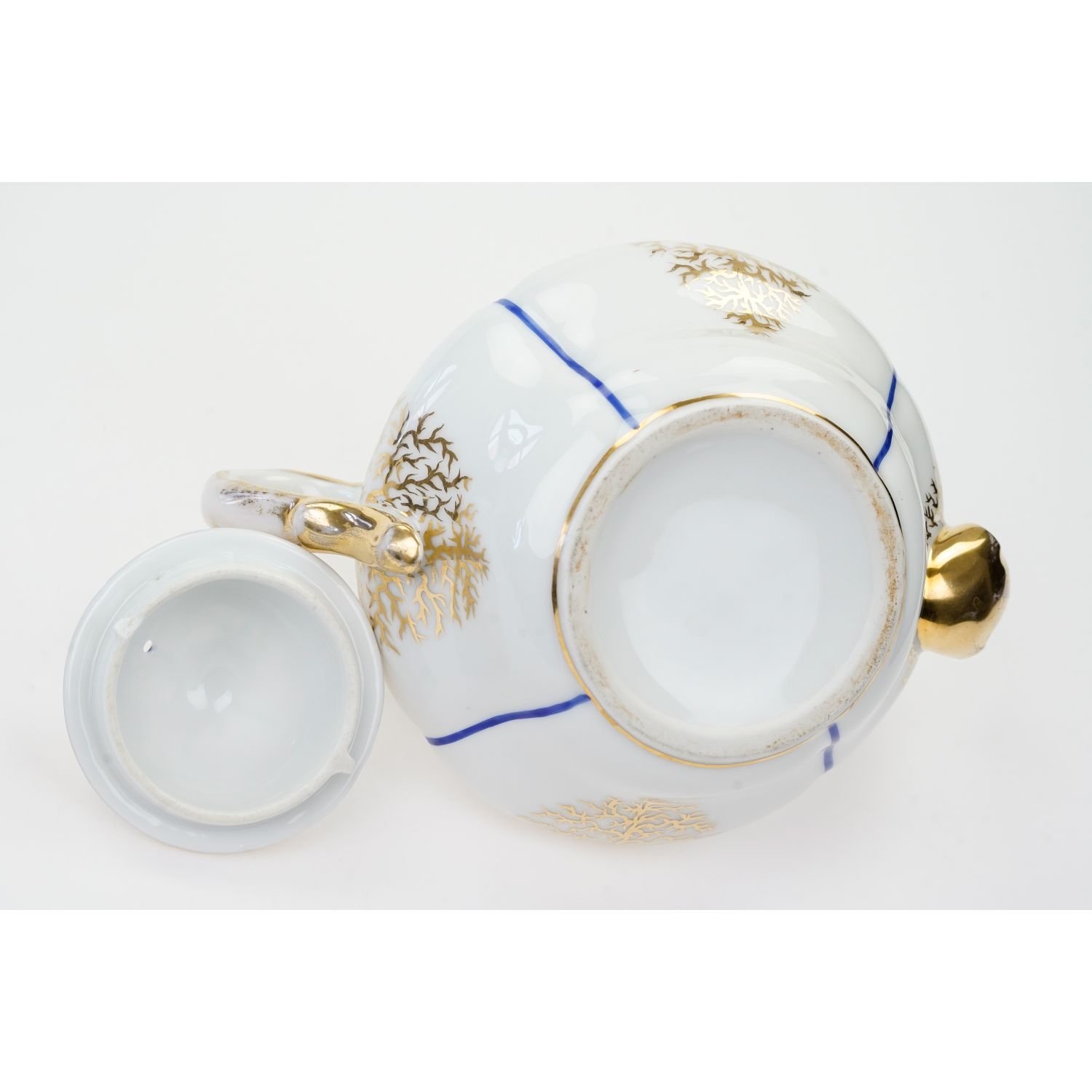 Nie posiada sygnatury. Dzbanek na korpusie ma złote ornamenty i szafirowe, pionowe paski. Sterczynka w kształcie gruszki, złocona. ze złoceniami na uszkach i sterczynce. Ucho w formie gałązki złocone tak jak i kontury. Czajnik prezentuje się pięknie i elegancko.