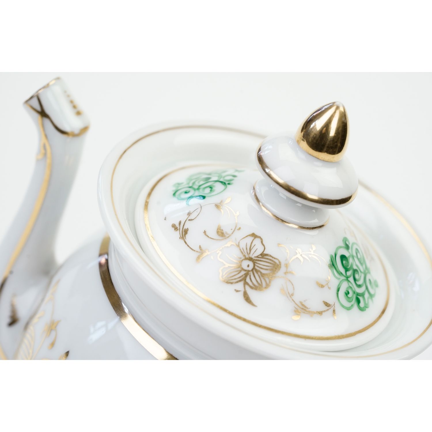Nie posiada sygnatury. Dzbanek na korpusie ma złote i zielone ornamenty kwiatowe ręcznie malowane. Sterczynka złocona. Ze złoceniami na uszkach i sterczynce. Dzbanek prezentuje się pięknie i elegancko.