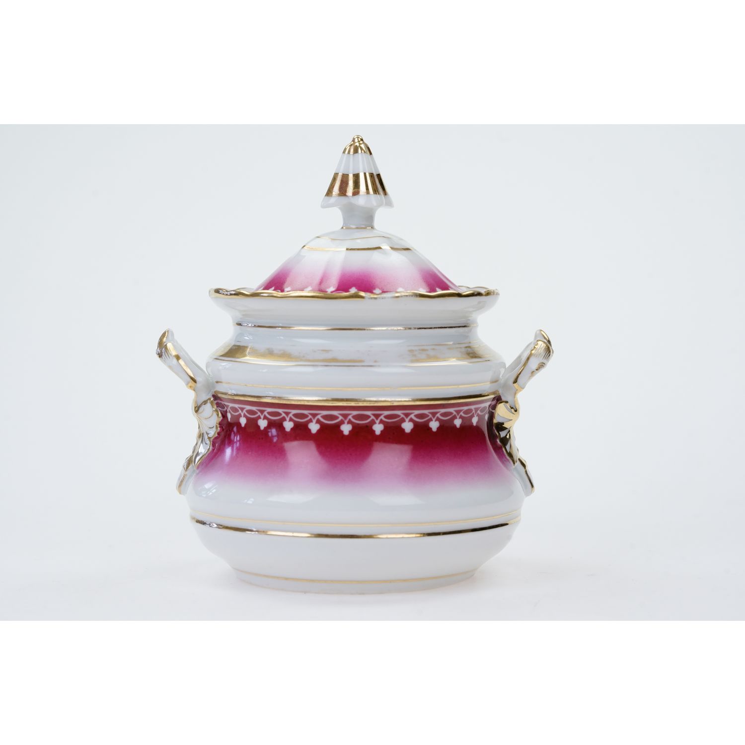 Niezwykle okazała, solidnych rozmiarów. Wykonana na przełomie XIX i XX wieku. Wyjątkowa. Nie ma sygnatury jedynie jakieś żłobienia w masie. Porcelana w kolorze białym. Na niej malinowa, cieniowana malatura i złote opaski. Złocone są też kontury. Uchwyt pokrywy został pięknie wyprofilowany i przybrał kształt stożka. Pięknie uformowane uszy z roślinnymi reliefami zostały pokryte złotą malaturą.