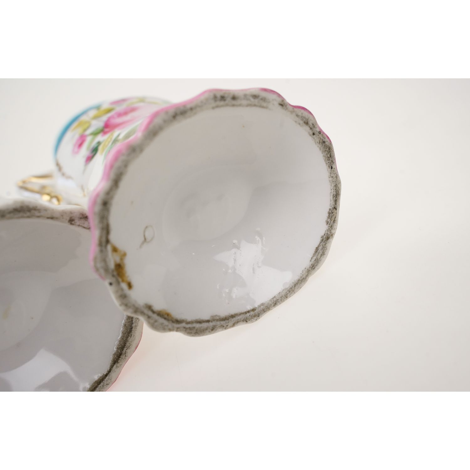 Nie posiadają sygnatury. Posiadają jedynie jakieś nieczytelne żłobienia w masie. Wykonane z dość grubej, pięknie dekorowanej porcelany w odcieniu bieli. Śliczny kształt z ażurowymi, cudownymi uszami. Od frontu na każdym duży bukiet róż ręcznie malowany (dekoracja jednostronna). U góry turkusowa malatura, u dołu różowa. Wszystko okraszone złoceniami
