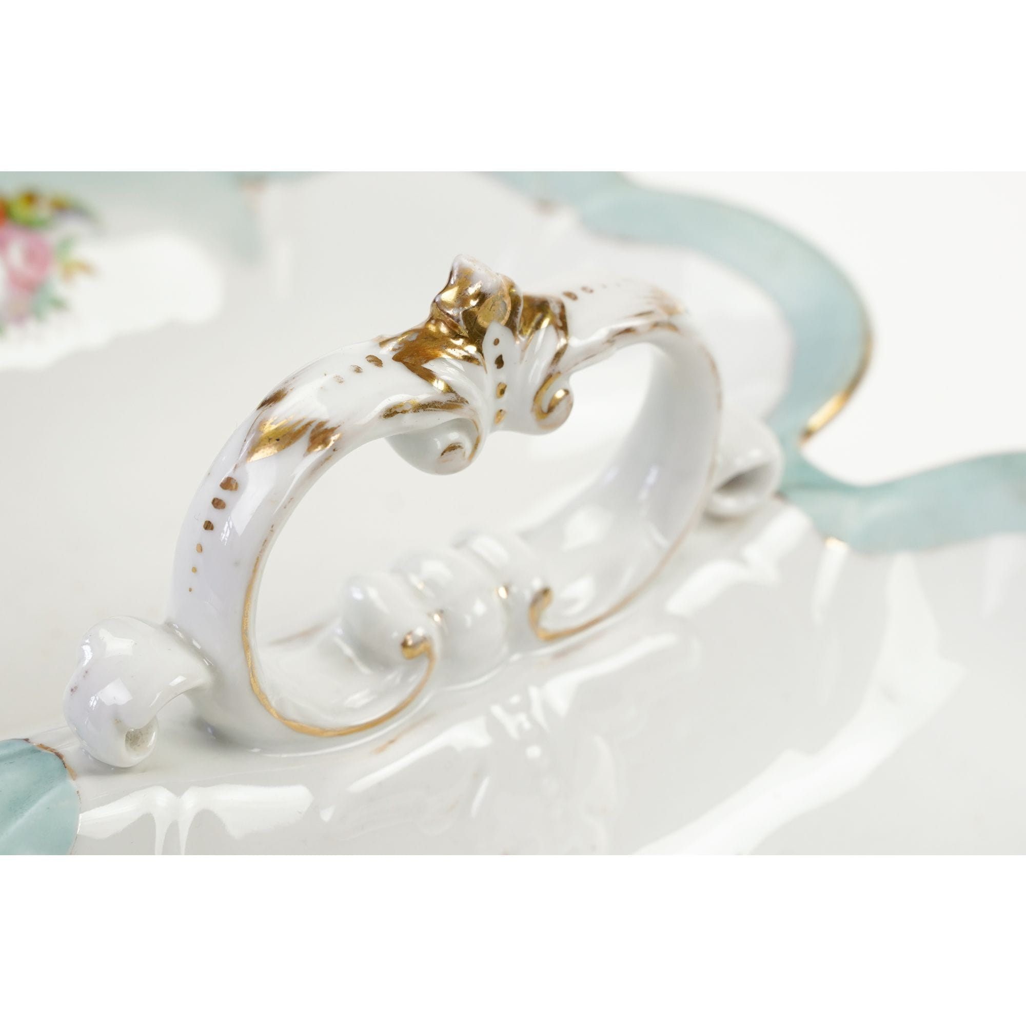 Nie jest sygnowany. Śląsk? Biała, gruba w stylu epoki, porcelana, pięknie wymodelowana. Ręcznie formowany uchwyt Z liściem na szczycie i u podstawy, podkreślone złoceniami. W każdej misie ręcznie malowane kolorowe bukiety kwiatów. Rant z niebieskim, turkusowym szlaczkiem w złotych obwódkach, trochę już poprzecieranym.