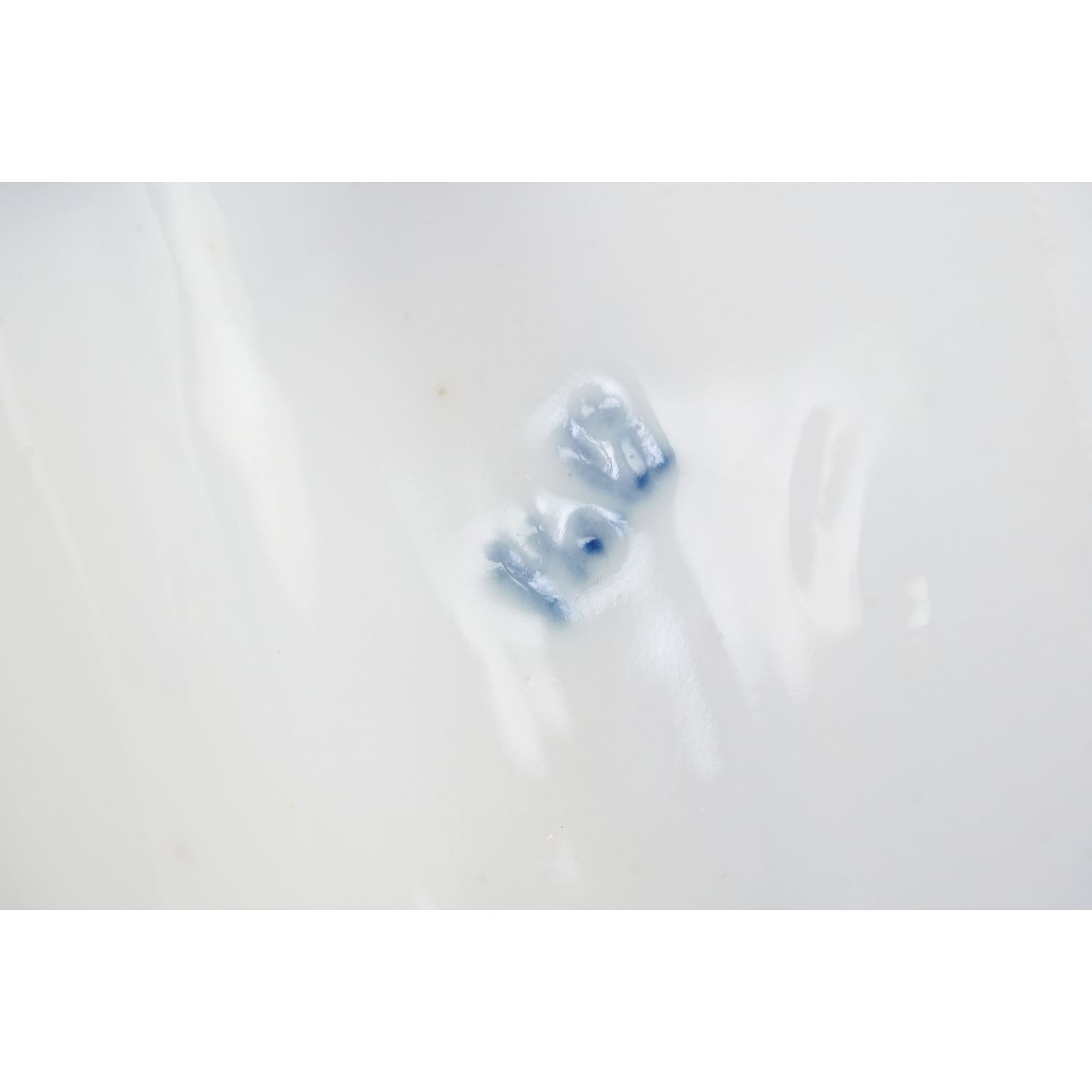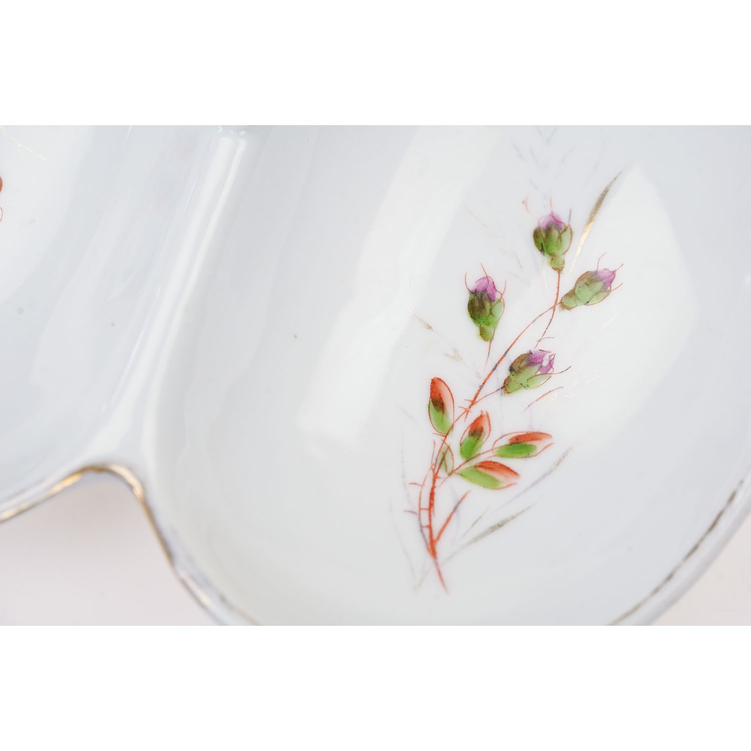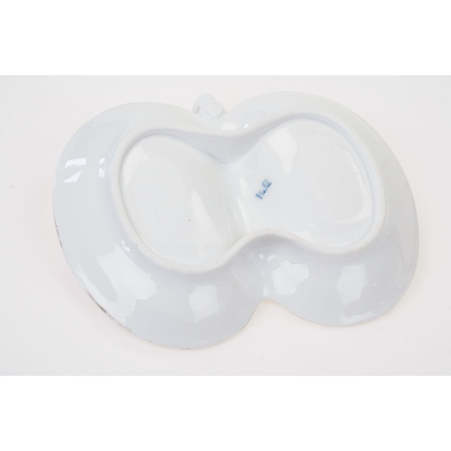 Pochodzi z Danii z wytwórni Bing & Grøndahl, która została założona w 1853 roku przez rzeźbiarza Frederika Vilhelma Grøndahla i braci kupców Meyera Hermanna Binga i Jacoba Hermana Binga. Oferowana patera jest sygnowana najstarszą sygnaturą manufaktury stosowaną od 1853 do 1894 roku. Porcelana dość solidna, typowa dla epoki. Na lustrze obu części ręcznie malowane bukieciki z pąkami róż. Krawędź była wykończona złoceniem, które obecnie jest dzisiaj prawie zupełnie przetarte.