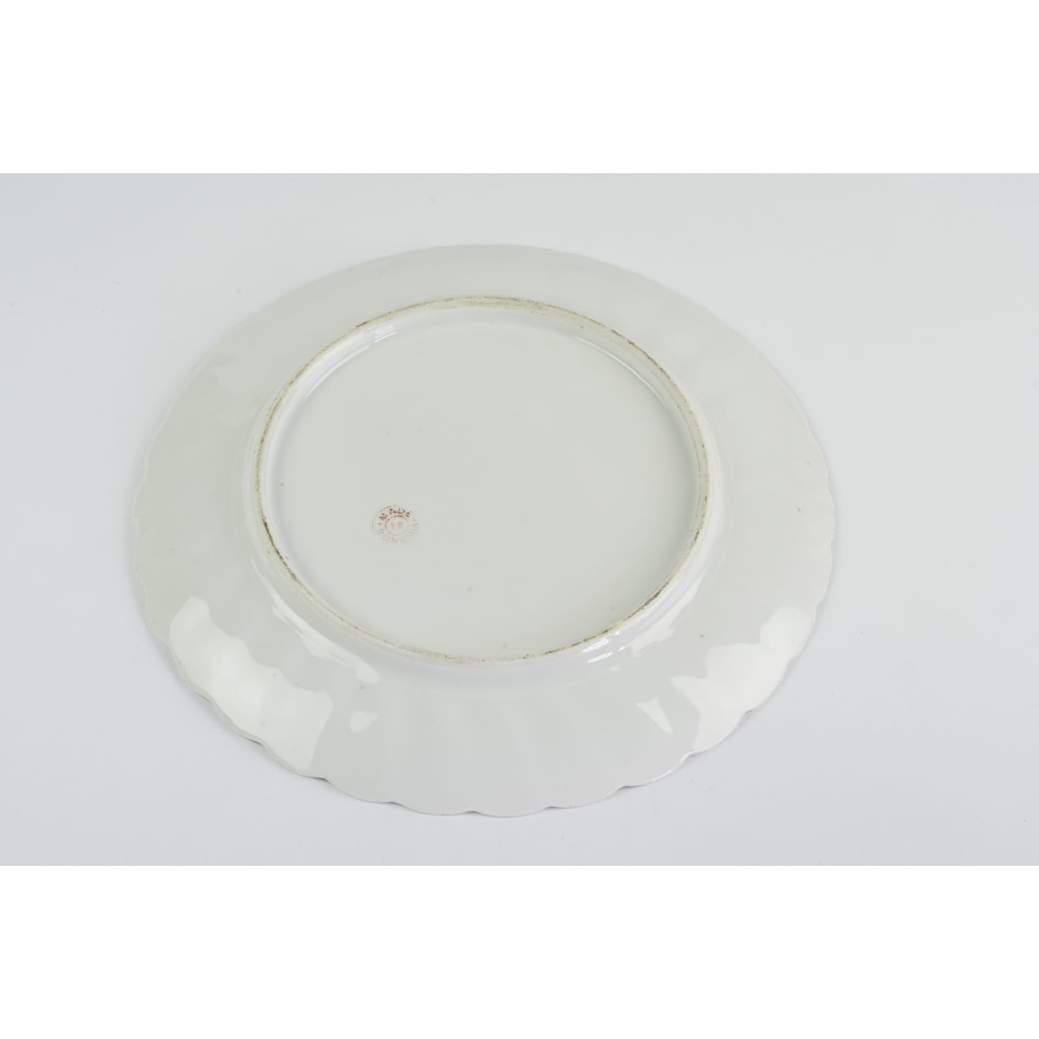 Pochodzi z Bohemii, sygnowana jak na zdjęciu. Wykonana z białej porcelany z ukośnym kanelowaniem na kołnierzu. Lustro pokryte waniliową malaturą, która ciemnie ku krawędziom niemal do brązu. Na paterce, gustowna, ręcznie malowana dekoracja o motywie kwiatowym, dopasowanym kolorystycznie do całości. Kołnierz oprószony złotem.