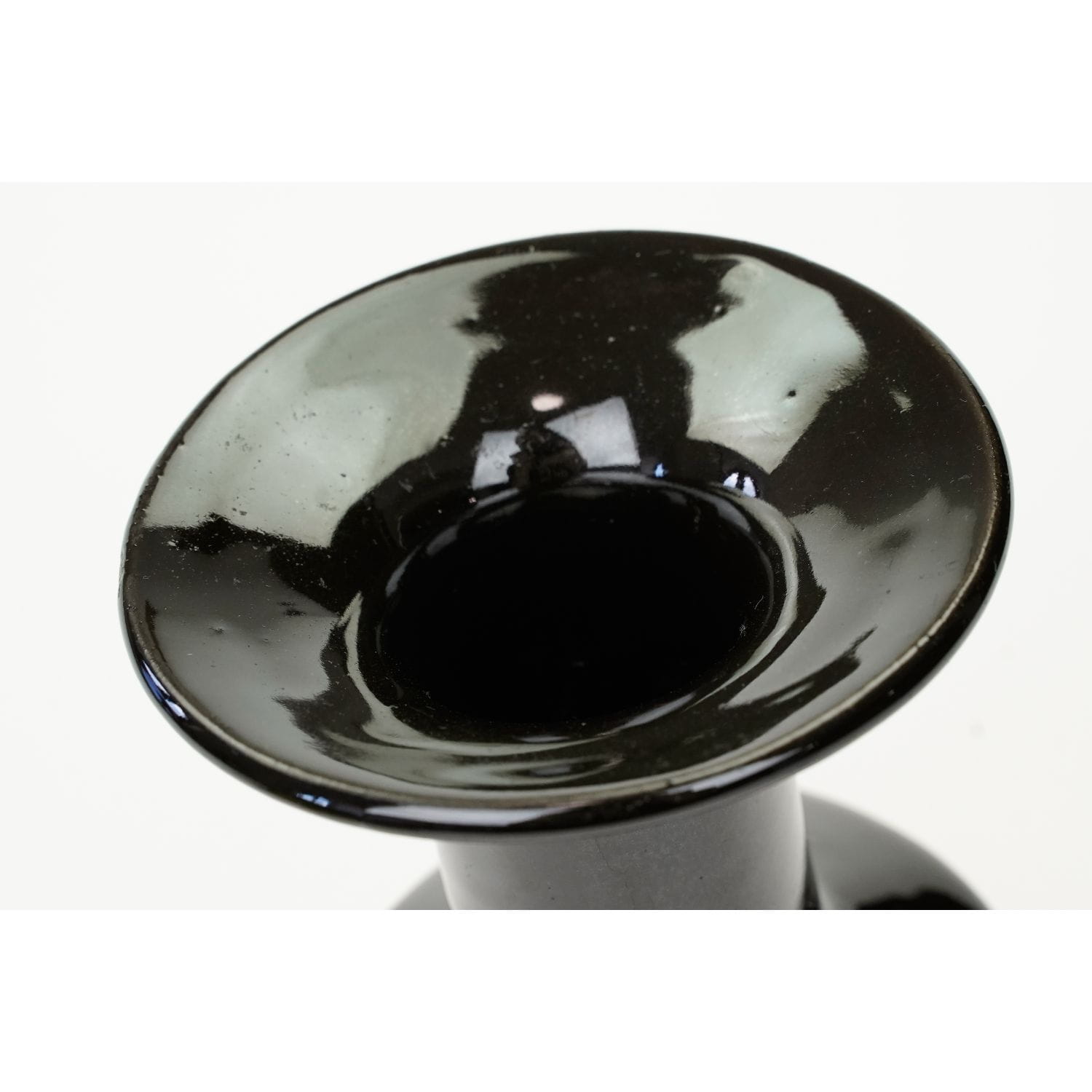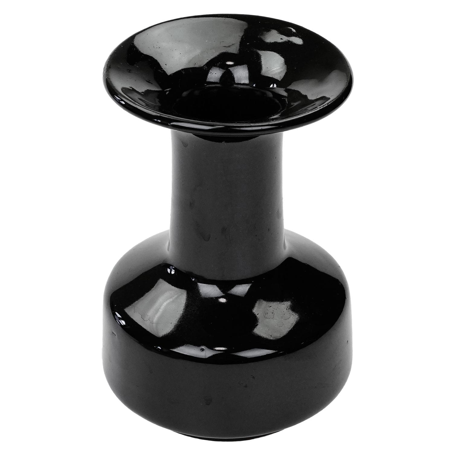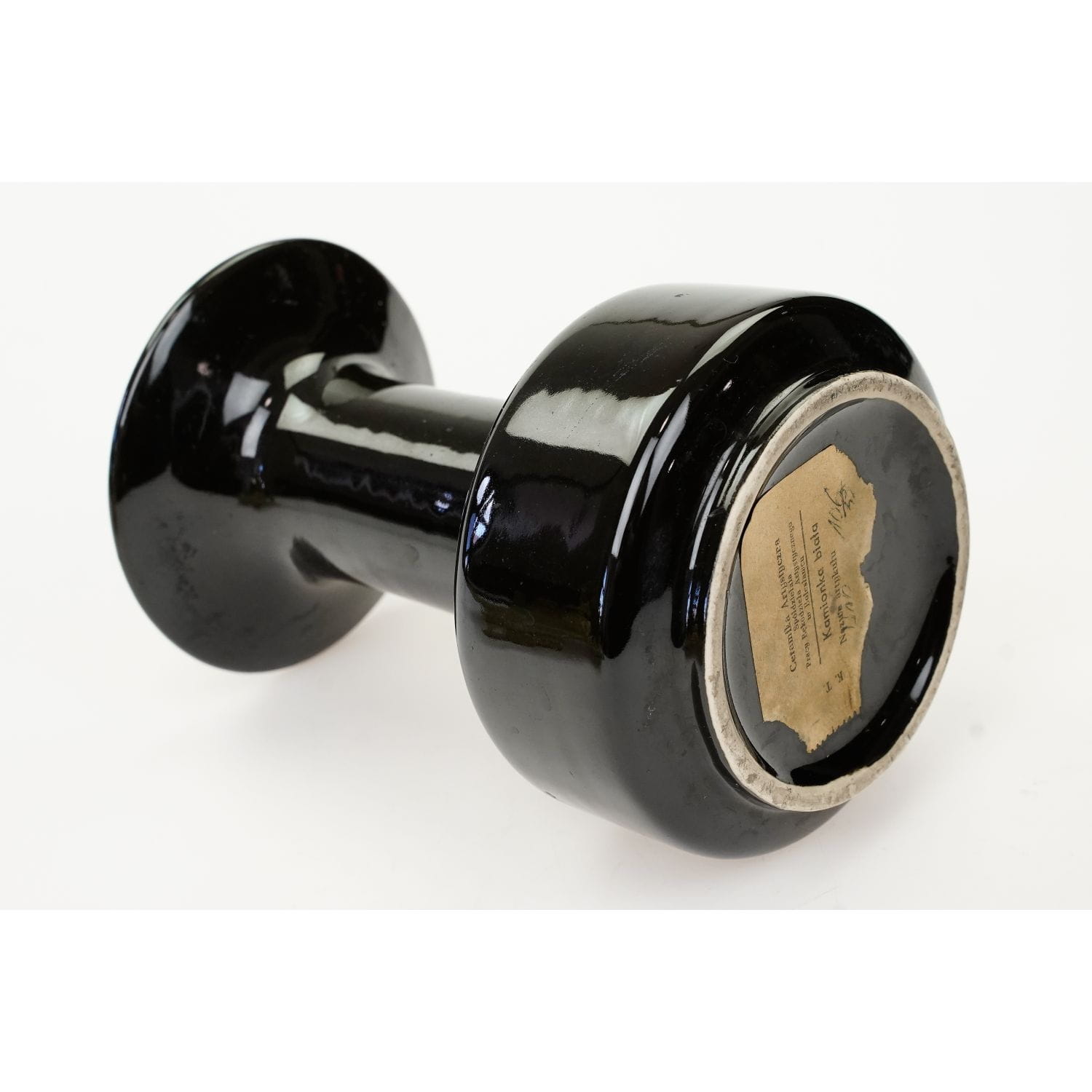 Wydaje mi się, że autorem projektu jest Pan Bronisław Wolanin w latach lata 80- tych. Sygnowany jedynie fragmentem papierowej naklejki. Odlewany w formie. Forma nietypowa z pękatym brzuścem w dolnej części z dłuższą szyją i kołnierzem wywiniętym na zewnątrz. Połyskliwe szkliwo w kolorze czarnym.