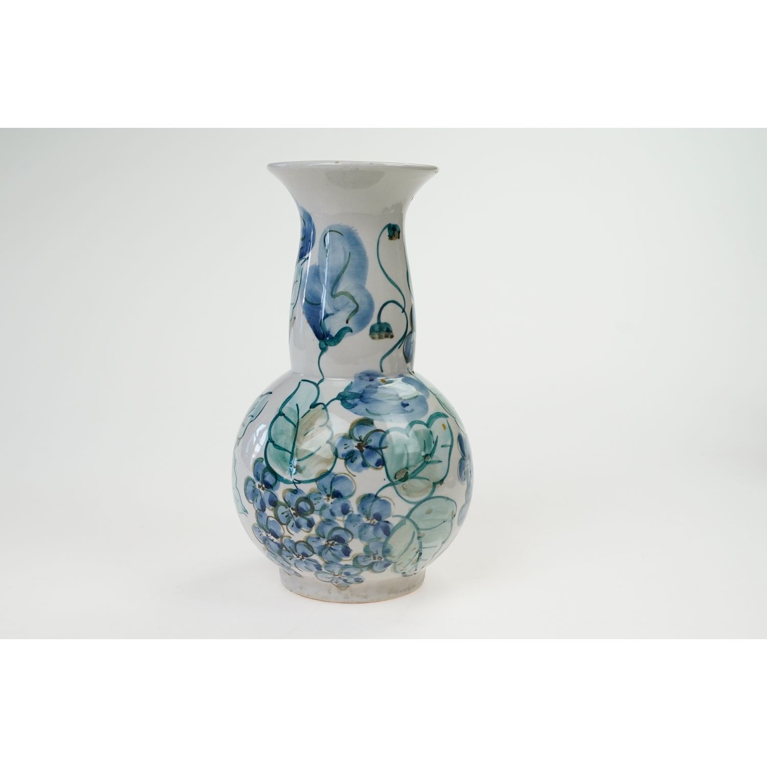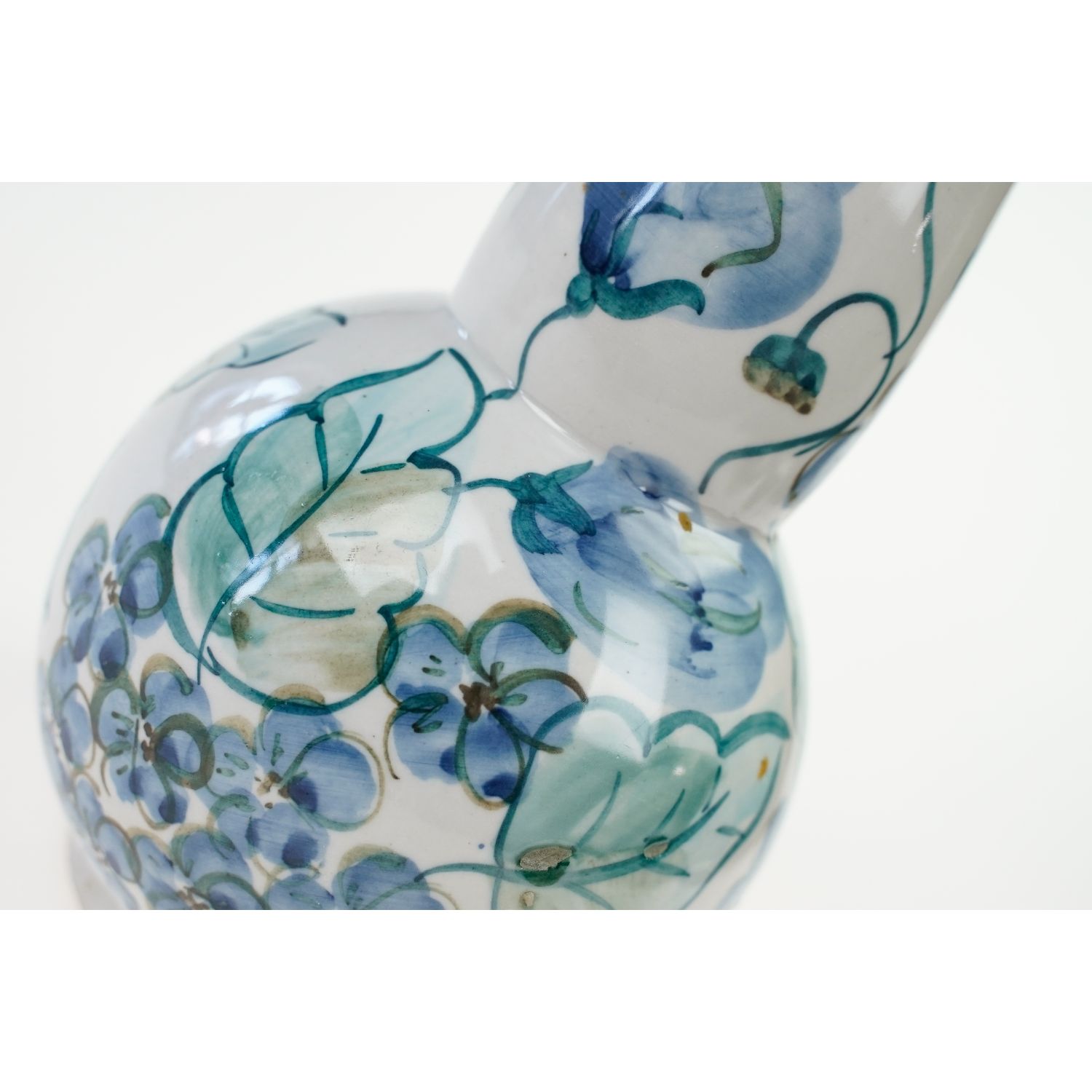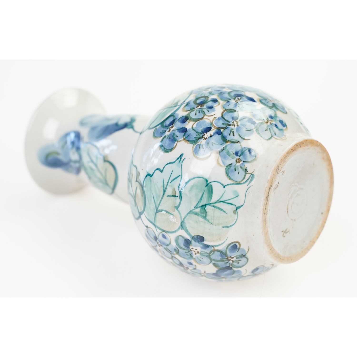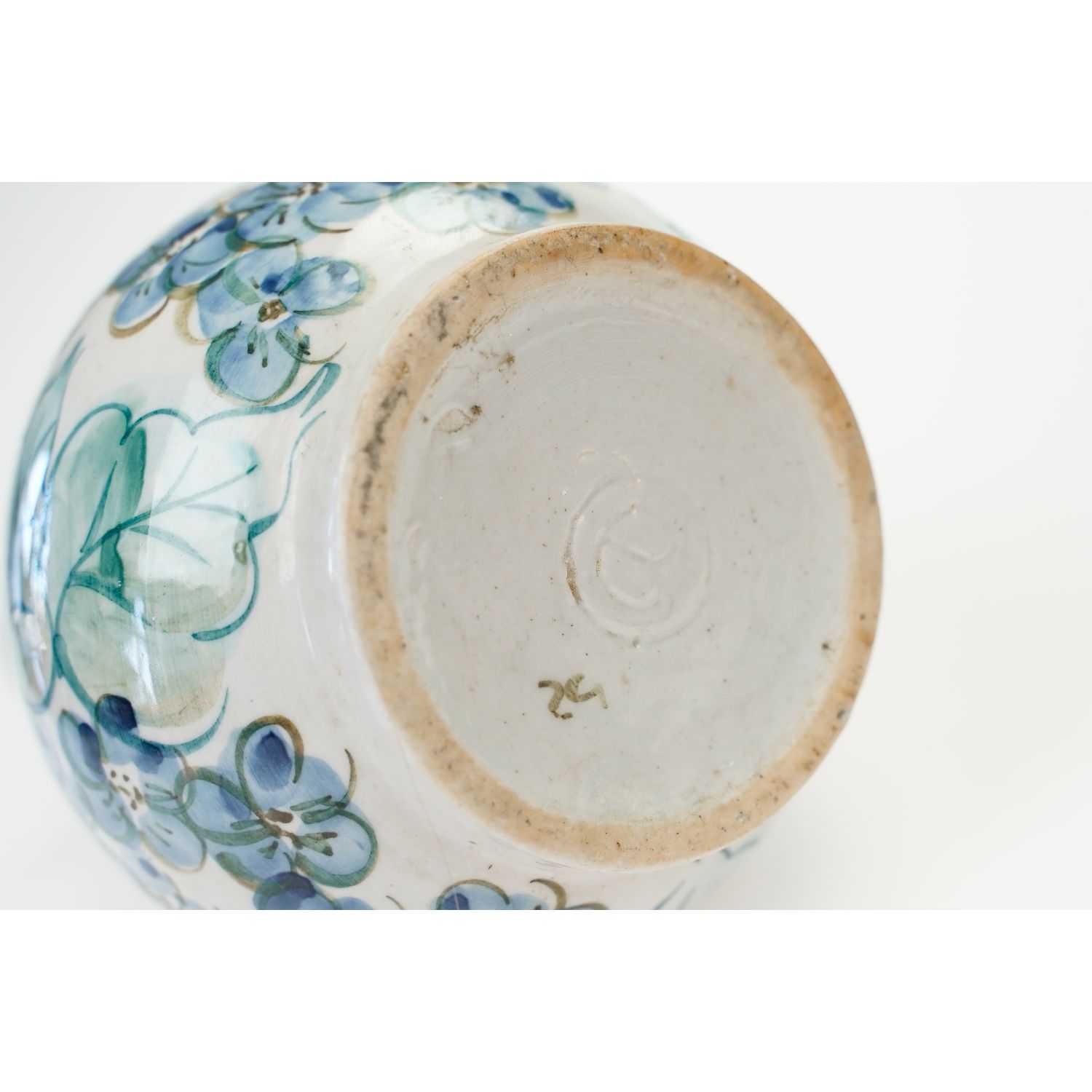 Ceramika zdobiona kobaltowym motywem kwiatowym z dodatkiem zieleni i błękitu na szaro-kremowym tle. Przedmiot ręcznie formowany i dekorowany. Ciekawy kształt.