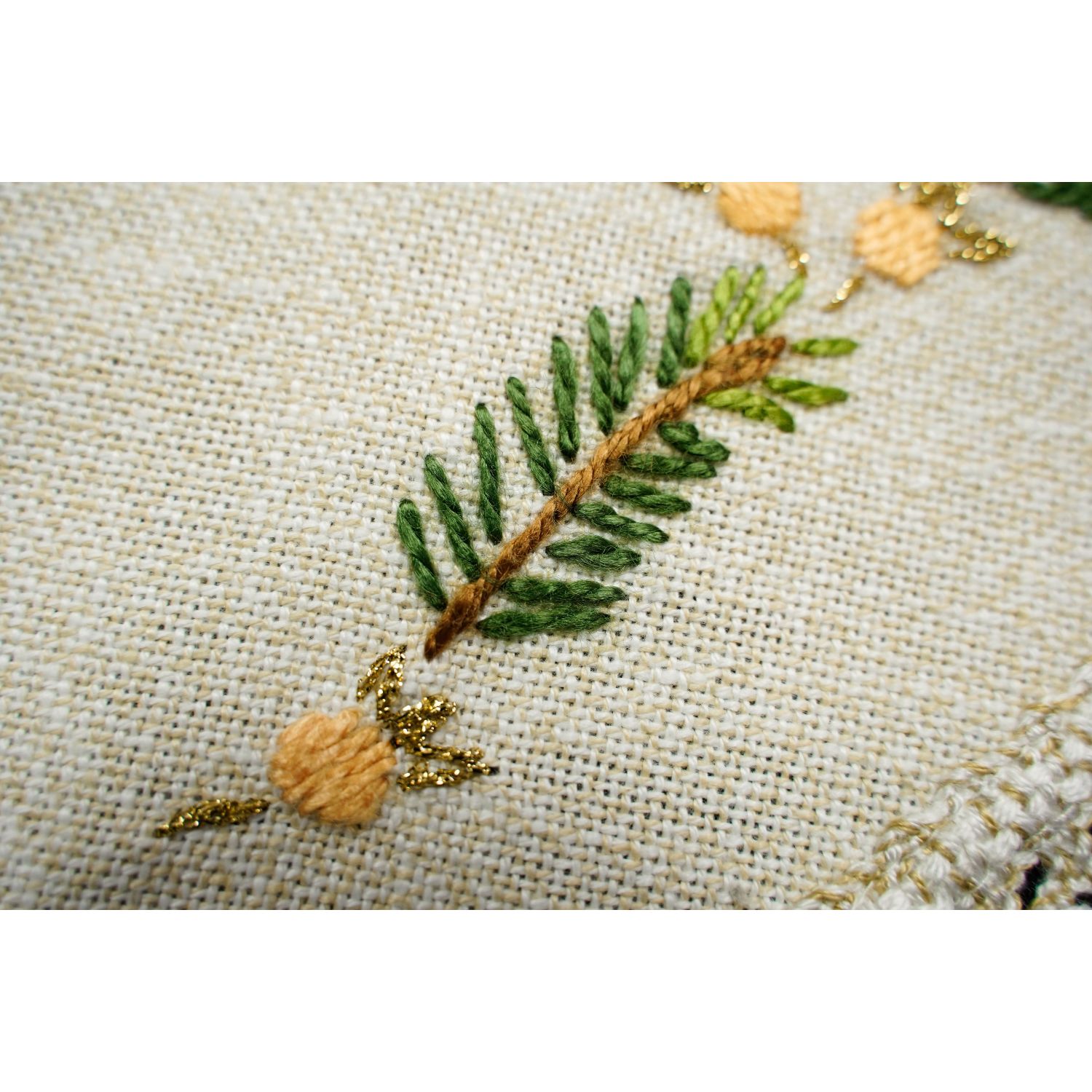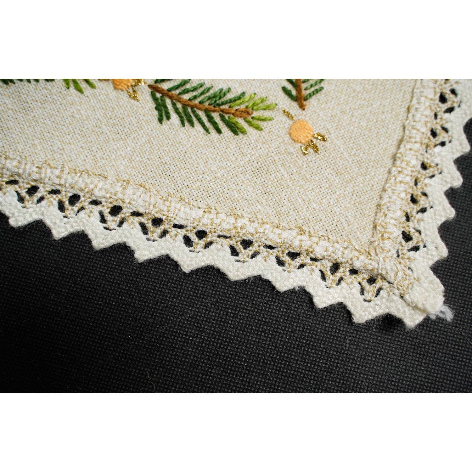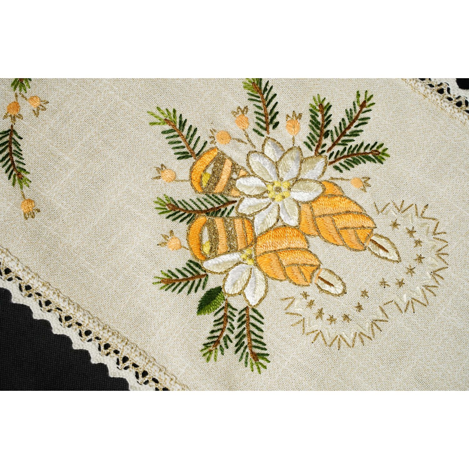 Lniana, ale z jakimś dodatkiem, obrus bogato dekorowany wypukłymi, barwnymi haftami o motywie świątecznym. Wokół brzegów przepiękna dwubarwna, szeroka, pasmanteryjna koronka.