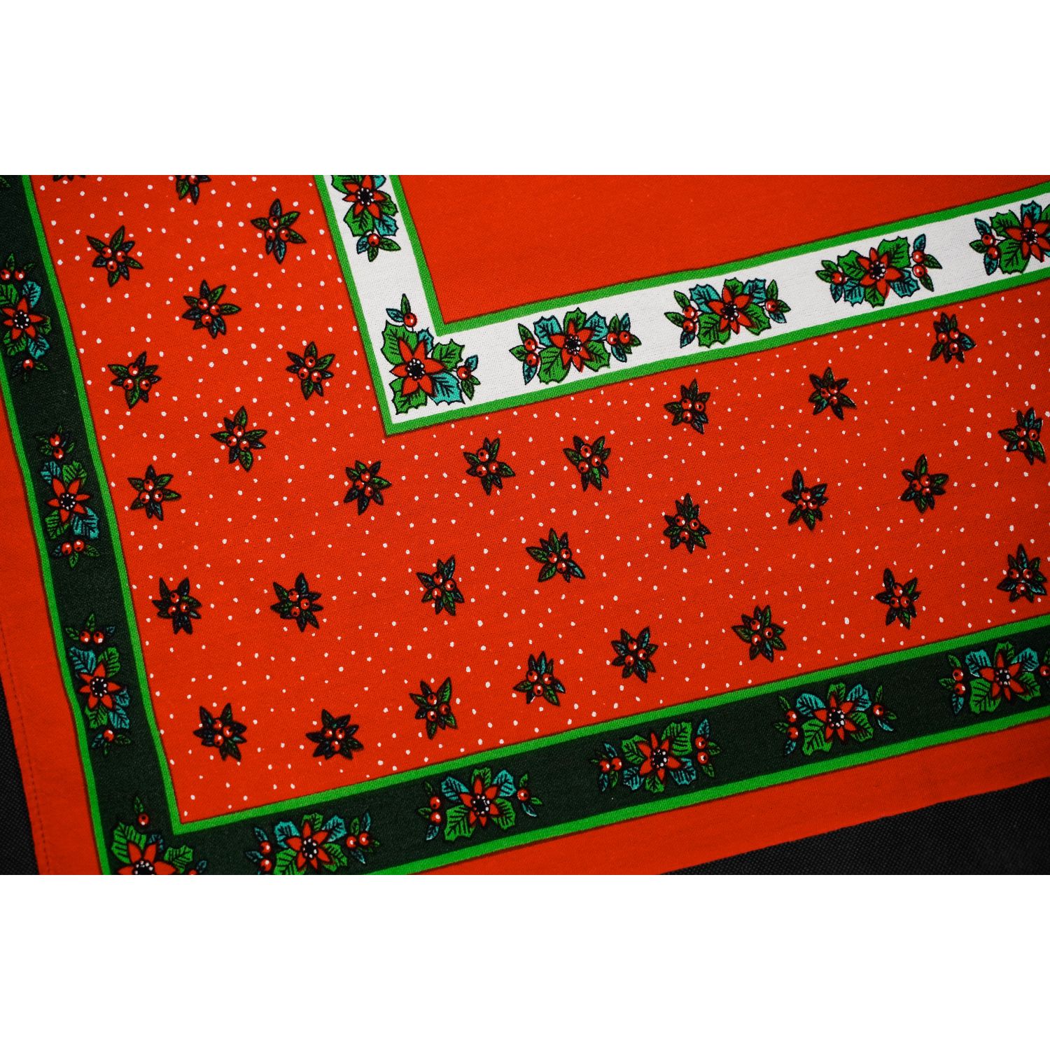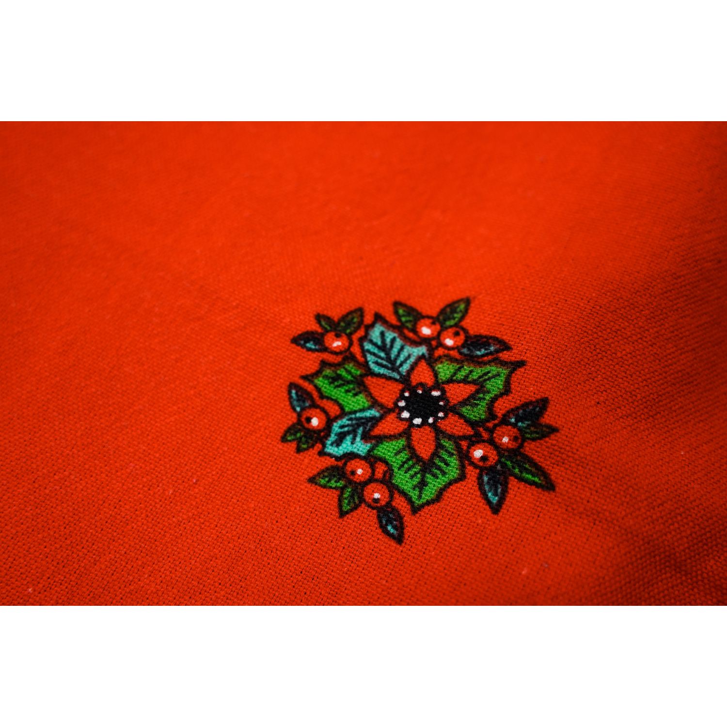 Bardzo przyjemny obrus ze świątecznymi nadrukami z przewagą czerwieni z zielonymi dekoracjami.