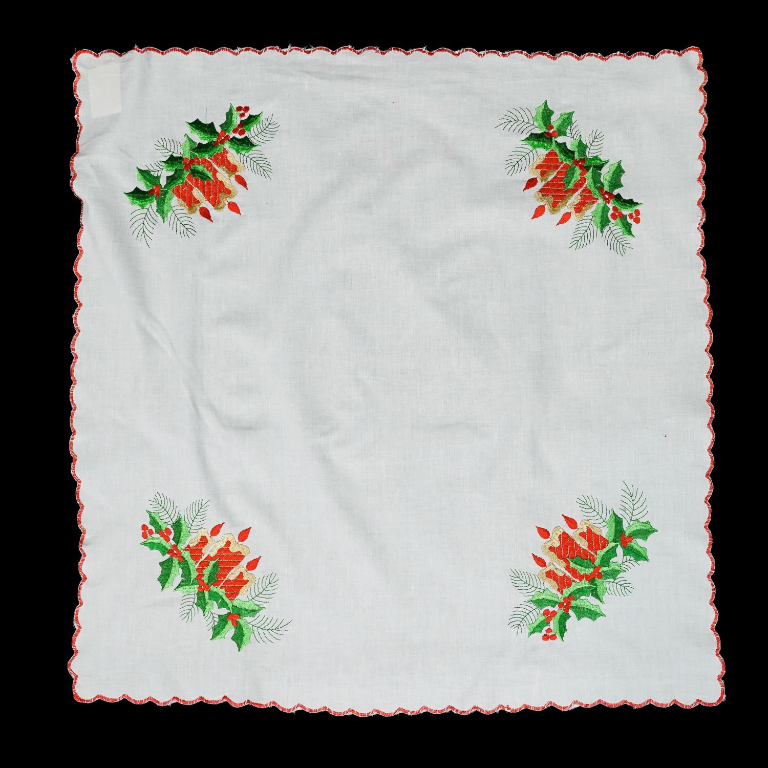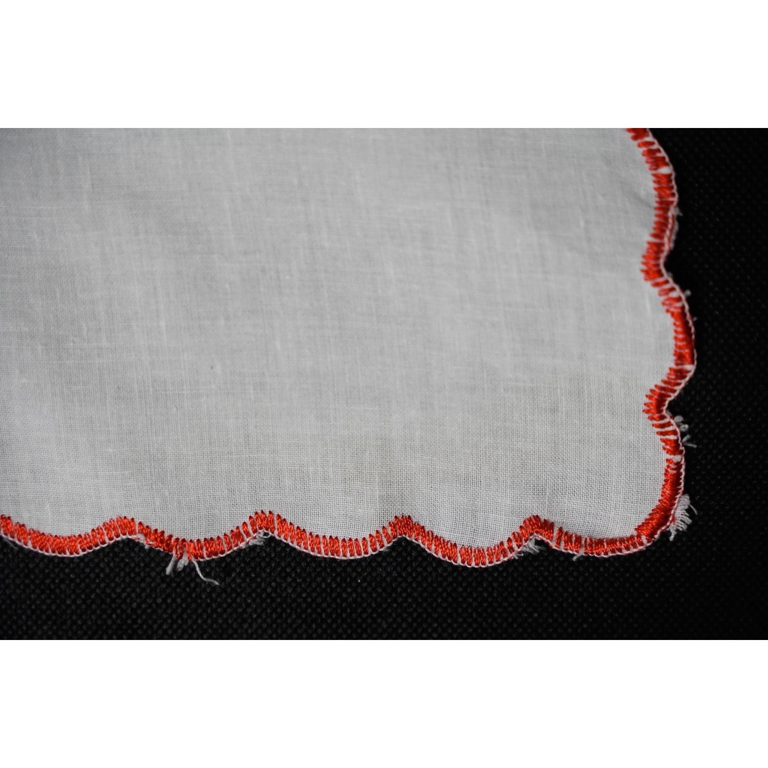 Tkanina bawełniana, biała. Na narożnikach kolorowe hafty maszynowe. Dookoła obszyty czerwonym kordonkiem.