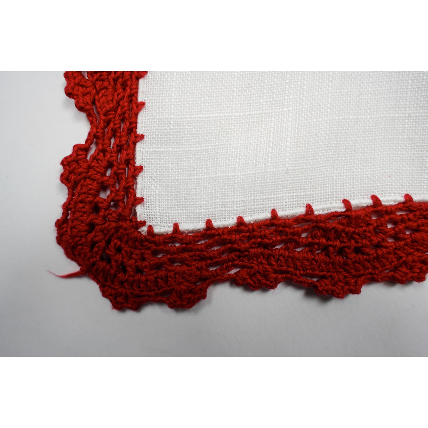 Tkanina biała z jakimś sztucznym dodatkiem. Na narożnikach kolorowe hafty maszynowe. Dookoła koronka szydełkowa wykonana z czerwonego kordonka.