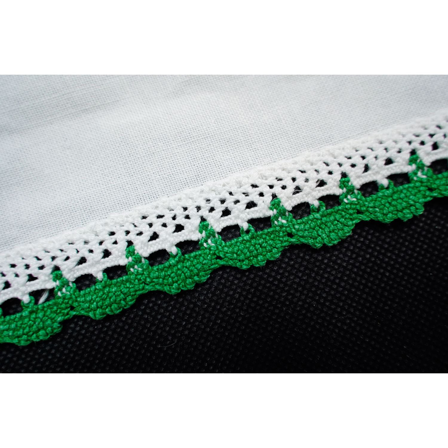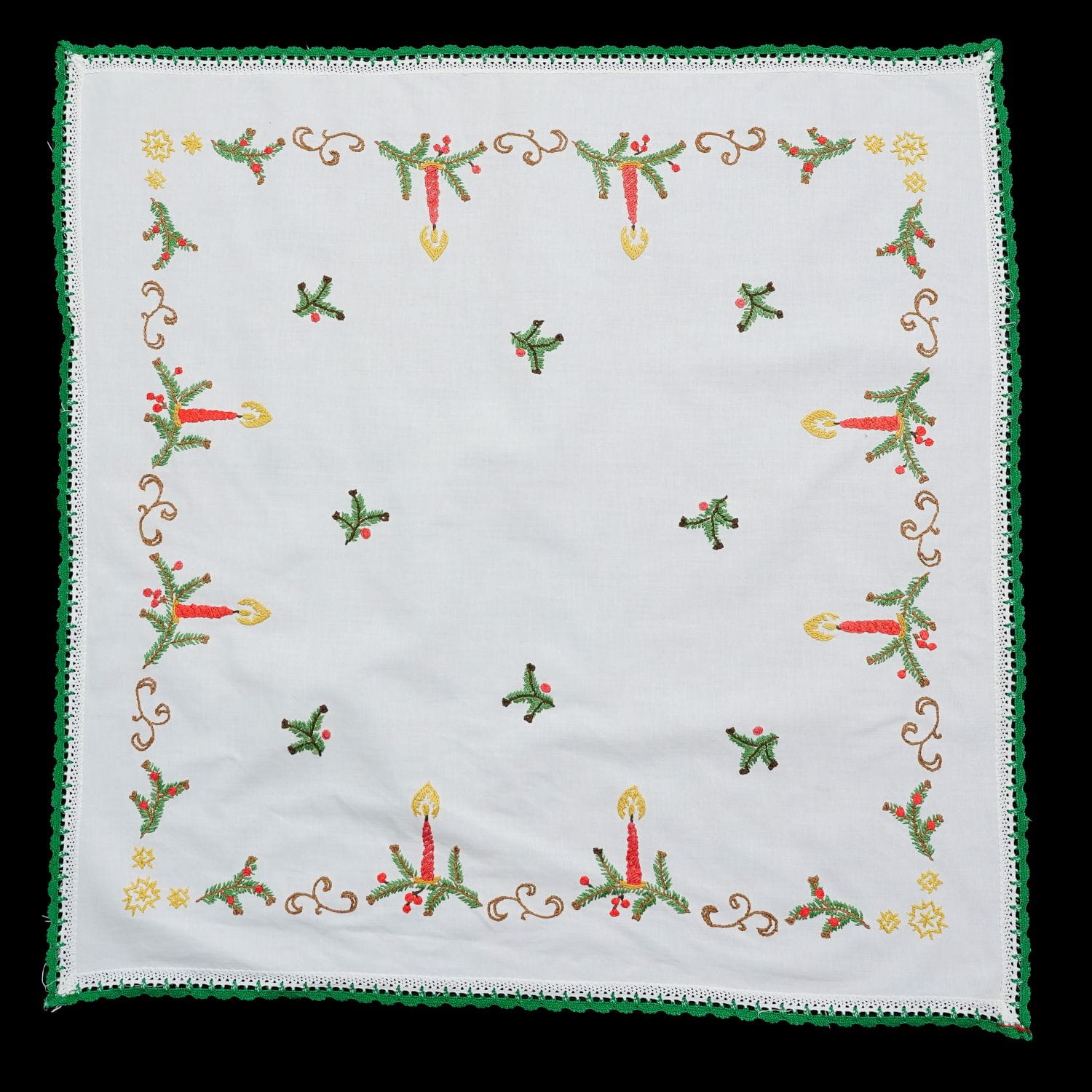 Na białym solidnym płótnie wyszywane motywy bożonarodzeniowe w klasycznych barwach: brąz, czerwień, zieleń i żółć. Dookoła doszyta zielon-biała, bawełniana koronka. Hafty ręczny.
