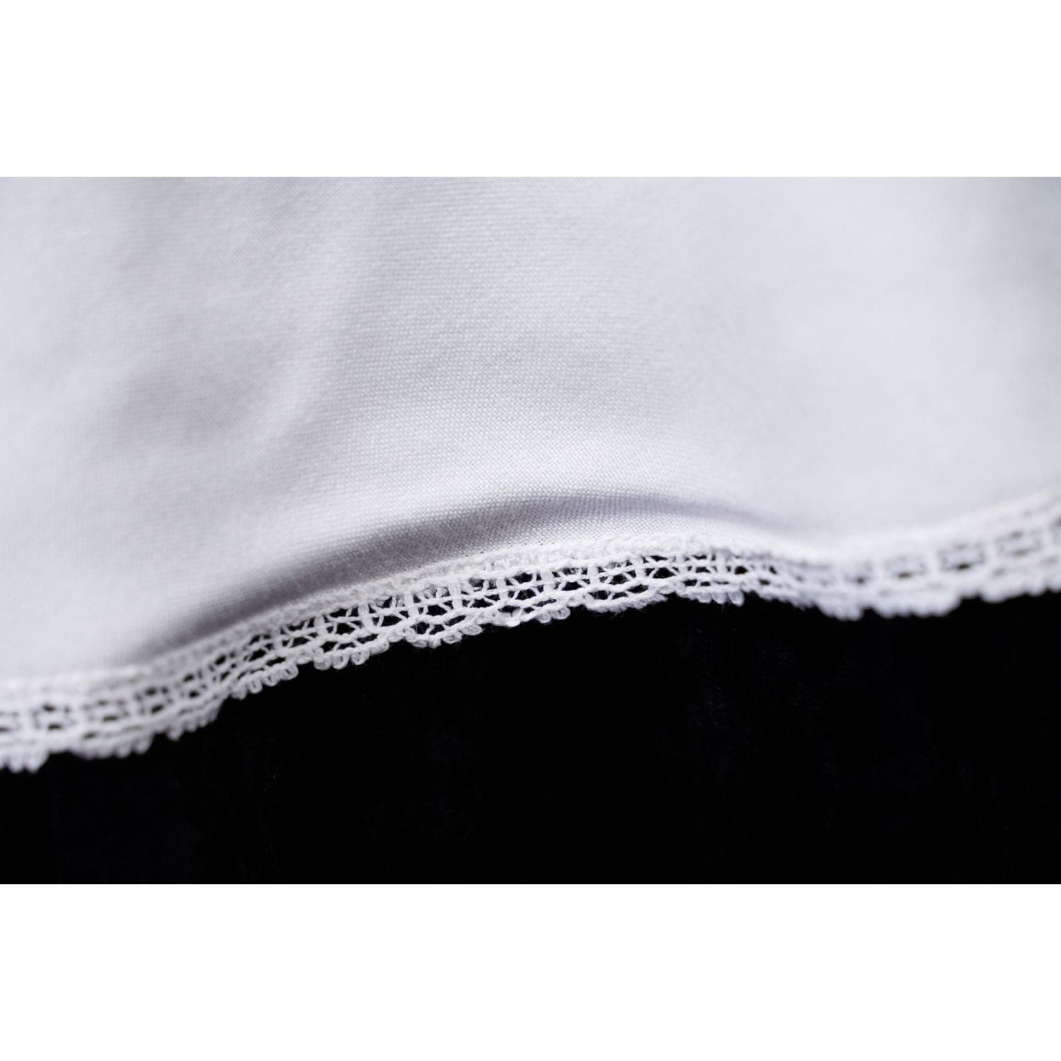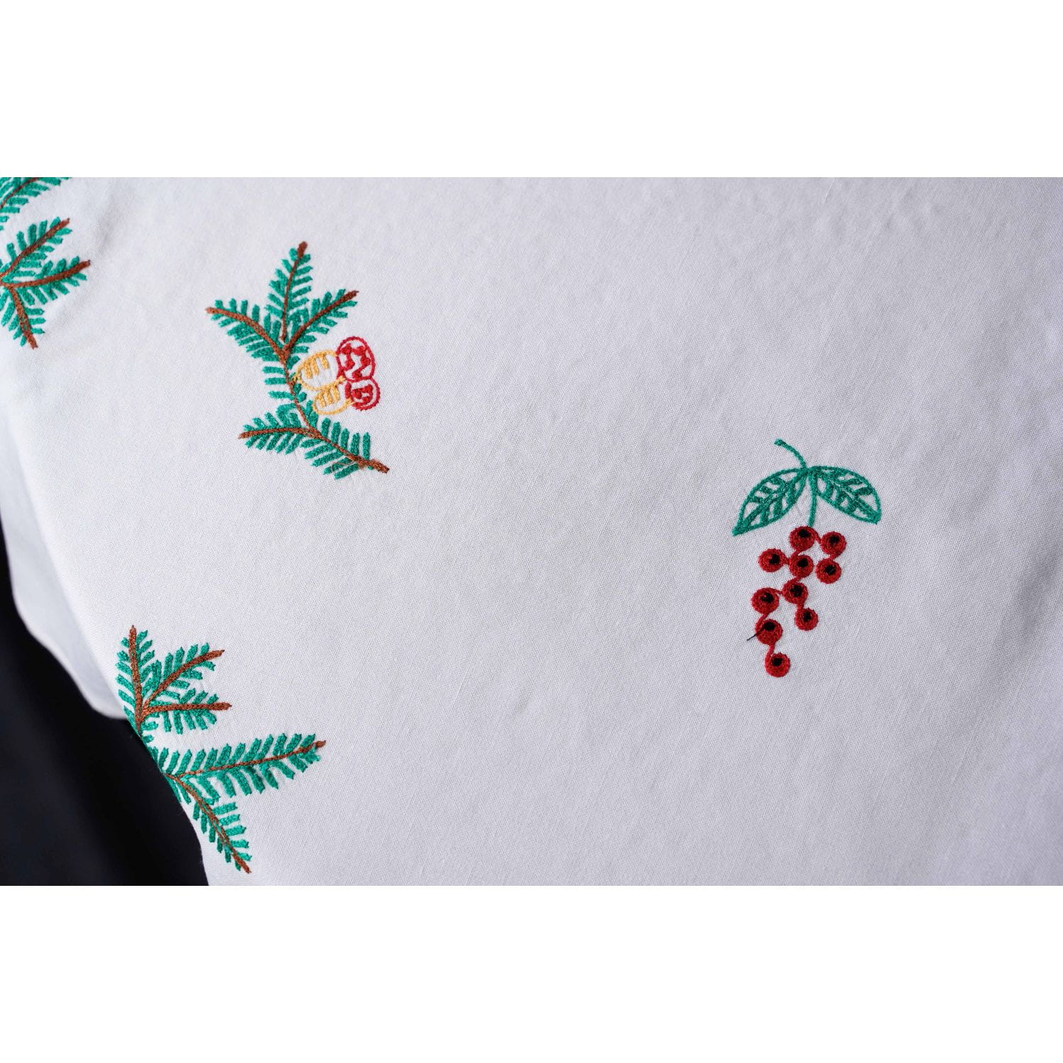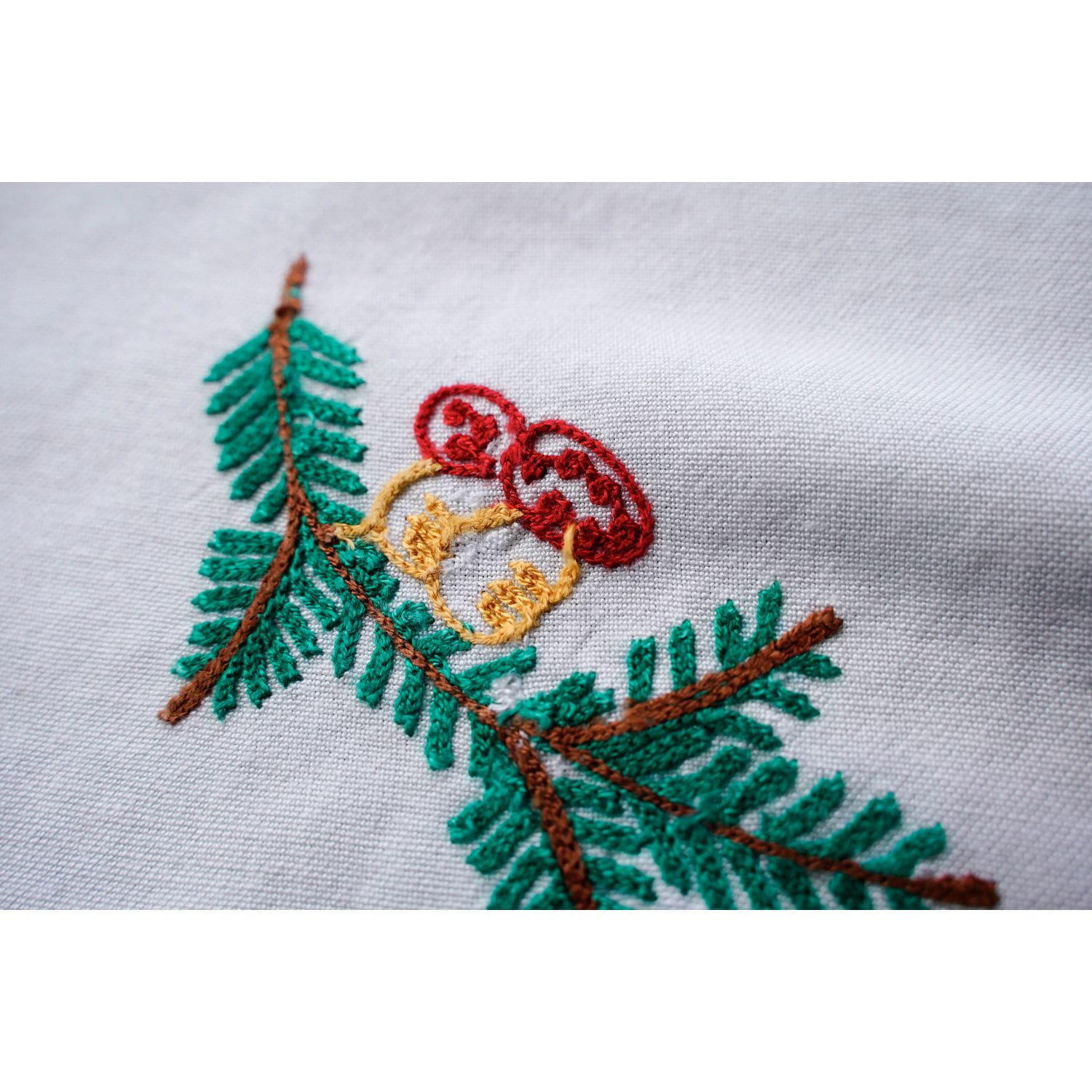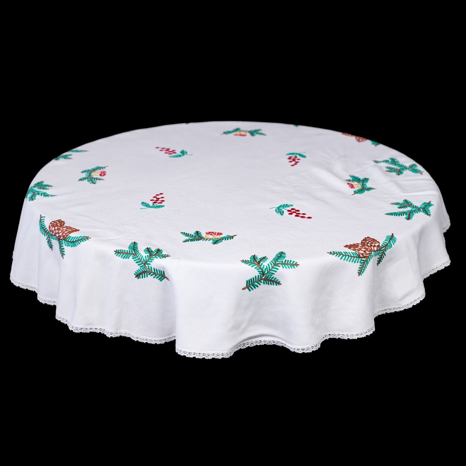 Wykonany z bawełnianej, białej tkaniny. Na niej ręcznie wyszywane motywy bożonarodzeniowe. Dookoła obszyta pasmanteryjną koronką w kolorze białym.