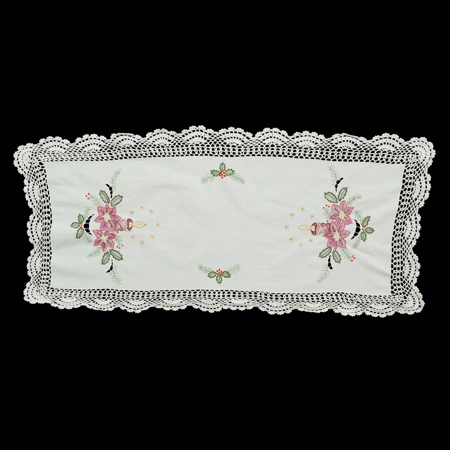 BOŻE NARODZENIE WYSZYWANY BIEŻNIK I KORONKA SZYDEŁKOWA MOTYWY ŚWIĄTECZNE 94 X 41 CM