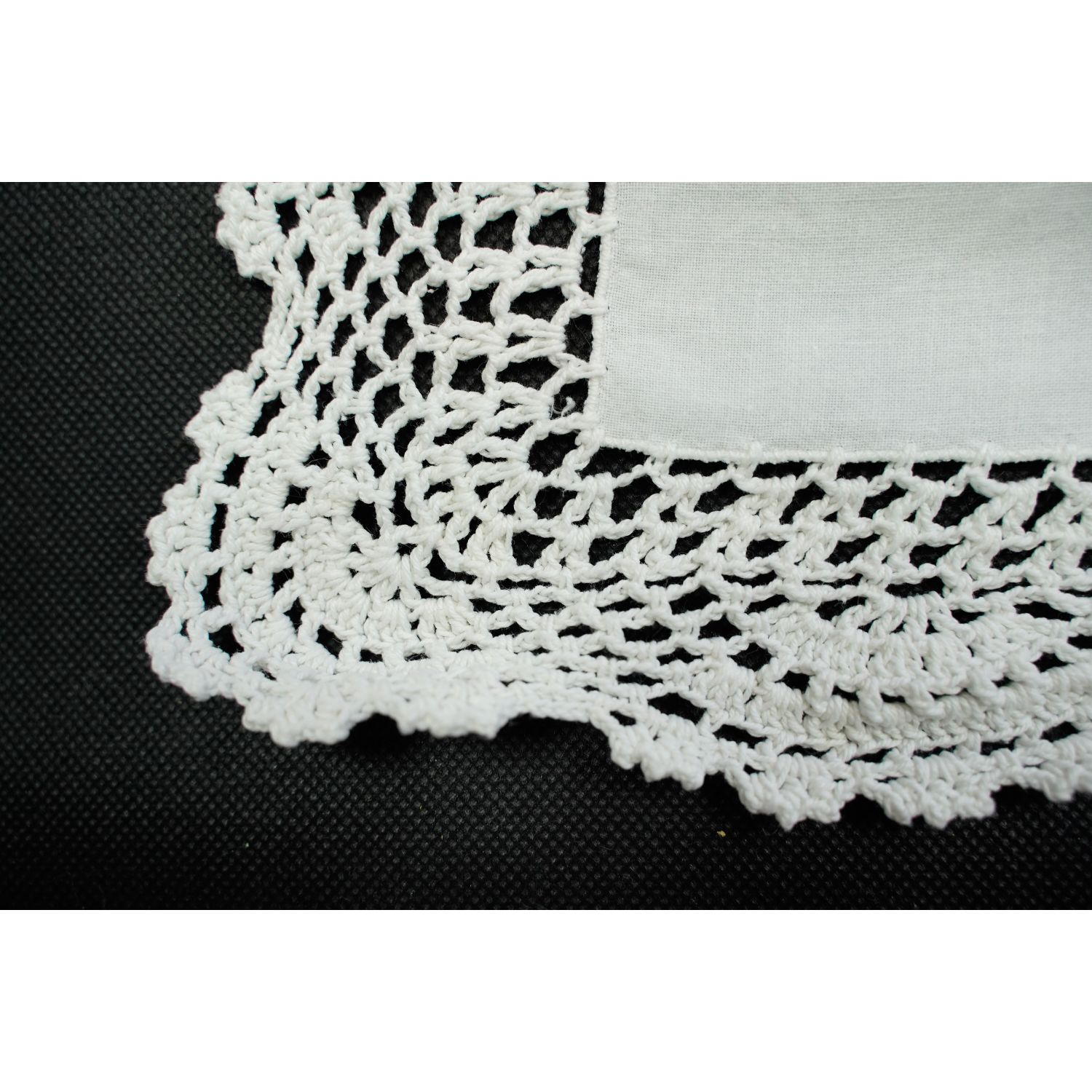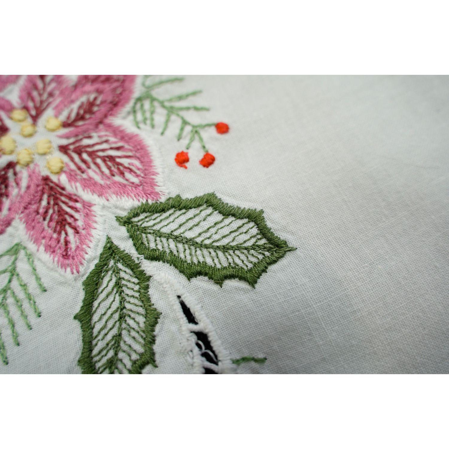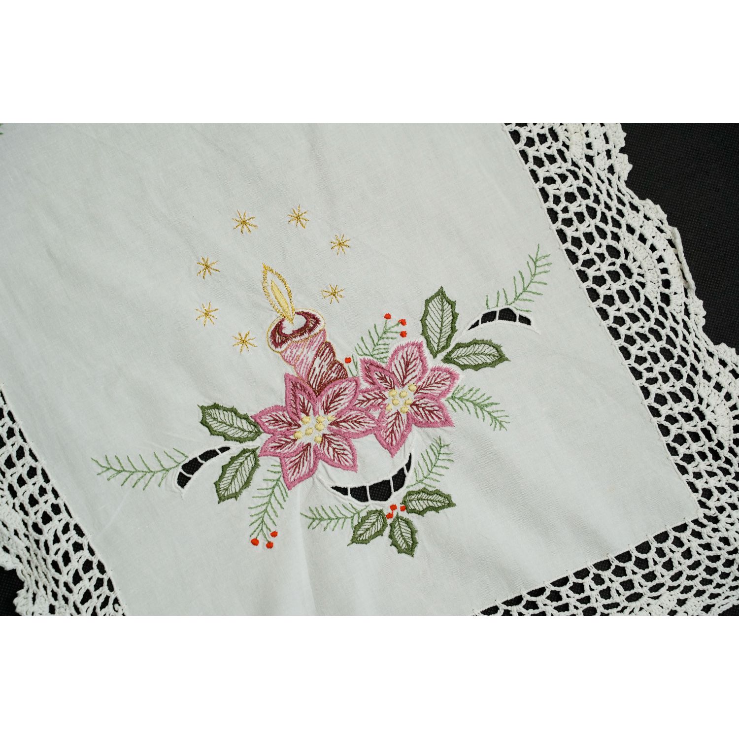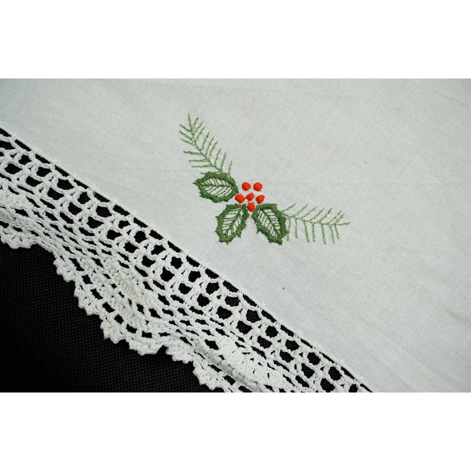 Tkanina płócienna odcieniu bieli. Na niej wyszywane, barwne motywy świąteczne. Haft maszynowy. Dookoła szydełkowa, biała koronka koronka.