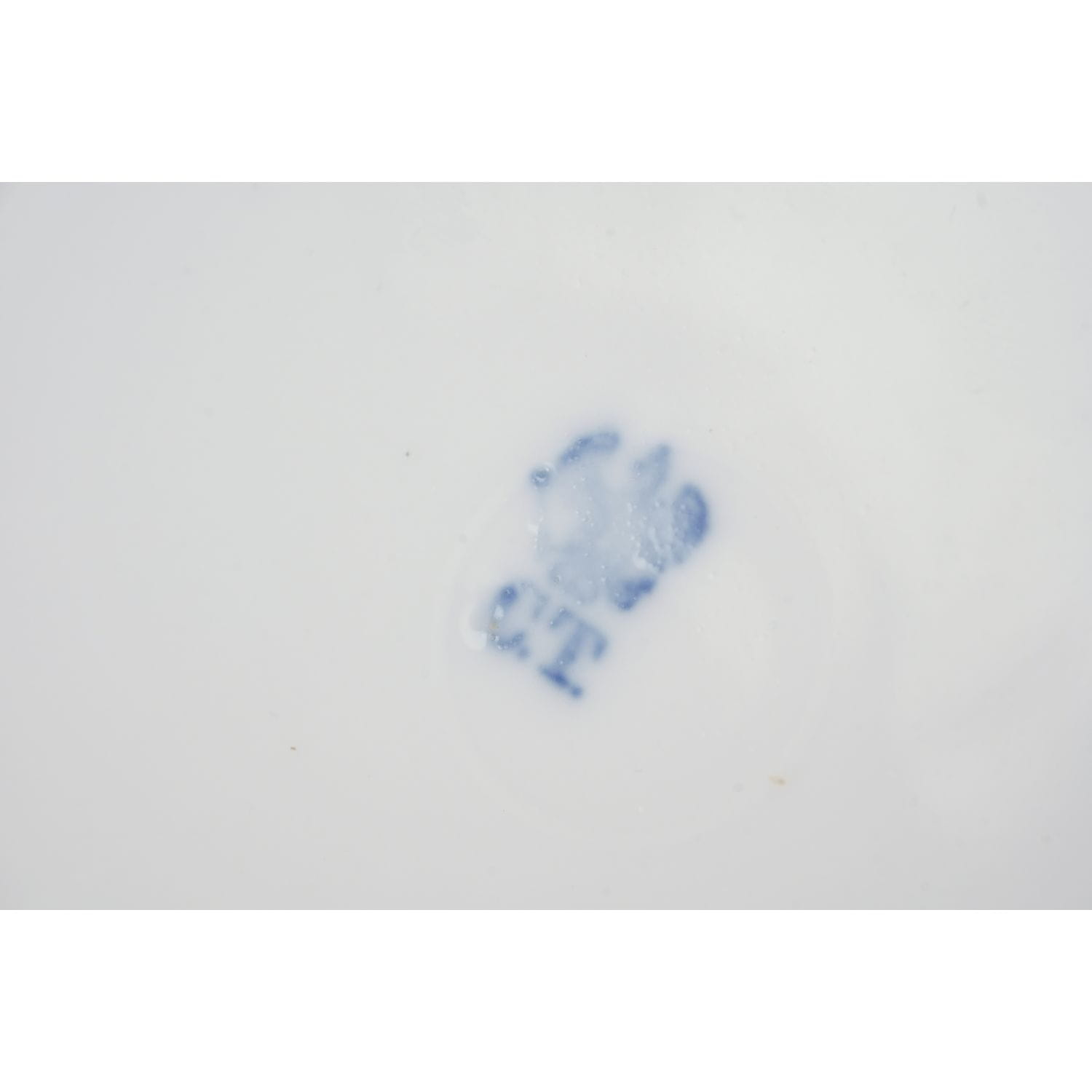 Pochodzi z Starego Zdroju (Altwasser), Carl Tielsch & Co. Sygnatura z 1875 roku. Porcelana dość gruba. Rant falowany. Na lustrze ręcznie malowany, kolorowy bukiet owoców. Kołnierz ozdobiony złotymi opaskami.