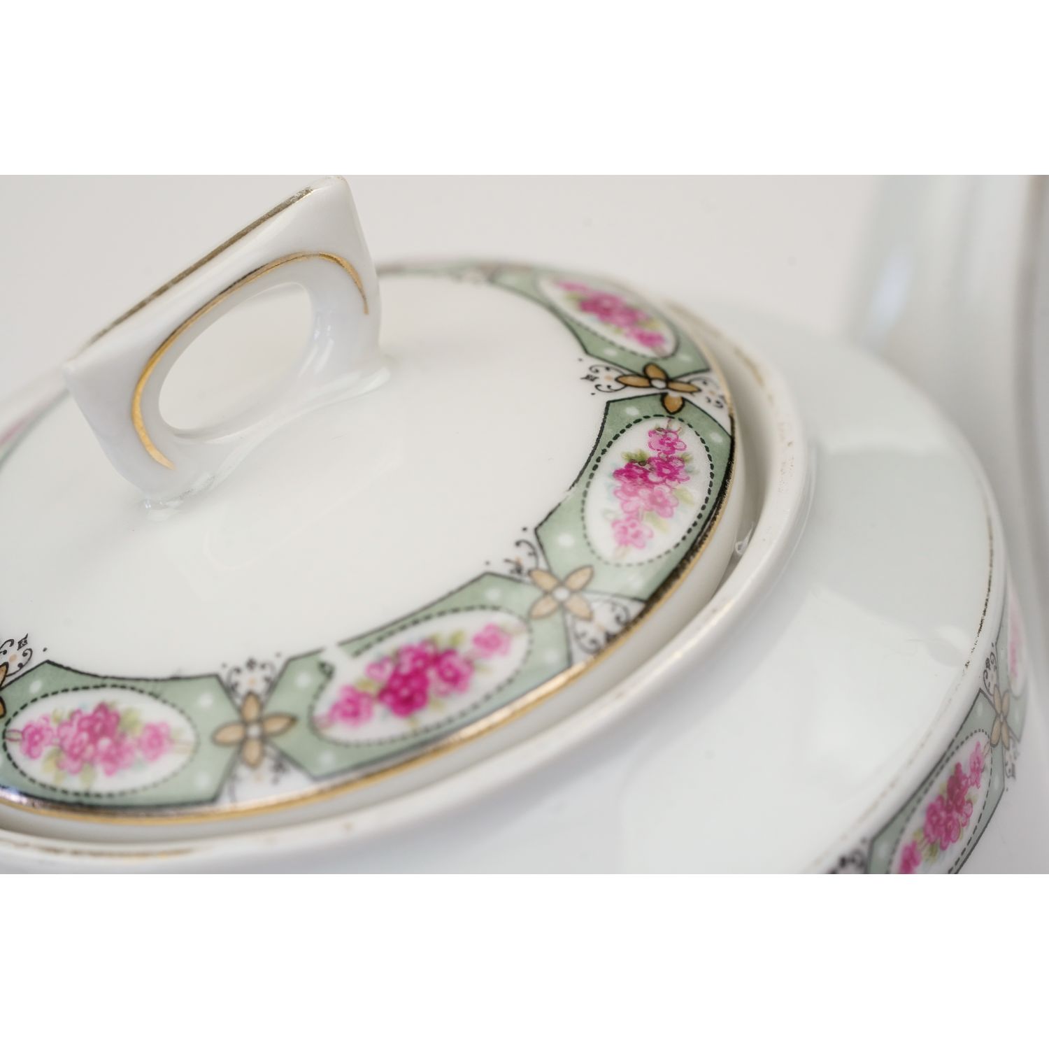 Piękna, biała, delikatna porcelana o prostej formie. Przy krawędziach szare szlaczki z medalionami wypełnione różyczkami. Kontury w złoceniu.