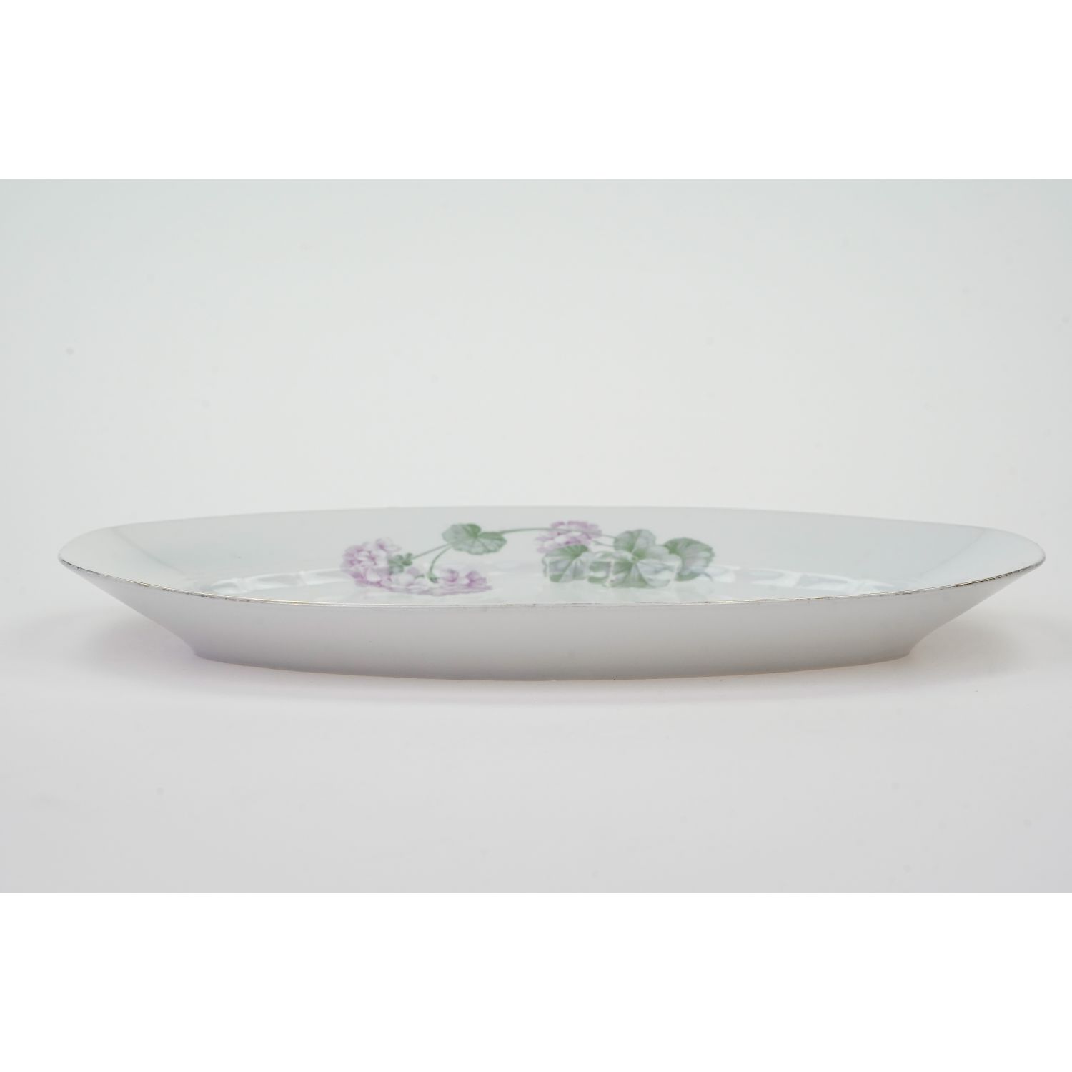 Piękny, duży, owalny półmisek w liliowe pelargonie.