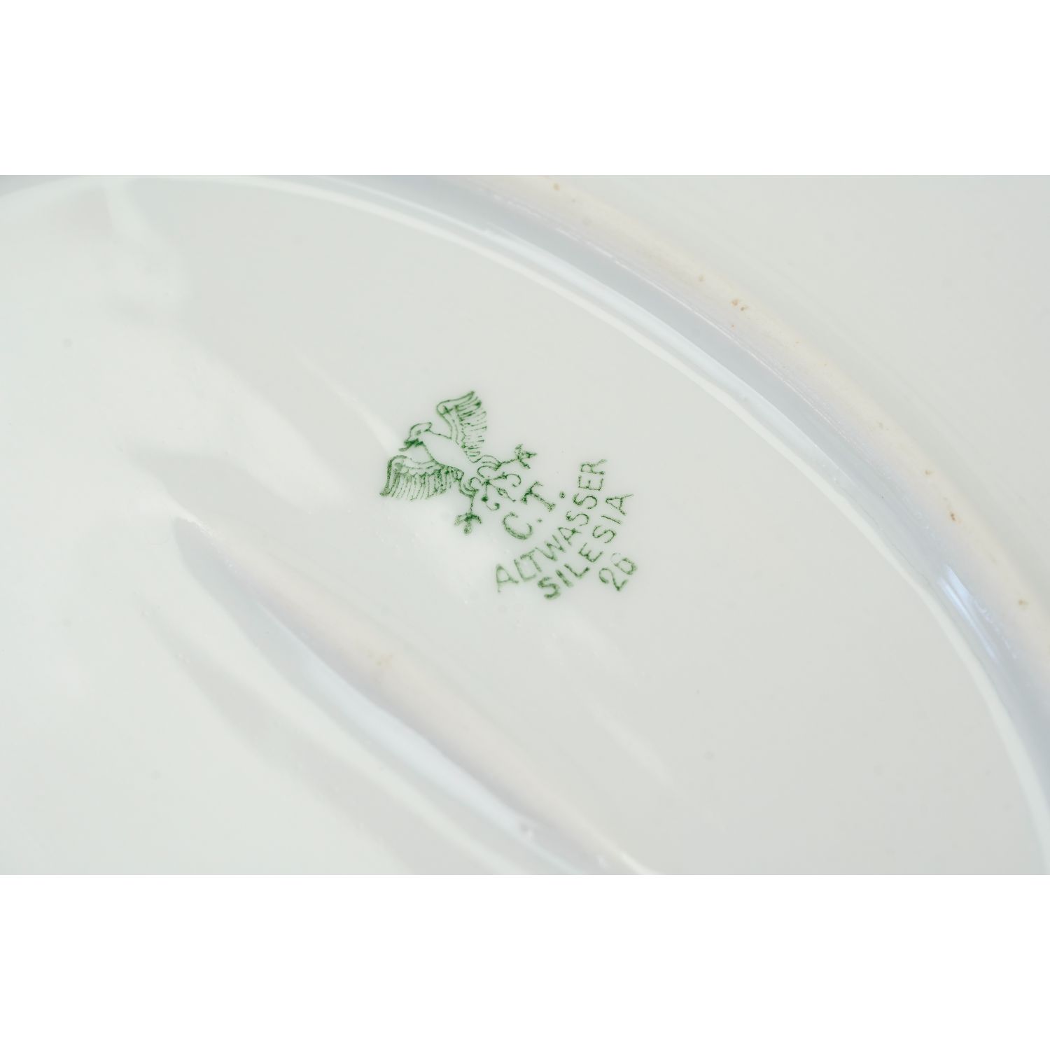 Pochodzi z wytwórni Carla Tielscha z Wałbrzycha, Starego Zdroju. Sygnowany znakiem stosowanym w 1926 roku, do tego zielone numeryczne znaki. Porcelana w odcieniu bieli o ładnej formie ze złoceniami na konturach. Zdobiona kwiatami pelargonii w stonowanych kolorach.