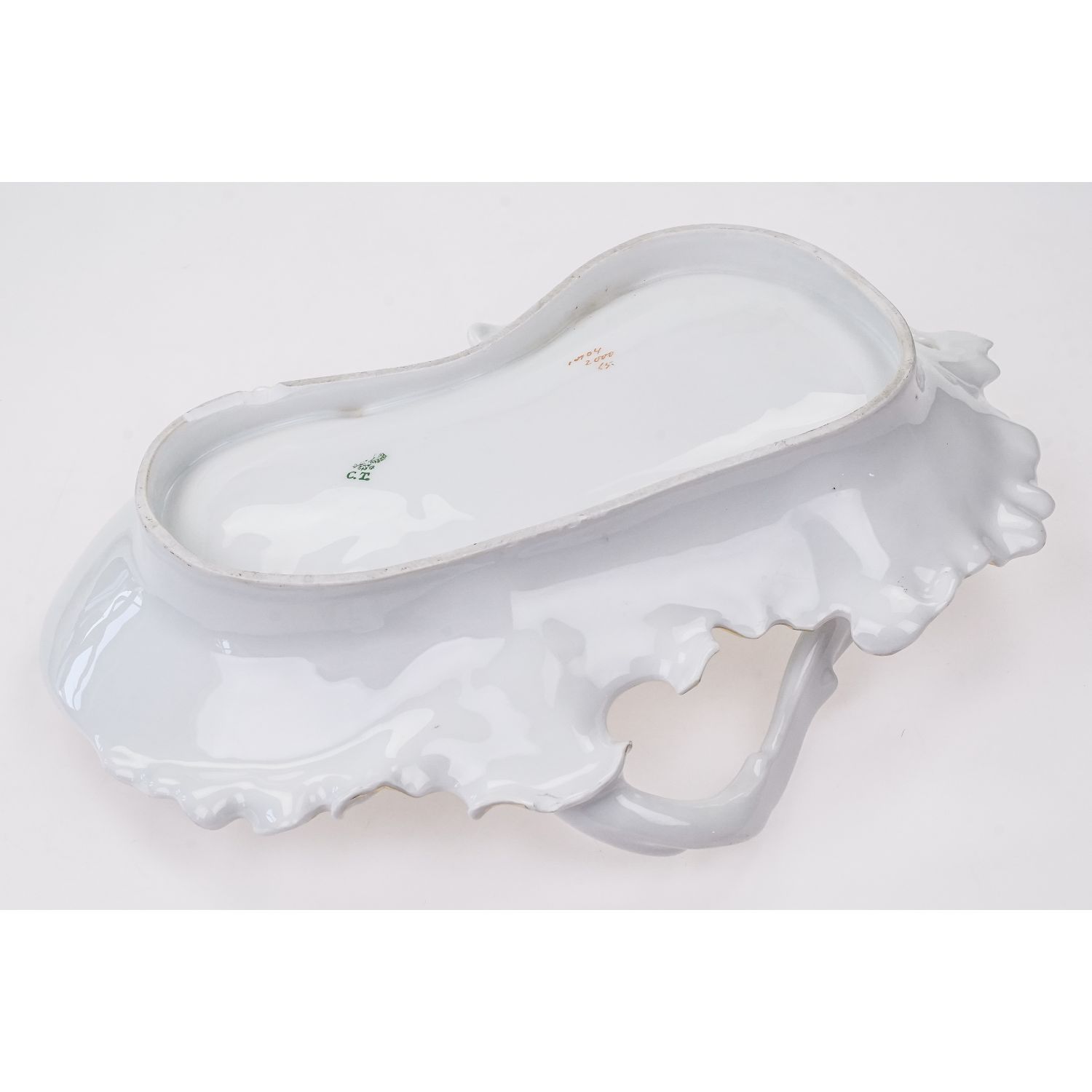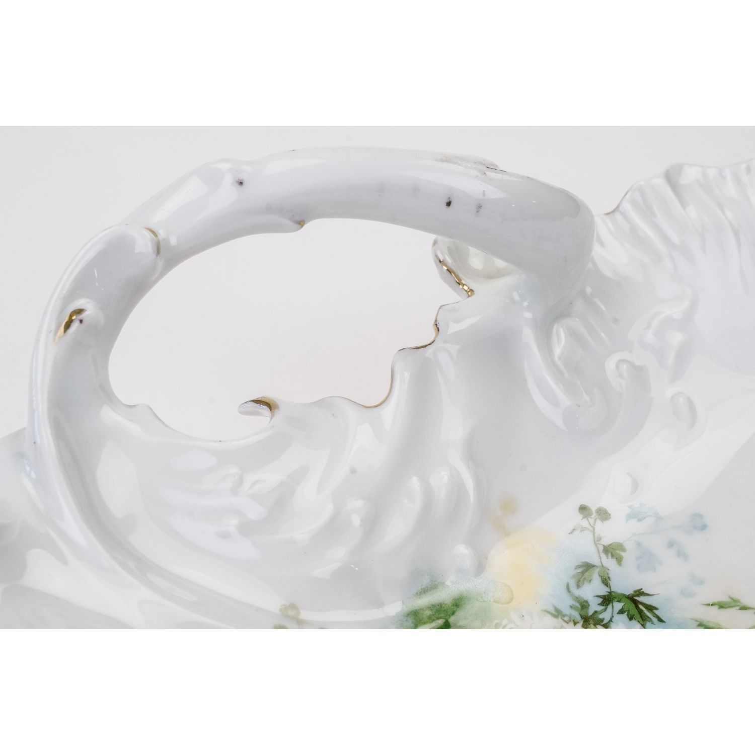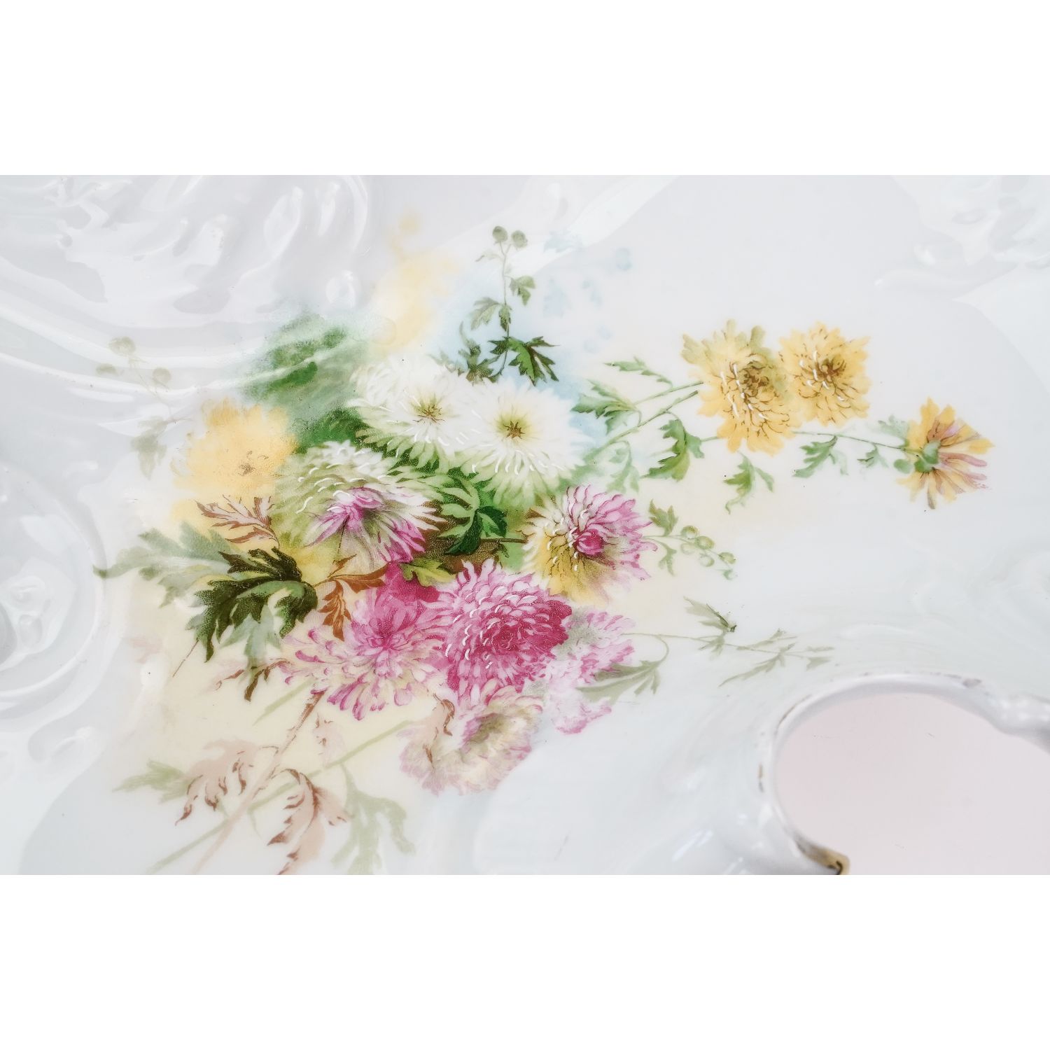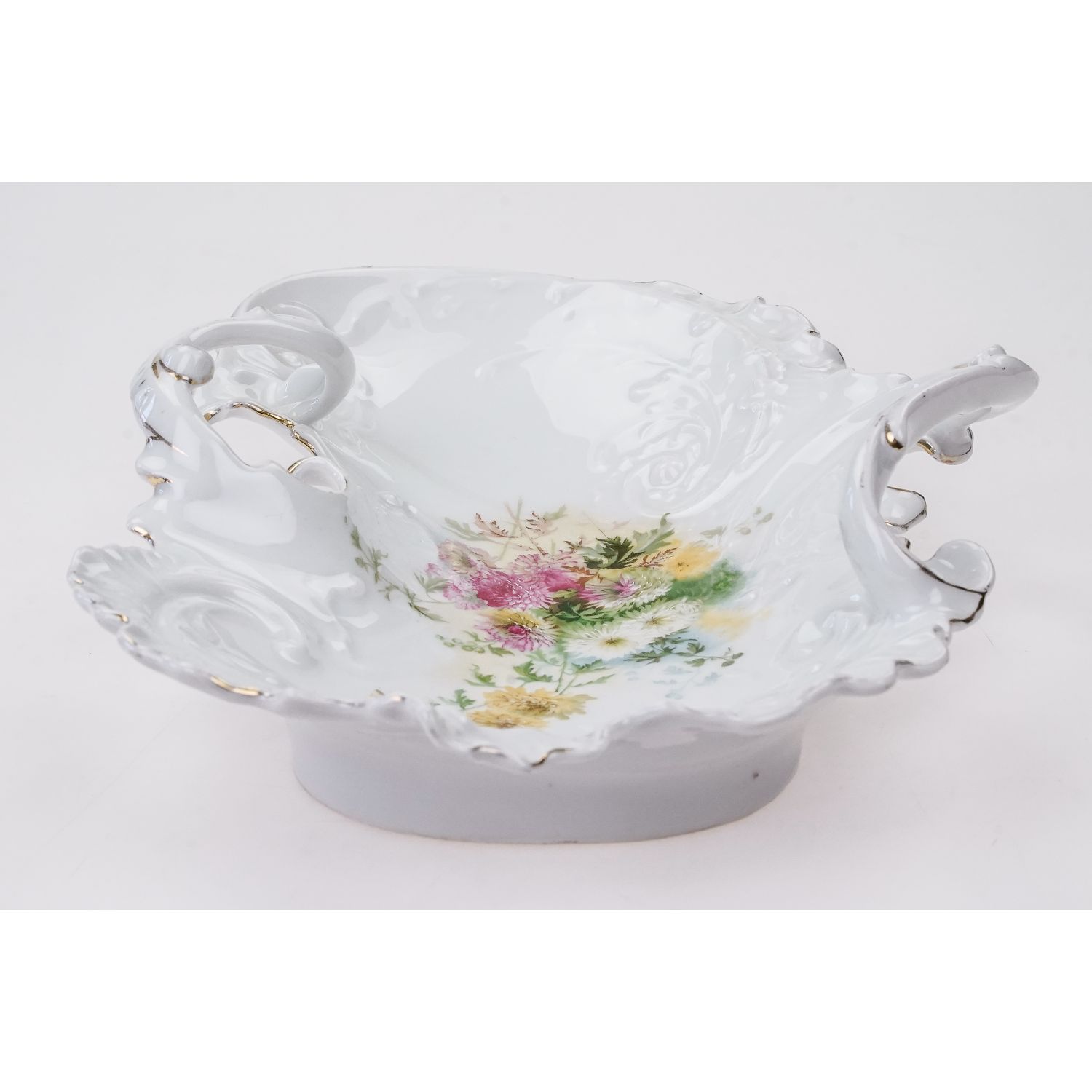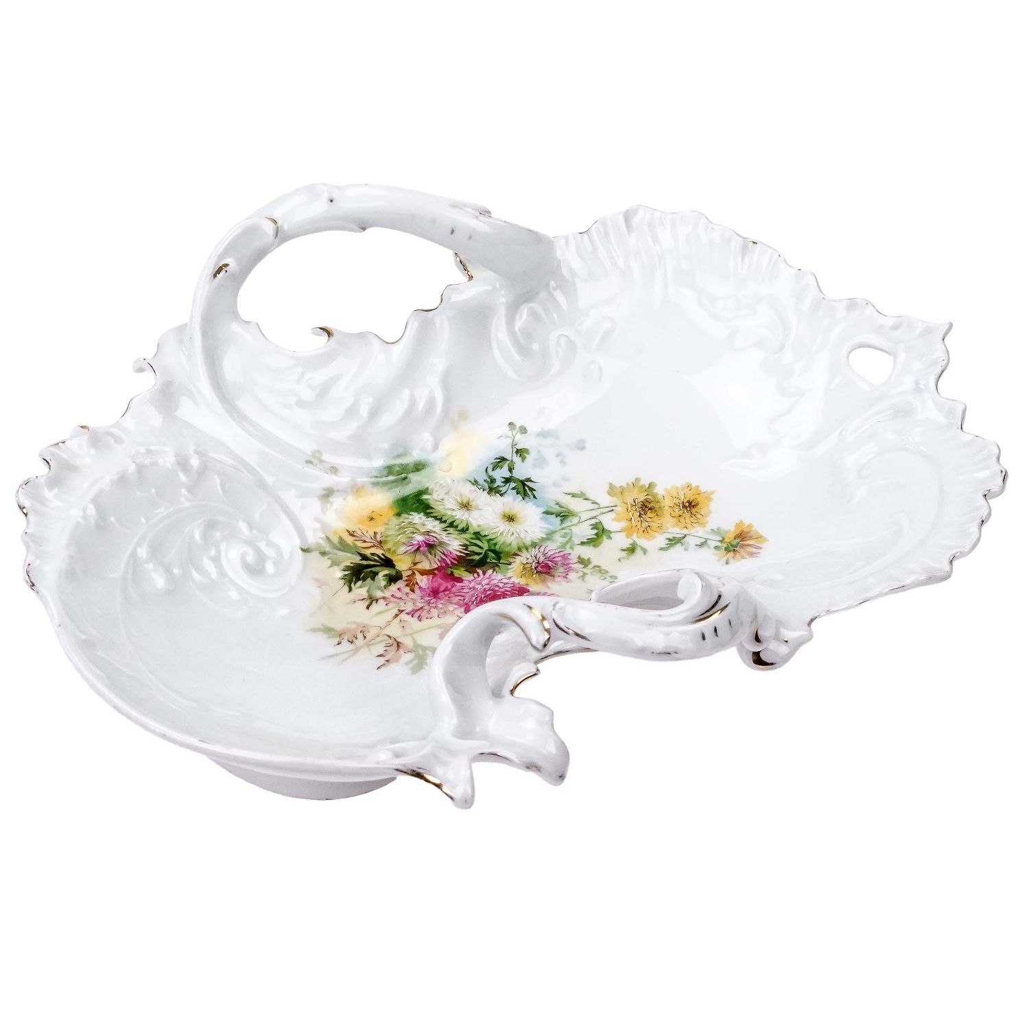 Pochodzi ze Starego Zdroju (Altwasser) z wytwórni Carla Tielscha & Co. Sygnowana znakiem stosowanym od 1875 roku. Porcelana biała z reliefami typowymi dla epoki w stylu Rocaille – motyw dekoracyjny w postaci ornamentu charakterystyczny dla zdobnictwa rokokowego. Zdobiona uroczymi kolorowymi kwiatuszkami na dnie ręcznie podmalowywanymi. Rant kiedyś złocony dzisiaj przetarty, ale to nie jest wielką wadą dla ponad stuletniej staruszki.