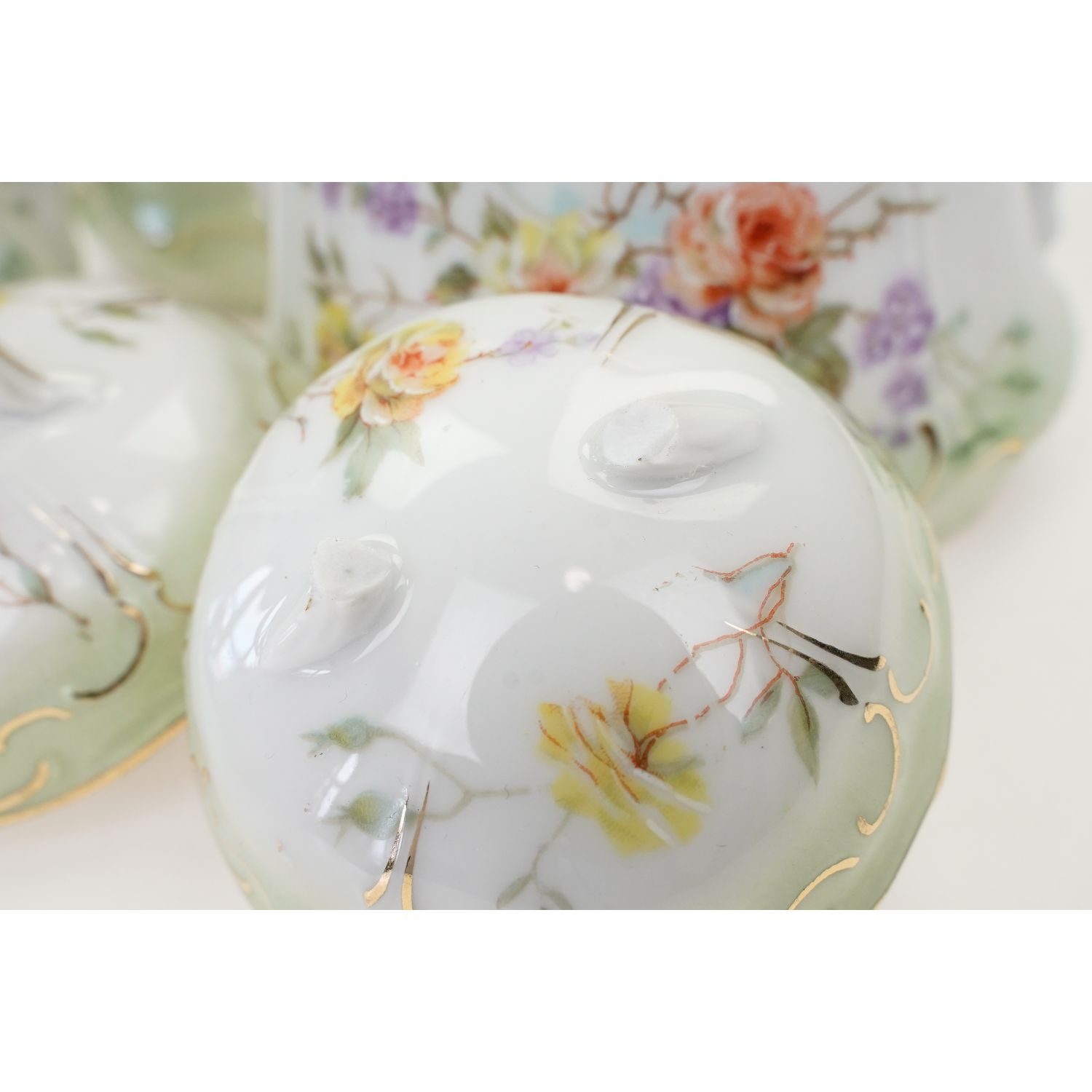 Piękna, biała, delikatna, reliefowana porcelana. Niezwykłe subtelne reliefy kwiatowe podkreślone złoceniami. Na porcelanie zielona, cieniowana malatura. Na niej kwiaty róż i fiołki ręcznie podmalowywane. Prawdziwe cacko!