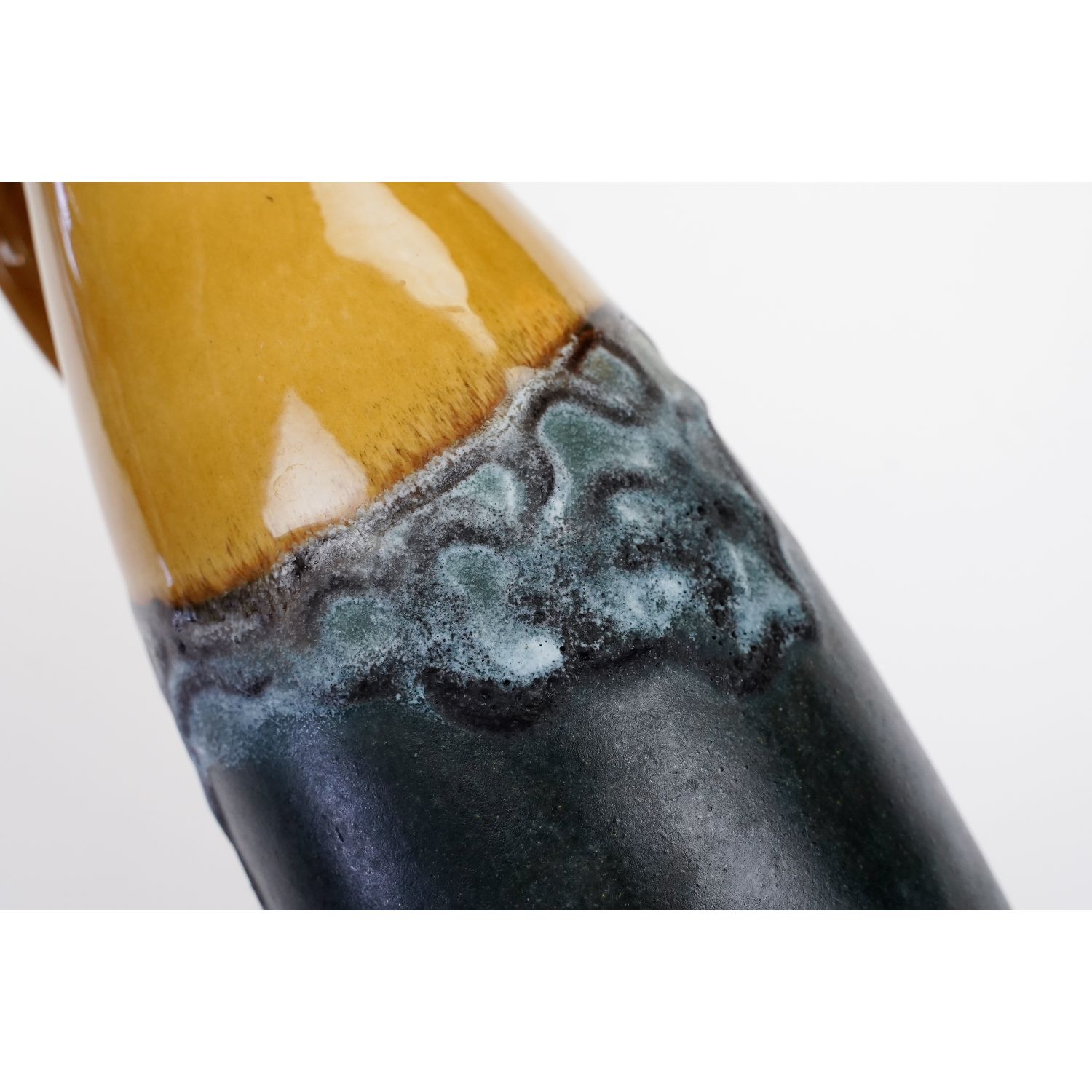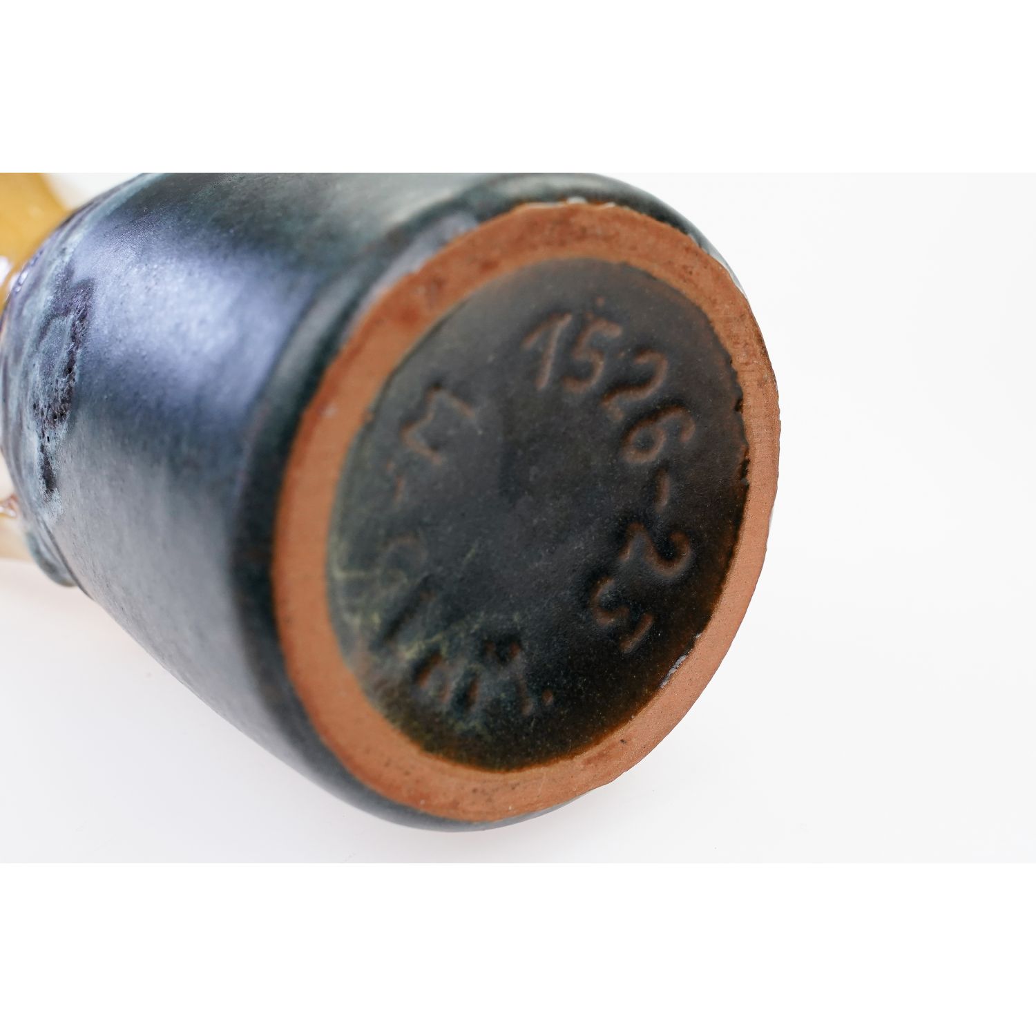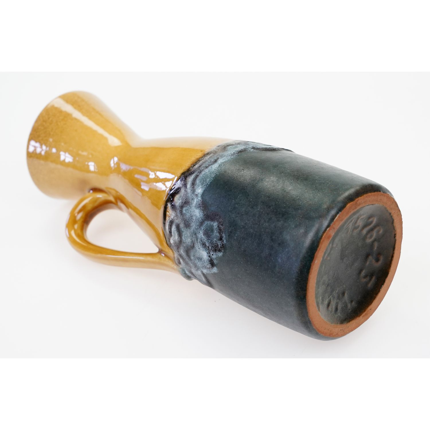 Wyprodukowany przez Carstens-Tönnieshof. Sygnowany tłoczonym numerem 1526-23 i napis W. germany. Ten wazon ma tak piękny, bursztynowy kolor w górnej części i szaro-zielony w dolnej i ma świetny kształt z uchem. Wykończenie jest ładne i nadal błyszczące u góry i porowate, matowe u dołu. Firma Carstens (1945-1987), założona przez braci Christiana i Ernsta Carstenów po utracie większości swoich fabryk na rzecz NRD. Fabryka Carstens Uffrecht we wschodnich Niemczech została producentem VEB Haldensleben.