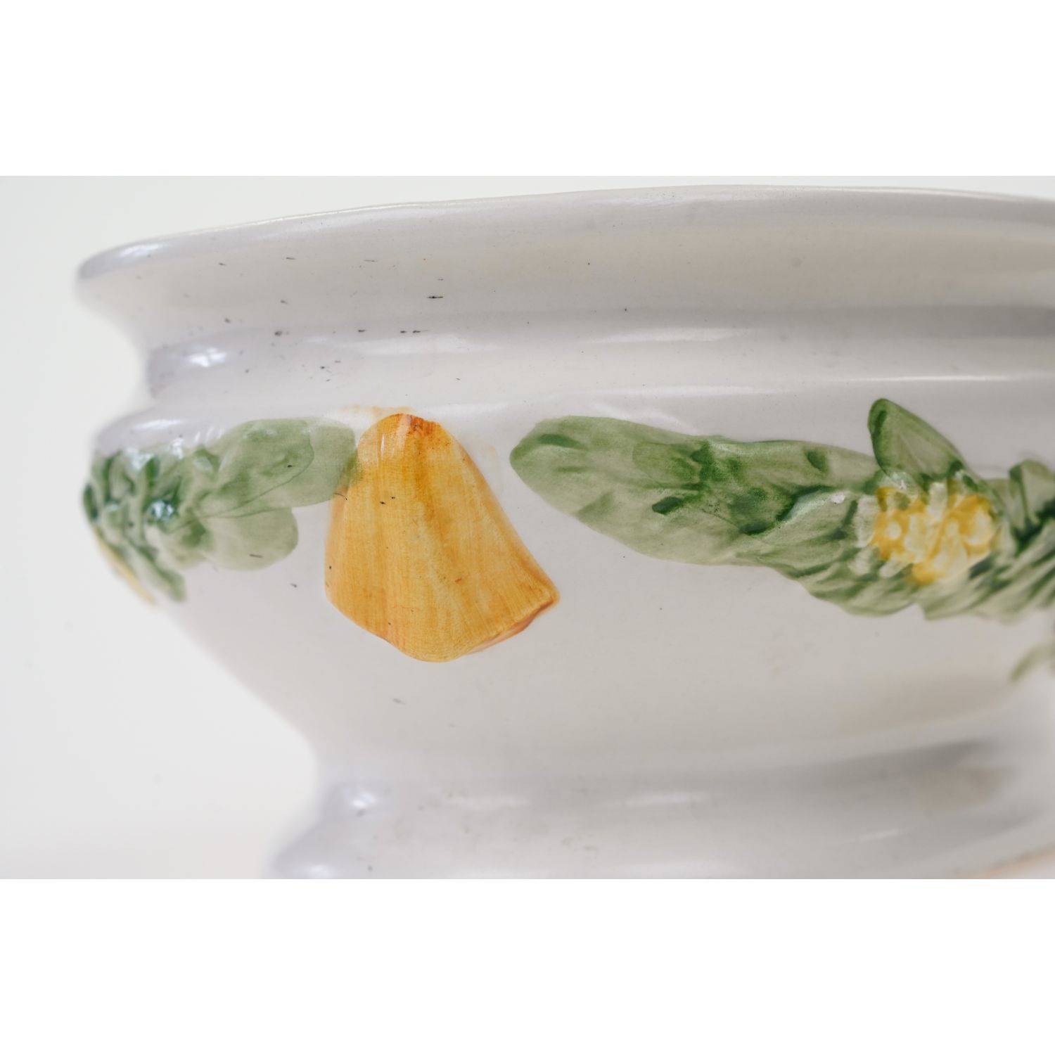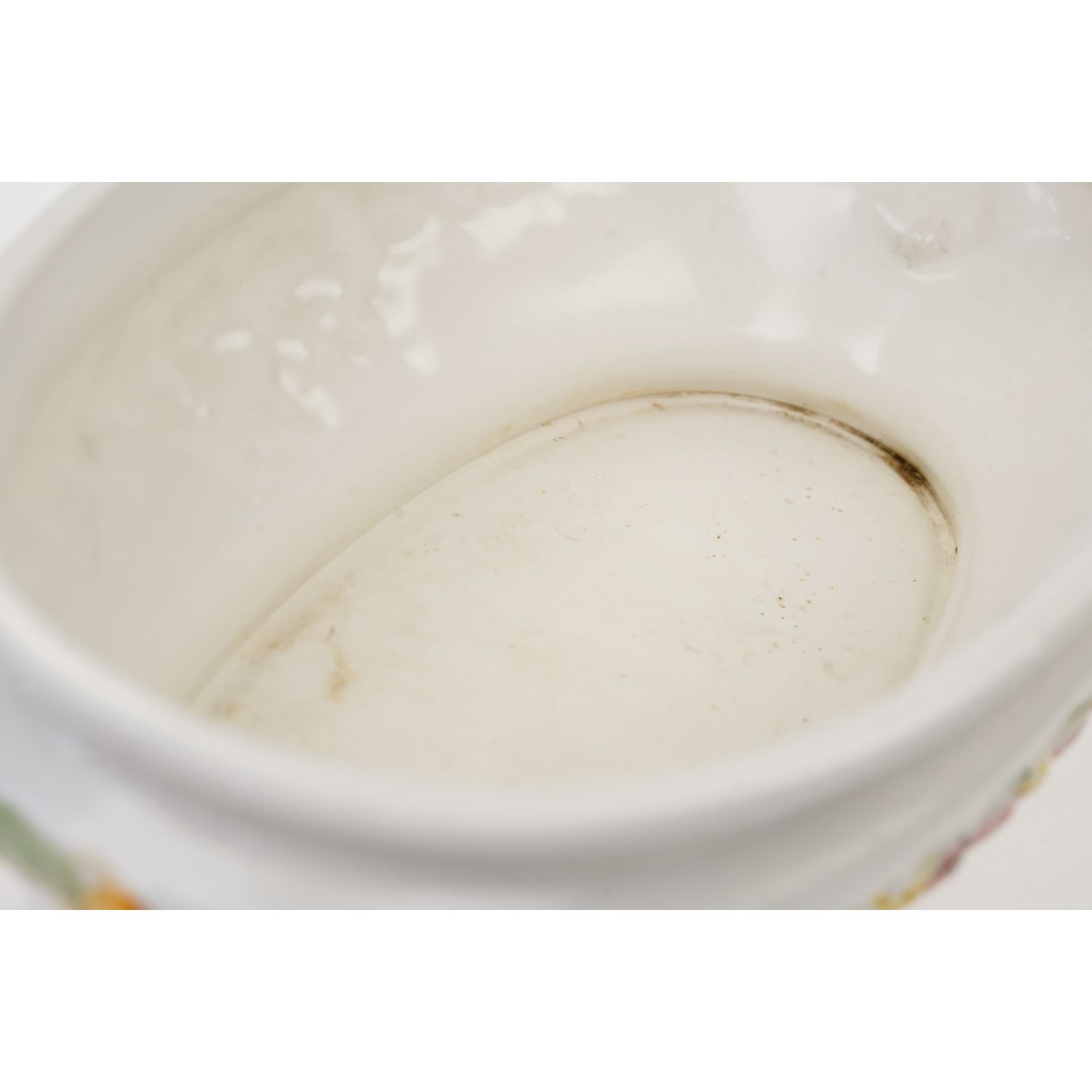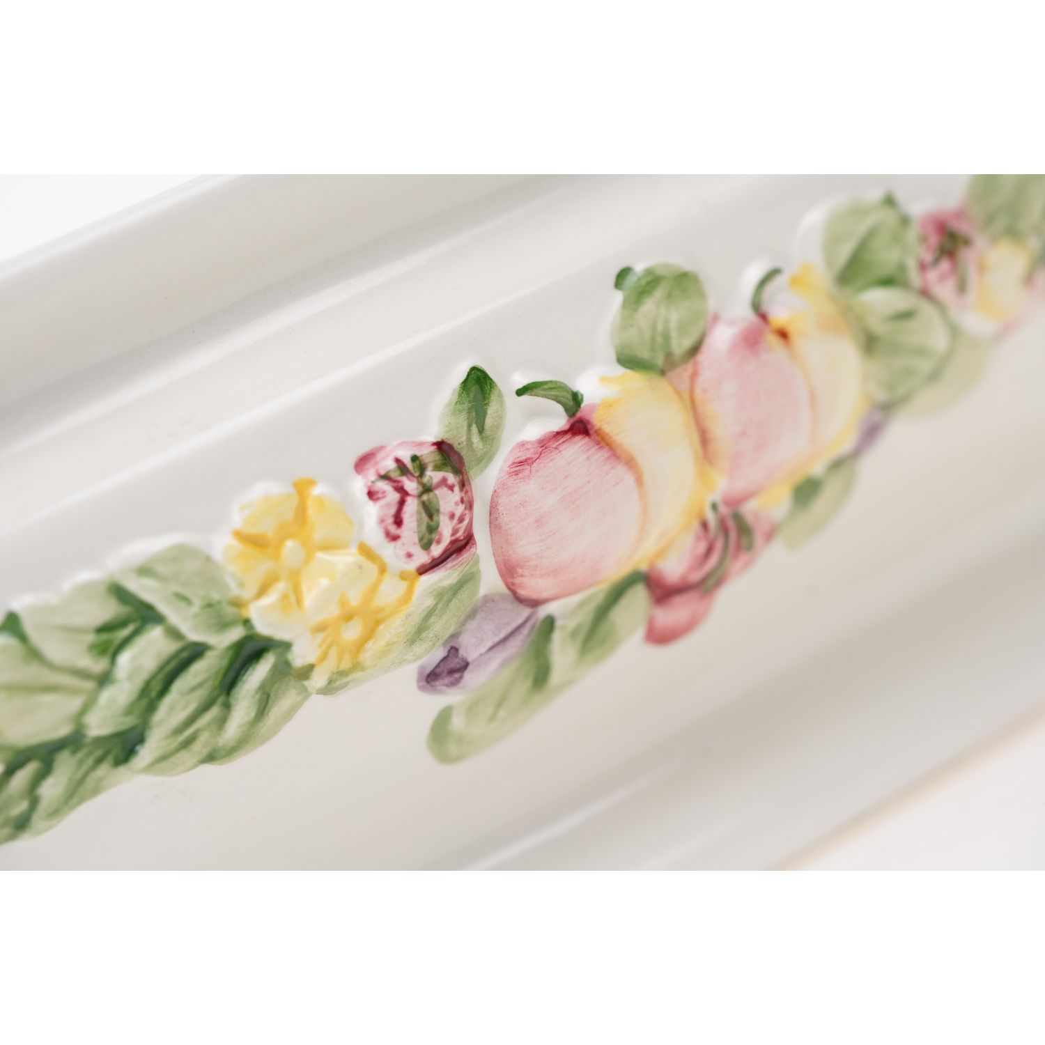 Sygnowana numerycznie. Wykonana z białej ceramiki. Dookoła ozdobiona reliefami przedstawiającymi girlandy kwiatów i owoców ręcznie malowane. Naczynie ma klasyczny, owalny kształt.