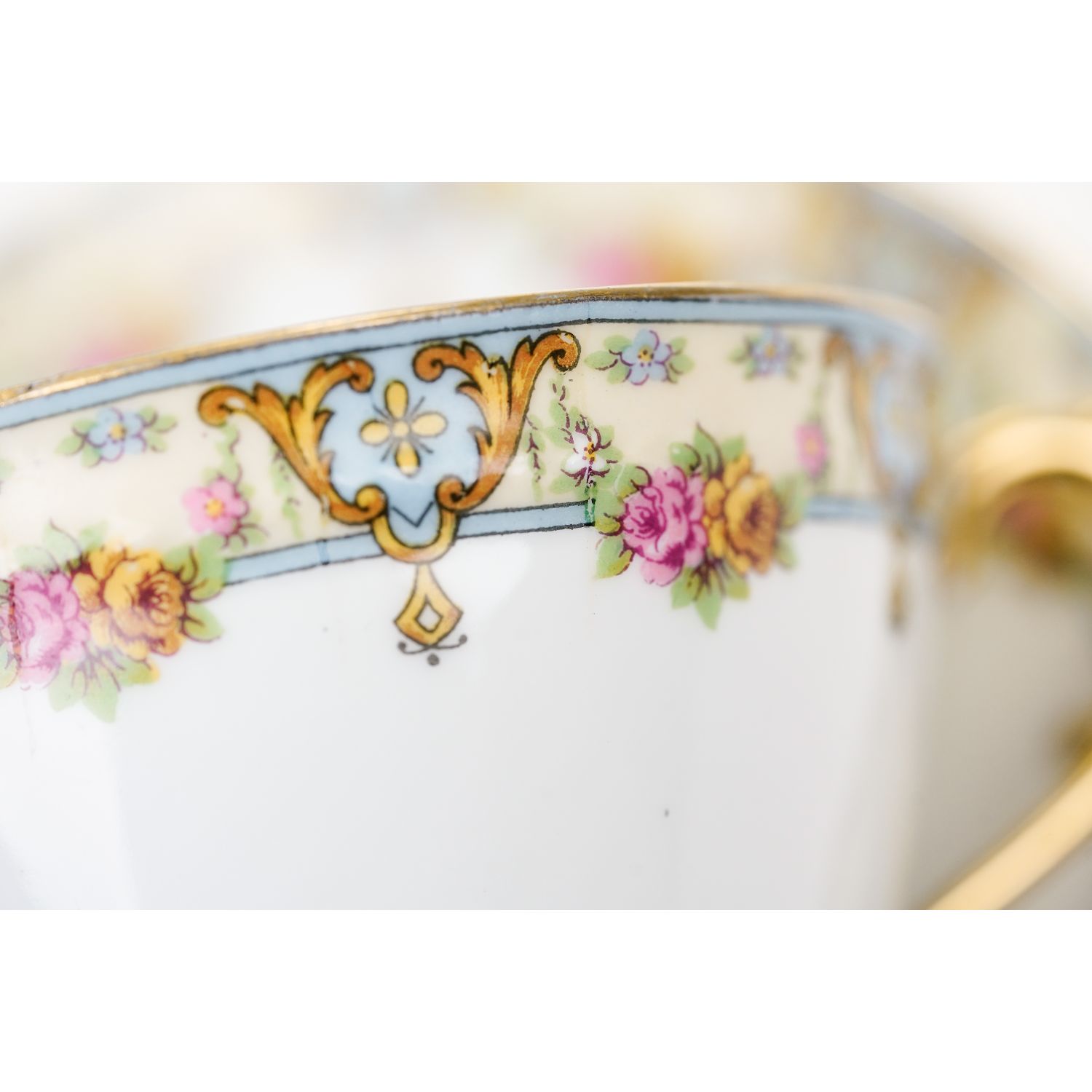 Porcelana w kolorze bieli. Dość delikatna. Krawędzie wszystkich elementów dekorowane uroczymi, żółtymi bordiurami z różowymi różyczkami. Uszko w pełni złocone. Krawędzie w delikatniejszym złoceniu.