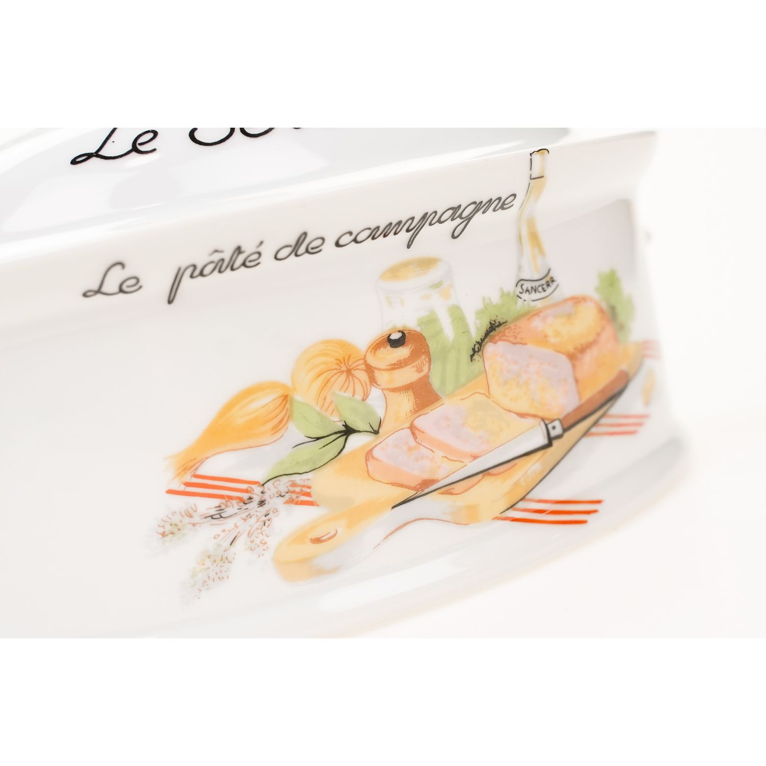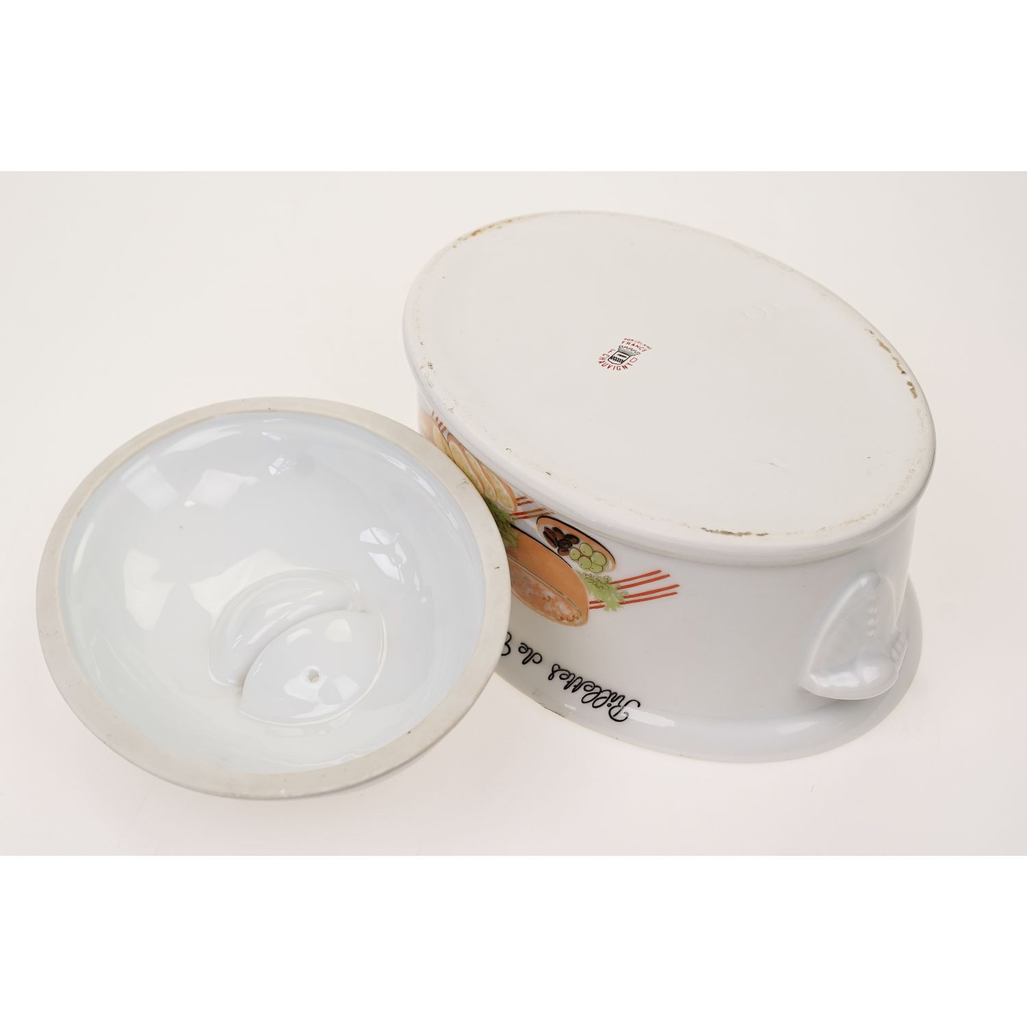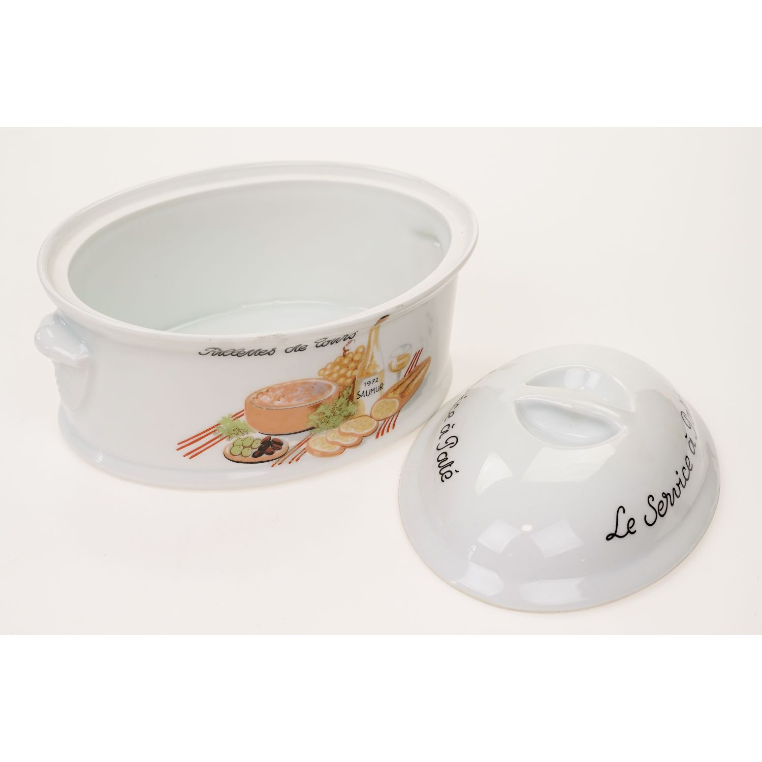 Wyprodukowany przez F.D. Chauvigny w regionie Vienne we Francji. (Ten producent drobnej porcelany należy do grupy Deshouliers z siedzibą w Chauvigny). Teryna wykonane z dość grubej porcelany w odcieniu bieli. Z pokrywką o owalnym kształcie. Na naczyniu Napisy w języku francuskim. Z obu stron naczynia barwne dekoracje przedstawiające różne produkty spożywcze. Całość jest praktyczna i dekoracyjna. Przygotowaną w naczyniu potrawę można swobodnie serwować bezpośrednio na stół.