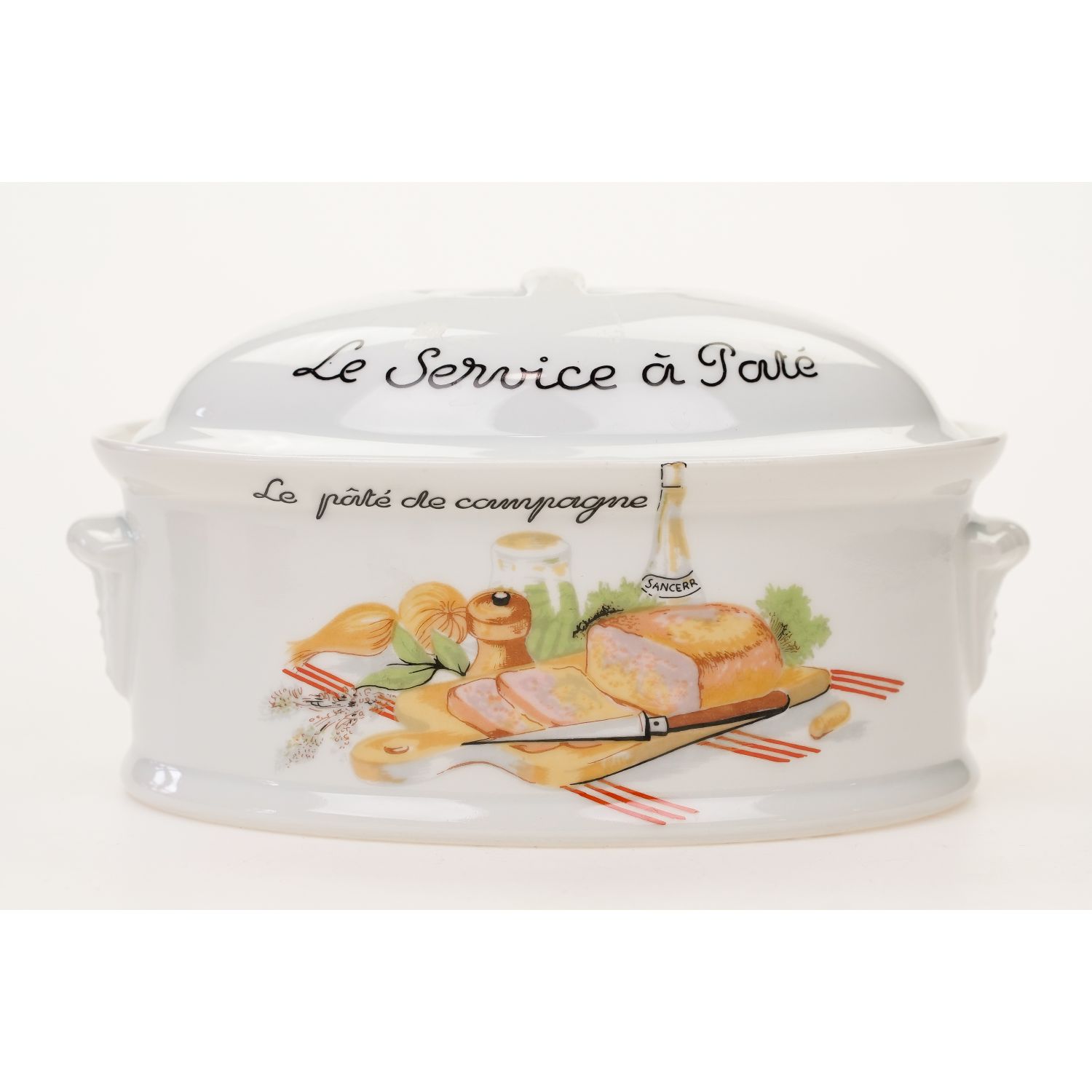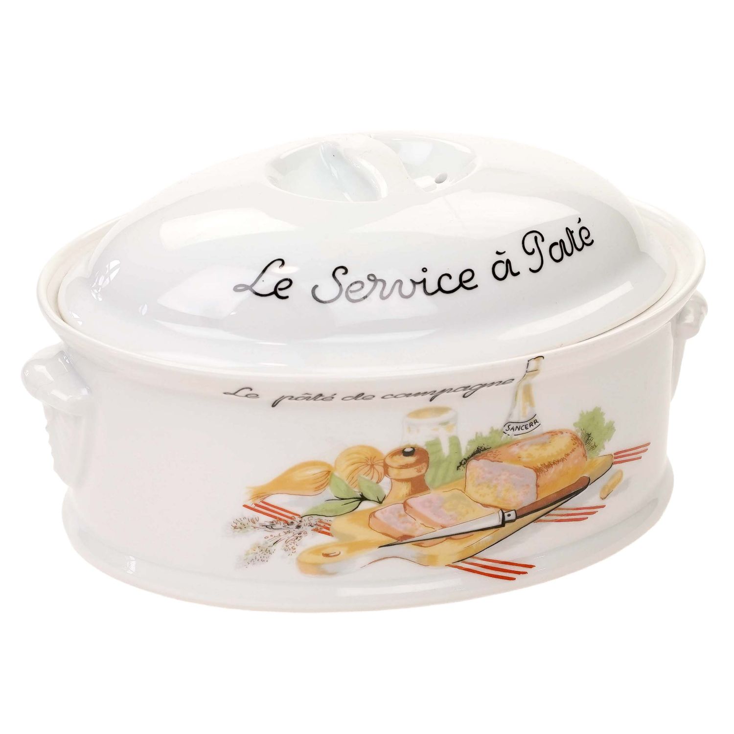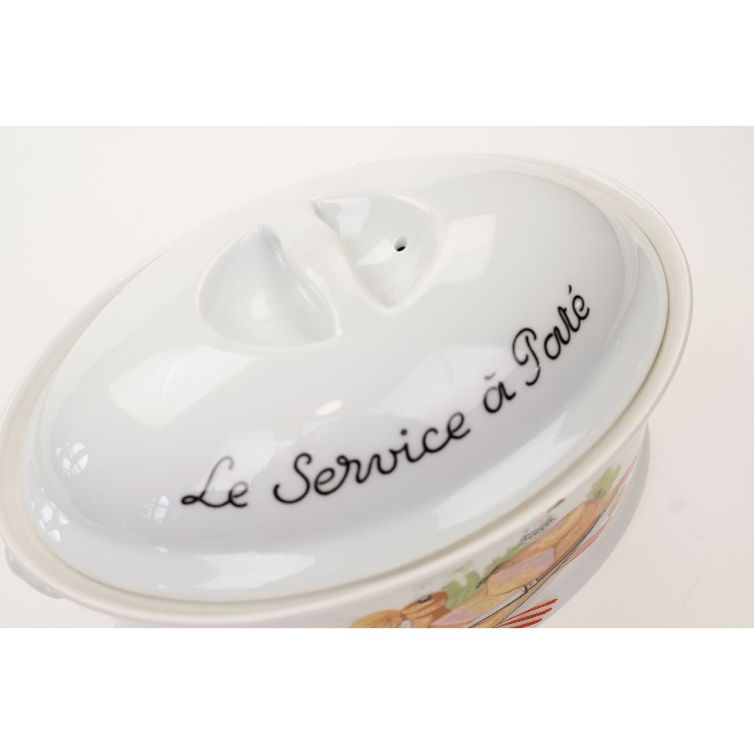 Wyprodukowany przez F.D. Chauvigny w regionie Vienne we Francji. (Ten producent drobnej porcelany należy do grupy Deshouliers z siedzibą w Chauvigny). Teryna wykonane z dość grubej porcelany w odcieniu bieli. Z pokrywką o owalnym kształcie. Na naczyniu Napisy w języku francuskim. Z obu stron naczynia barwne dekoracje przedstawiające różne produkty spożywcze. Całość jest praktyczna i dekoracyjna. Przygotowaną w naczyniu potrawę można swobodnie serwować bezpośrednio na stół.