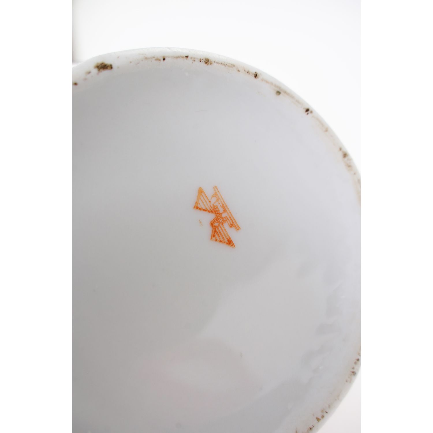Sygnowany jak na zdjęciu. Porcelana biała, kanelowana/żebrowana, ozdobiona dekoracją China Blau. Całości dopełniają złote konturówki.