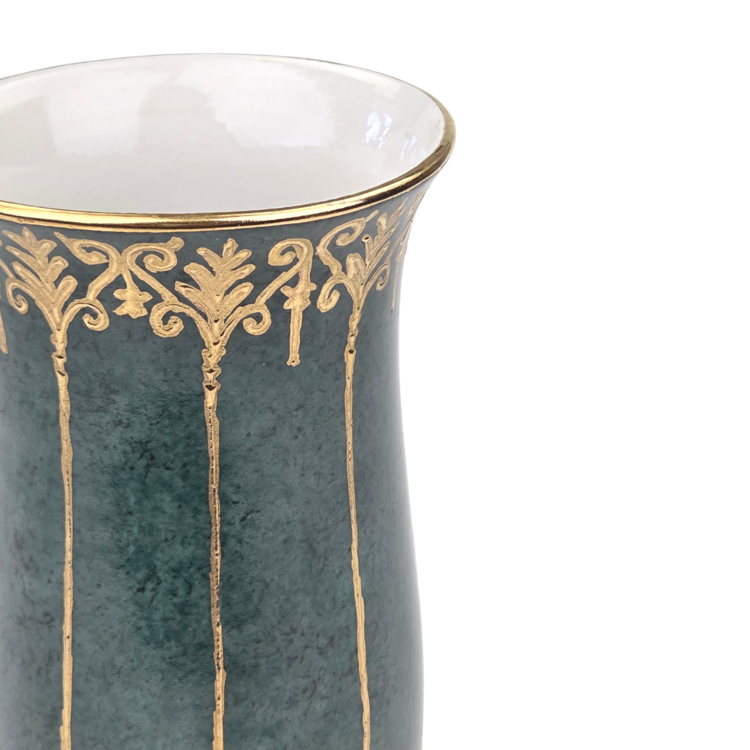 Pochodzi z Chin. Sygnowany jak na zdjęciu. Wykonany z porcelany w odcieniu złamanej bieli. Na zewnątrz pokryta zieloną, marmurkową malaturą, która stała się tłem dla złotych, eleganckich goldreliefów. Kontury w złoceniu.