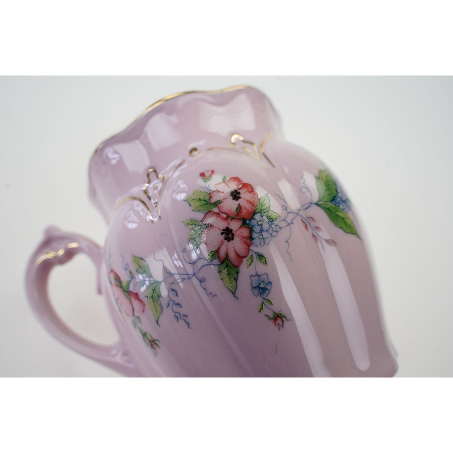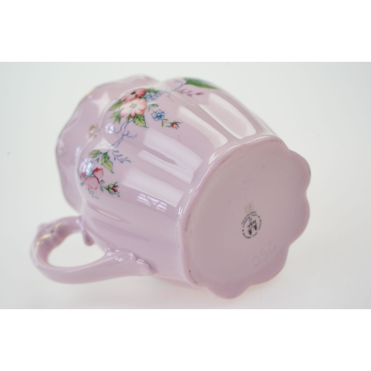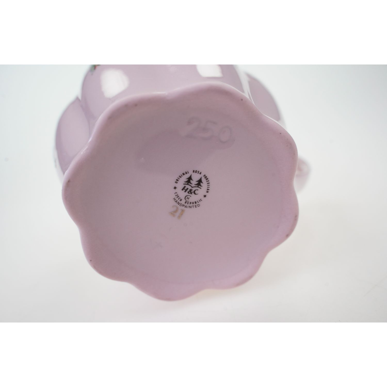 Pochodzi z Czech z miejscowości Chodov z Karlovarský Porcelán, a.s. závod 03 Chodov. Sygnatura producenta z dopiskiem Original Rosa Porzellan oraz Handpainted. Fason Hanka. Porcelana w różowym kolorze, który zawdzięcza dodatkowi złota. Śliczna forma z delikatnymi reliefami, podkreślonymi złotymi konturówkami. Pomiędzy nimi kwiatowe dekoracje dookoła naczynia przedstawiająca barwne, drobne kwiateczki. Całości dopełniają grube złote obwódki i złotem powleczone uszko.