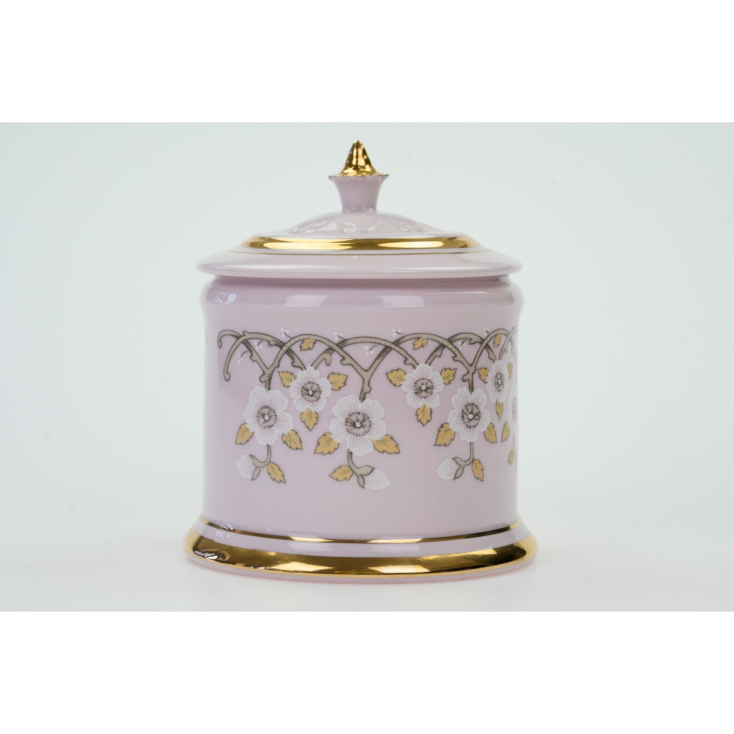 Pochodzi z Czech z miejscowości Chodov z Karlovarský Porcelán, a.s. závod 03 Chodov. Sygnatura producenta z dopiskiem Original Rosa Porzellan oraz Handpainted. Porcelana w różowym kolorze, który zawdzięcza dodatkowi złota. Prosta forma nie odciąga uwagi od bogatych, kwiatowych dekoracji dookoła naczynia. Sterczynka w formie kwiatu. Pokrywa z reliefami o motywie roślinnym. Całości dopełniają grube złote obwódki i złotem powleczony uchwyt.