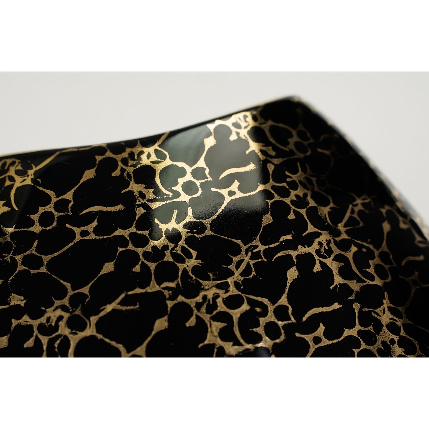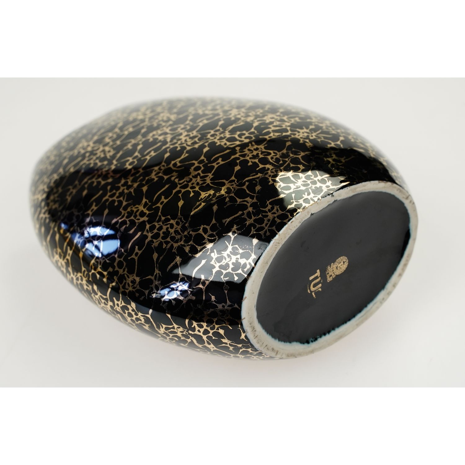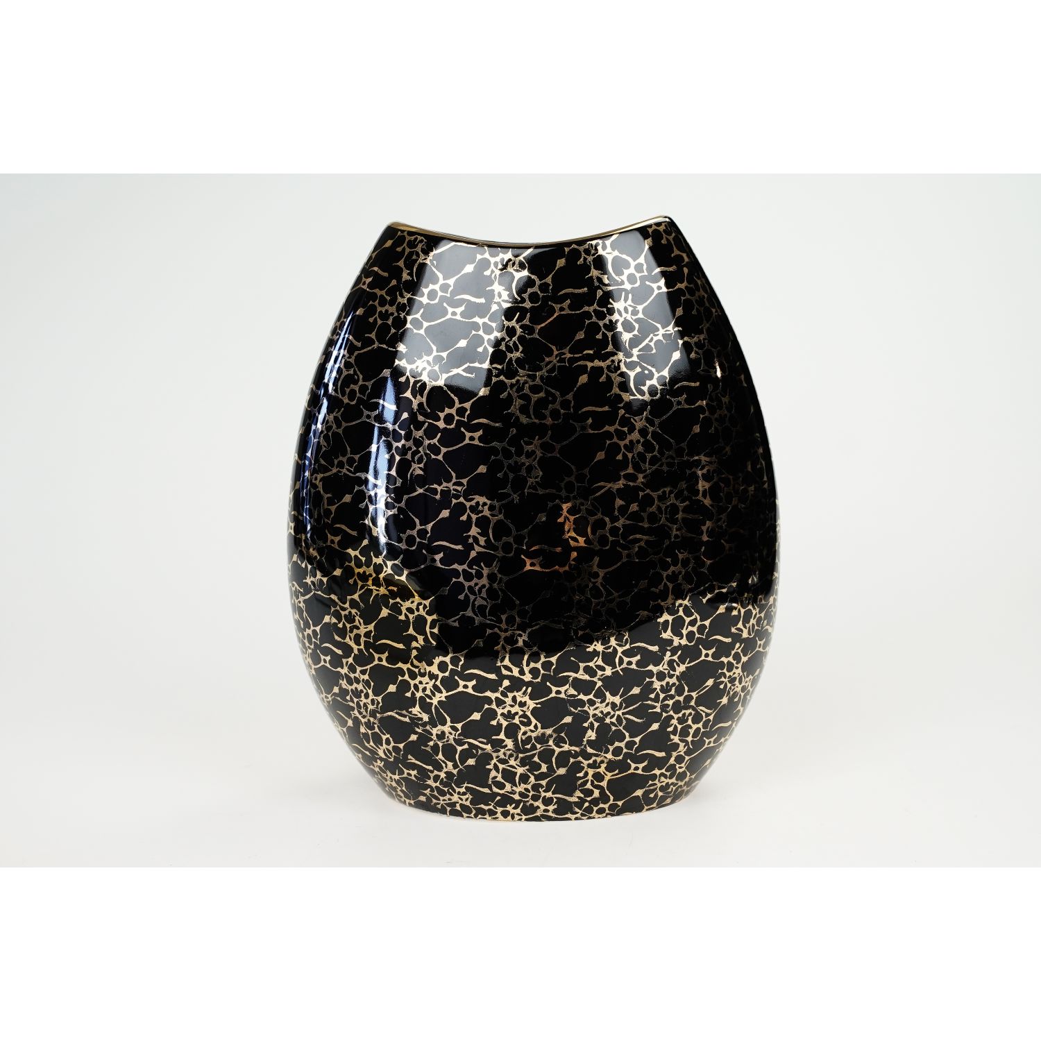 Pochodzi z Zakładu Porcelany i Porcelitu z Chodzieży, Przełom lat 60-tych i 70-tych. Forma wazonu łączy w sobie klasyczną symetrię i nowoczesne rozwiązania. Brzusiec jest lekko spłaszczony, co nadaje mu elegancji i smukłości, a wlew w kształcie "rybich ust" dodaje lekkości. Takie rozwiązanie nie tylko pięknie eksponuje kwiaty, ale również sprawia, że wazon prezentuje się znakomicie jako samodzielna ozdoba. Kolor czarny pokryty złoceniami nakładanymi metodą tamponażu. Górna krawędź w złotej konturówce.