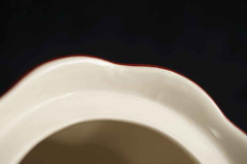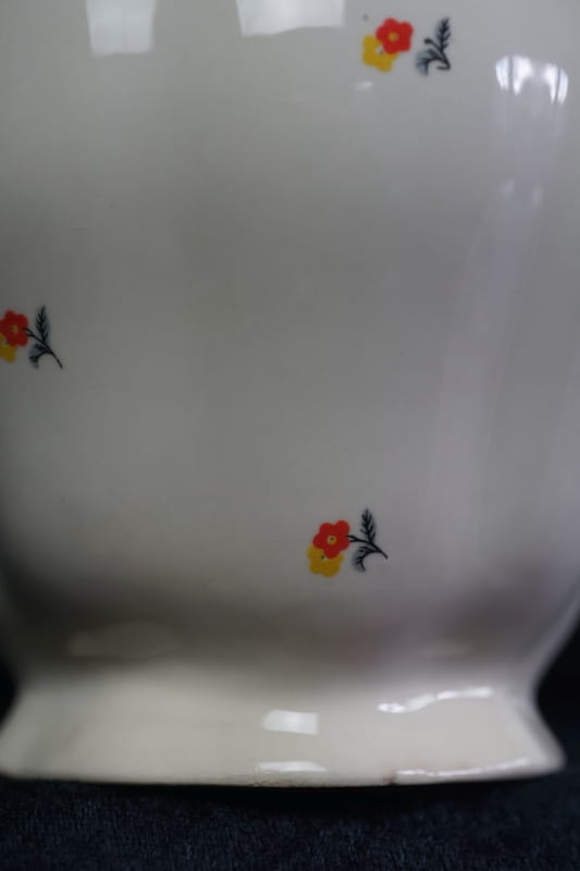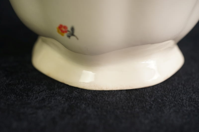 Z Chodzieskich Zakładów Porcelany i Porcelitu z lata 50/60-te XX wieku. Porcelana w kolorze kości słoniowej, dość gruba. Z wyrazistymi reliefami, rant łagodnie falowany. Na brzuścu rzucik drobnych kwiatuszków w kolorze żółtym i pomarańczowym z czarnymi dodatkami. Na krawędziach brązowa konturówka.