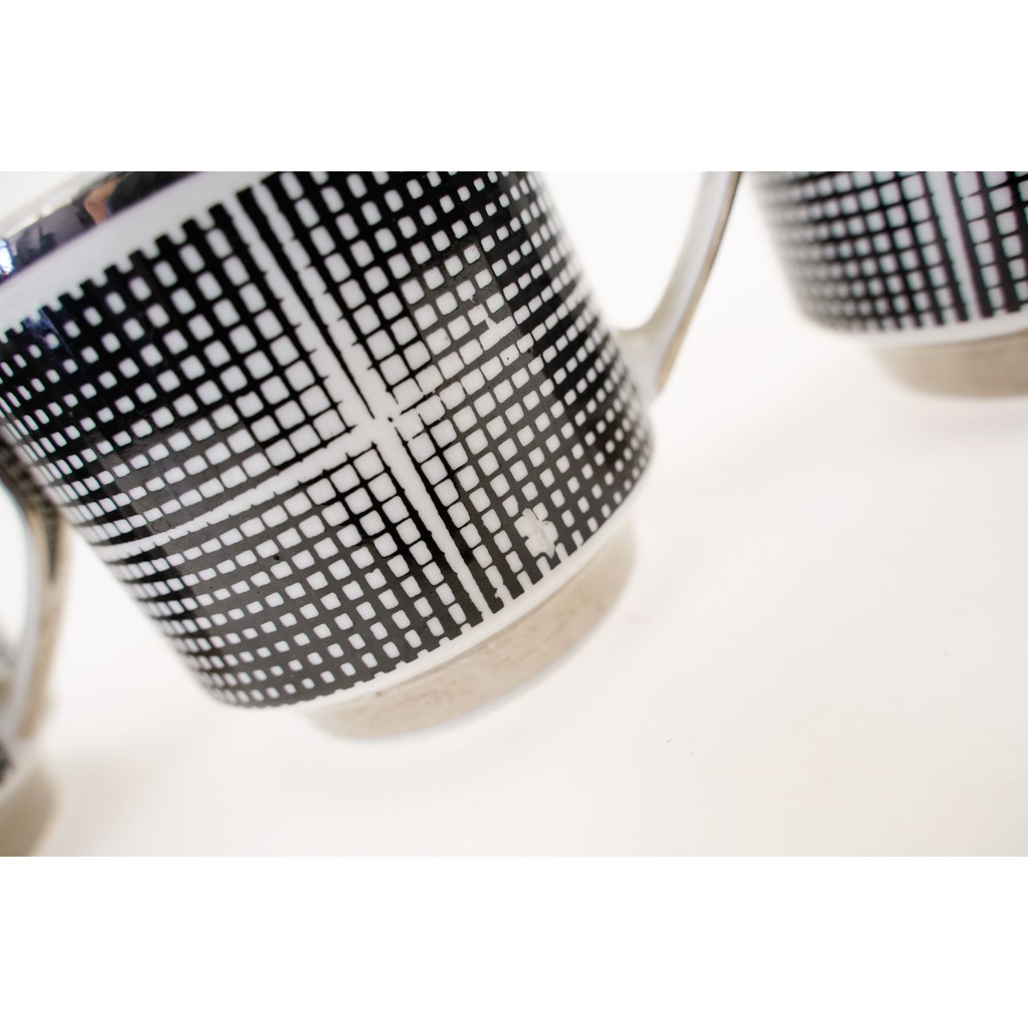 Pochodzą z lat 70-tych XX wieku. Zostały wyprodukowana w Zakładzie Porcelany i Porcelitu w Chodzieży. Sygnowane jak na zdjęciu. Z serwisu Roman zaprojektowanego przez Eugeniusza Renkowskiego. Wykonane z białej porcelany. O zgeometryzowanej bryle z dynamiczne załamanym uchem. Na filiżankach szeroki szlaczek graficznych, abstrakcyjnych wzorków w czarno-białym kolorze. Całości dopełniają srebrne konturówki. Świetnie wpisują się w ogólnoeuropejski nurt we wzornictwie przemysłowym zwanym New Look. W Polsce ten styl w sztuce użytkowej zwany był potocznie pikasami/pikasiakami. Nazwa pochodzi od artysty Pabla Picasso, twórcy abstrakcyjnego kierunku w sztuce zwanego kubizmem. Styl pikasów charakteryzowała zgeometryzowana forma, żywy kolor i sumaryczne dekoracje, najczęściej podkreślające budowę naczynia. ,,Nowoczesne” tendencje z Zachodu dotarły do Polski na krótko przed czasami politycznej "odwilży" 1956 roku.
