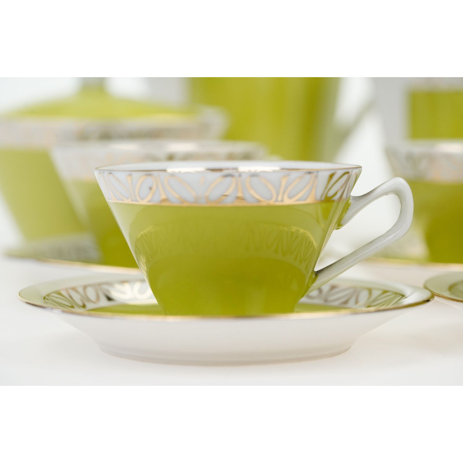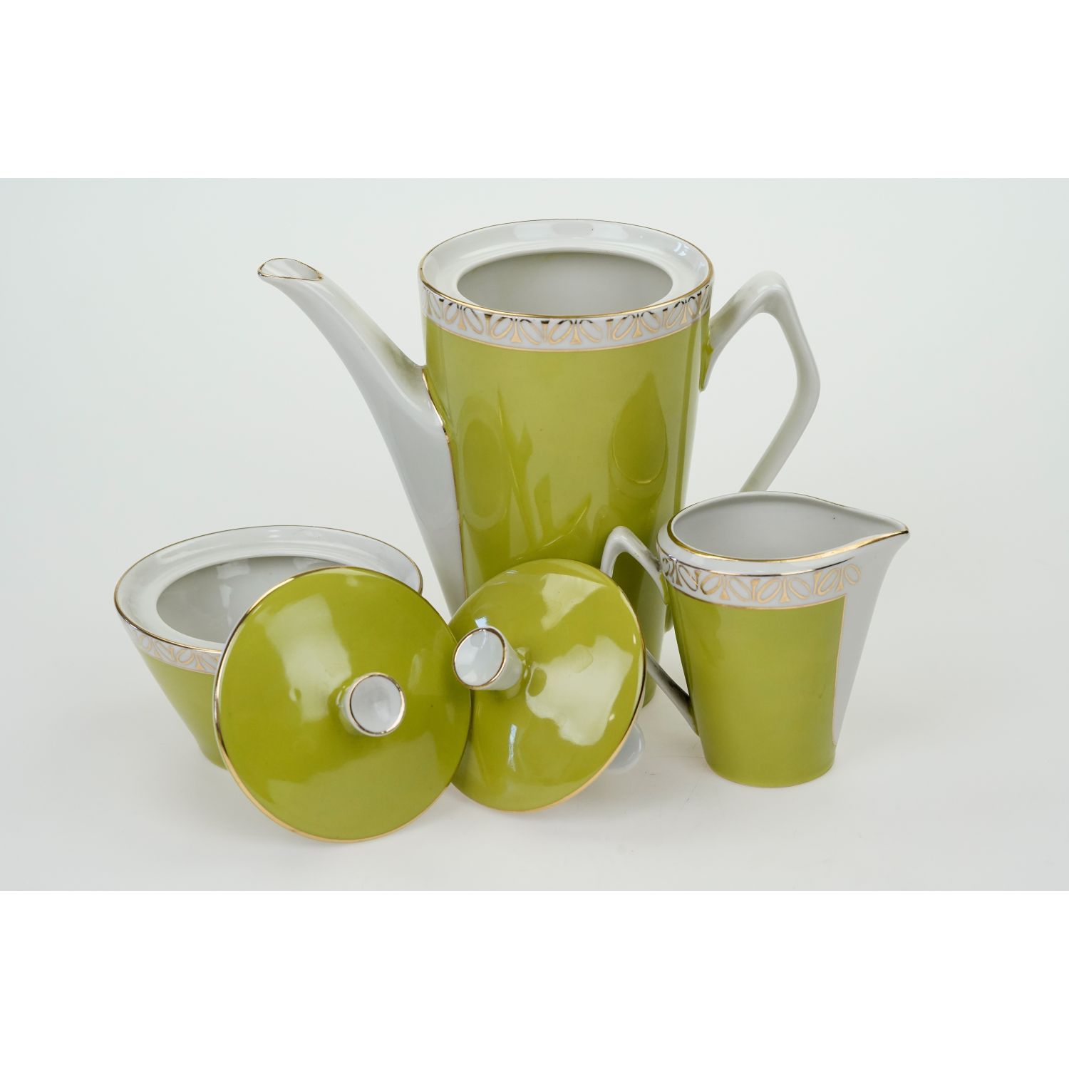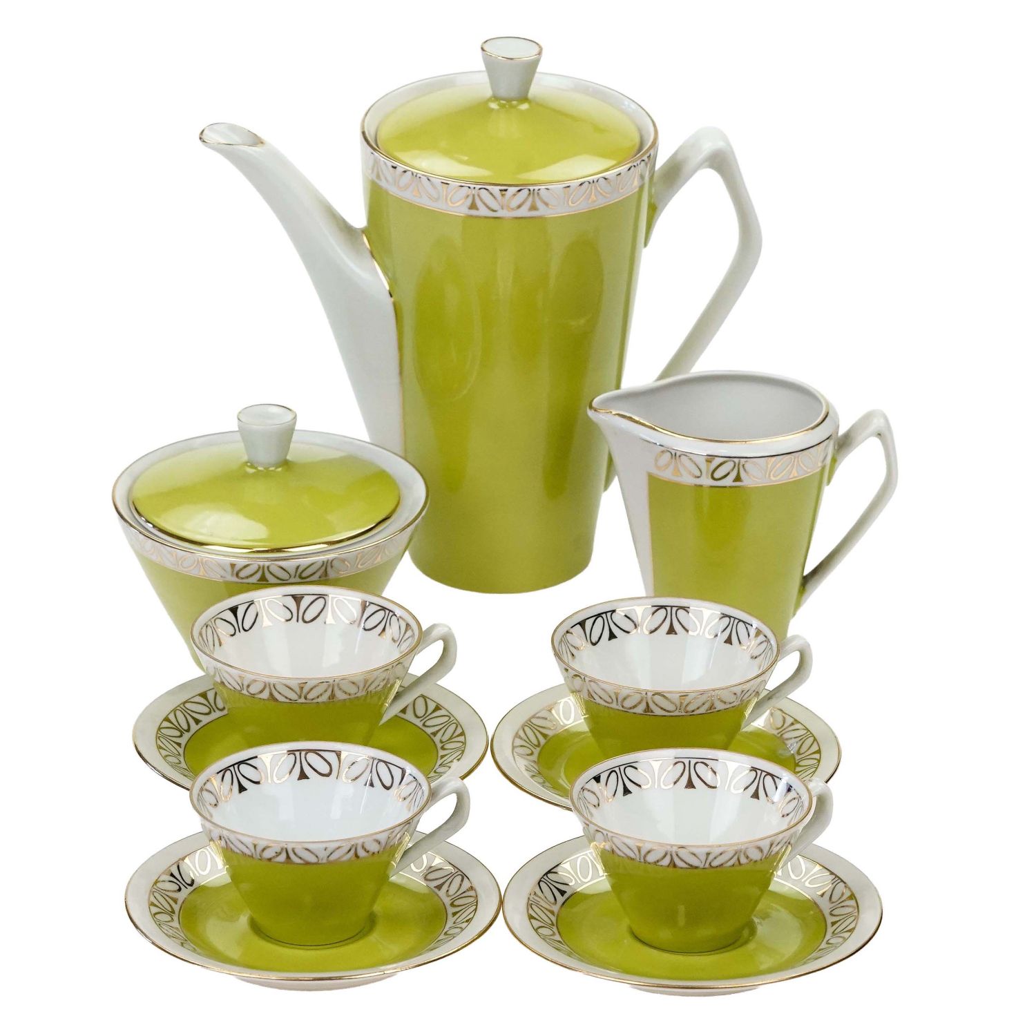 Serwis do kawy, przykład Polskiego New Looku, składający się z dzbanka do kawy, dzbanuszka do śmietanki i cukiernicy oraz czterech filiżanek ze spodkami.